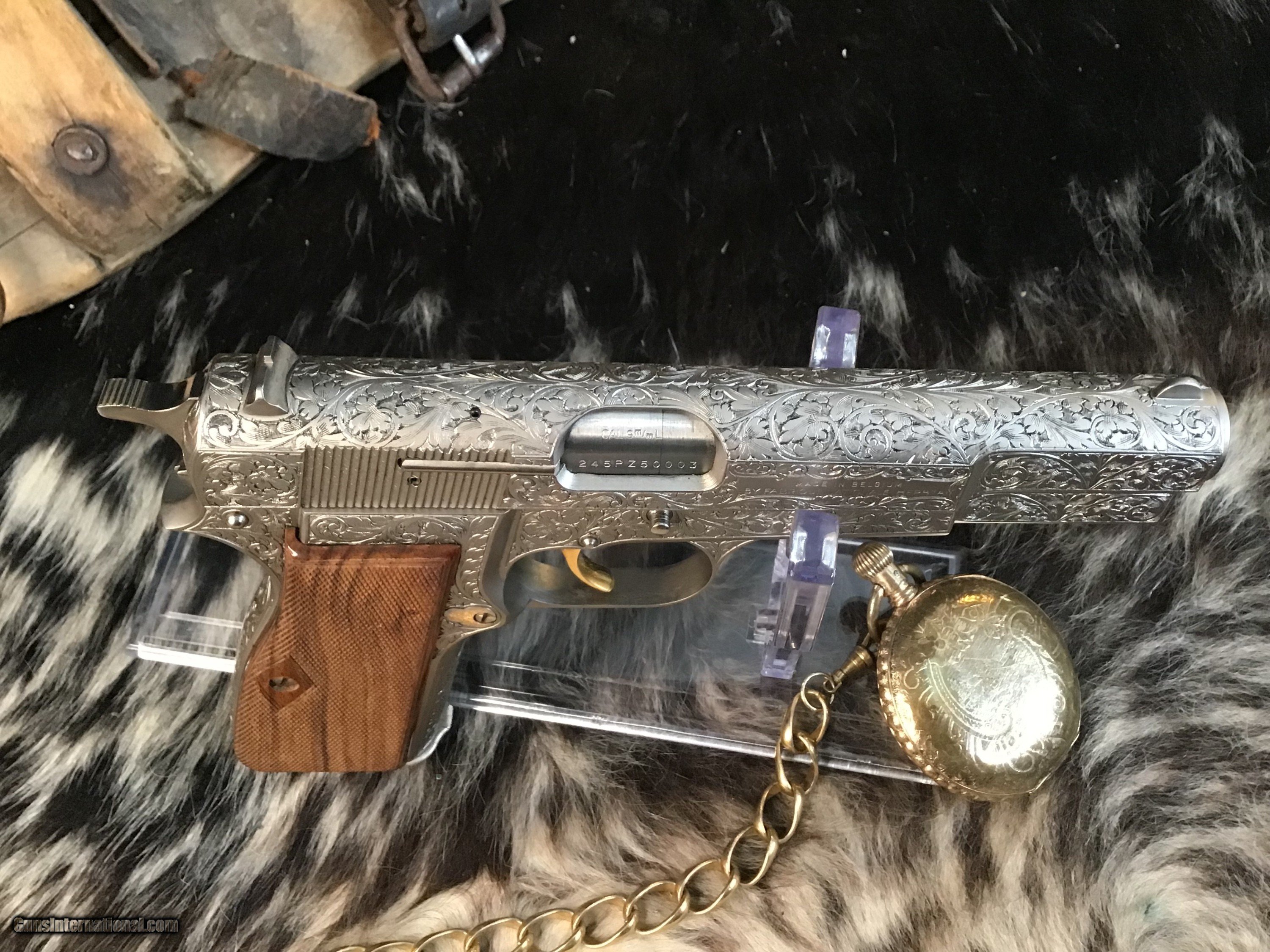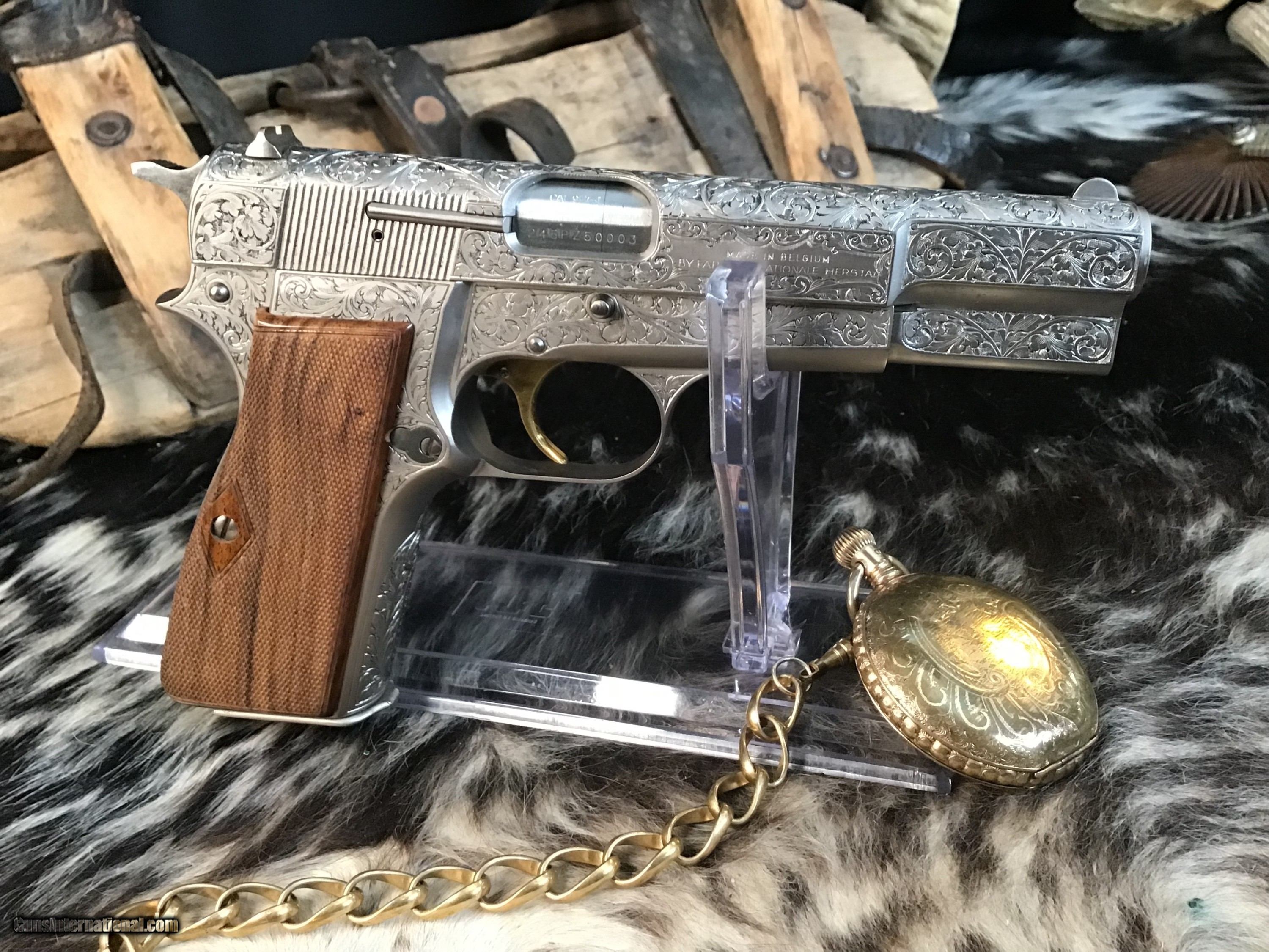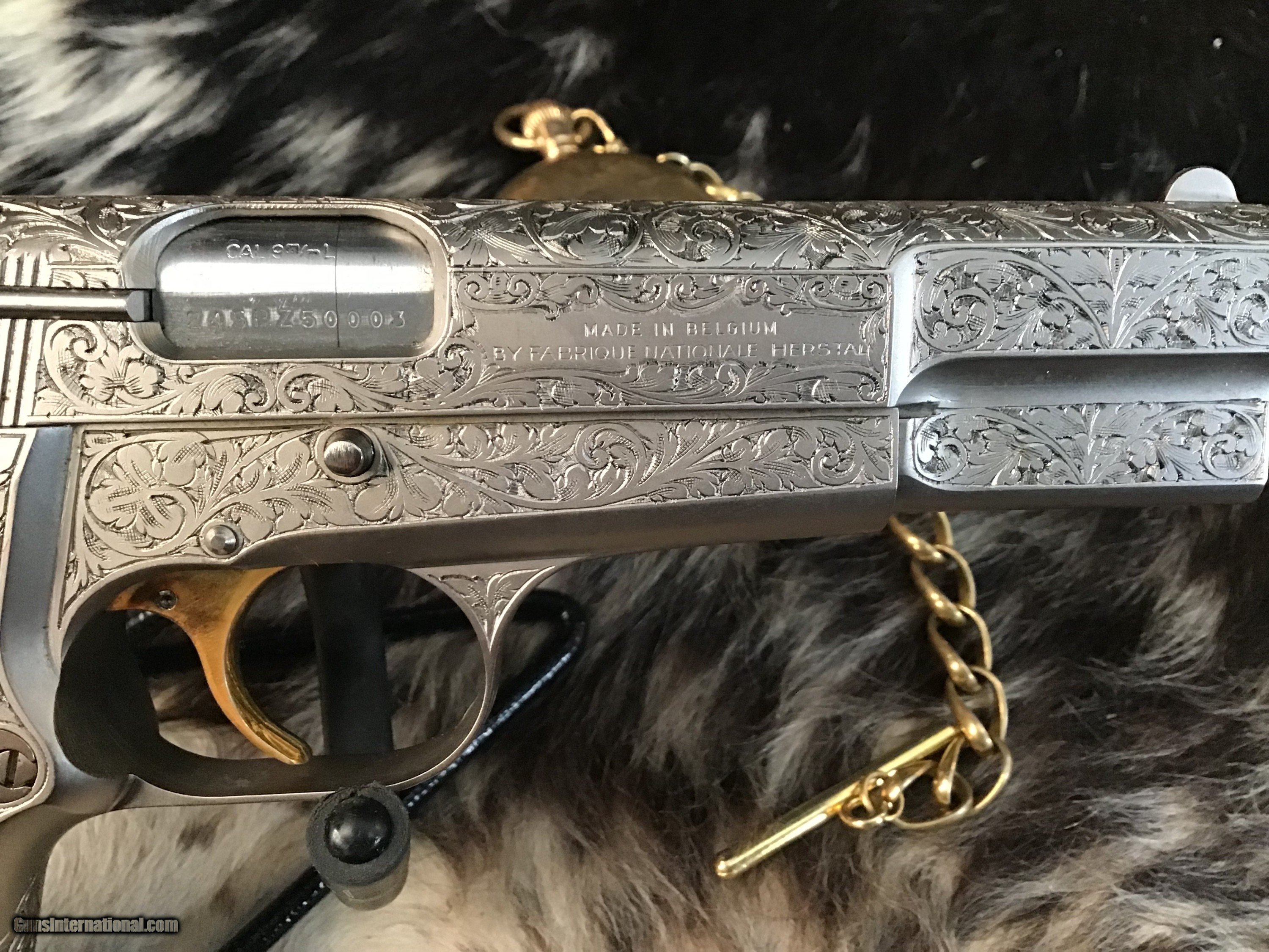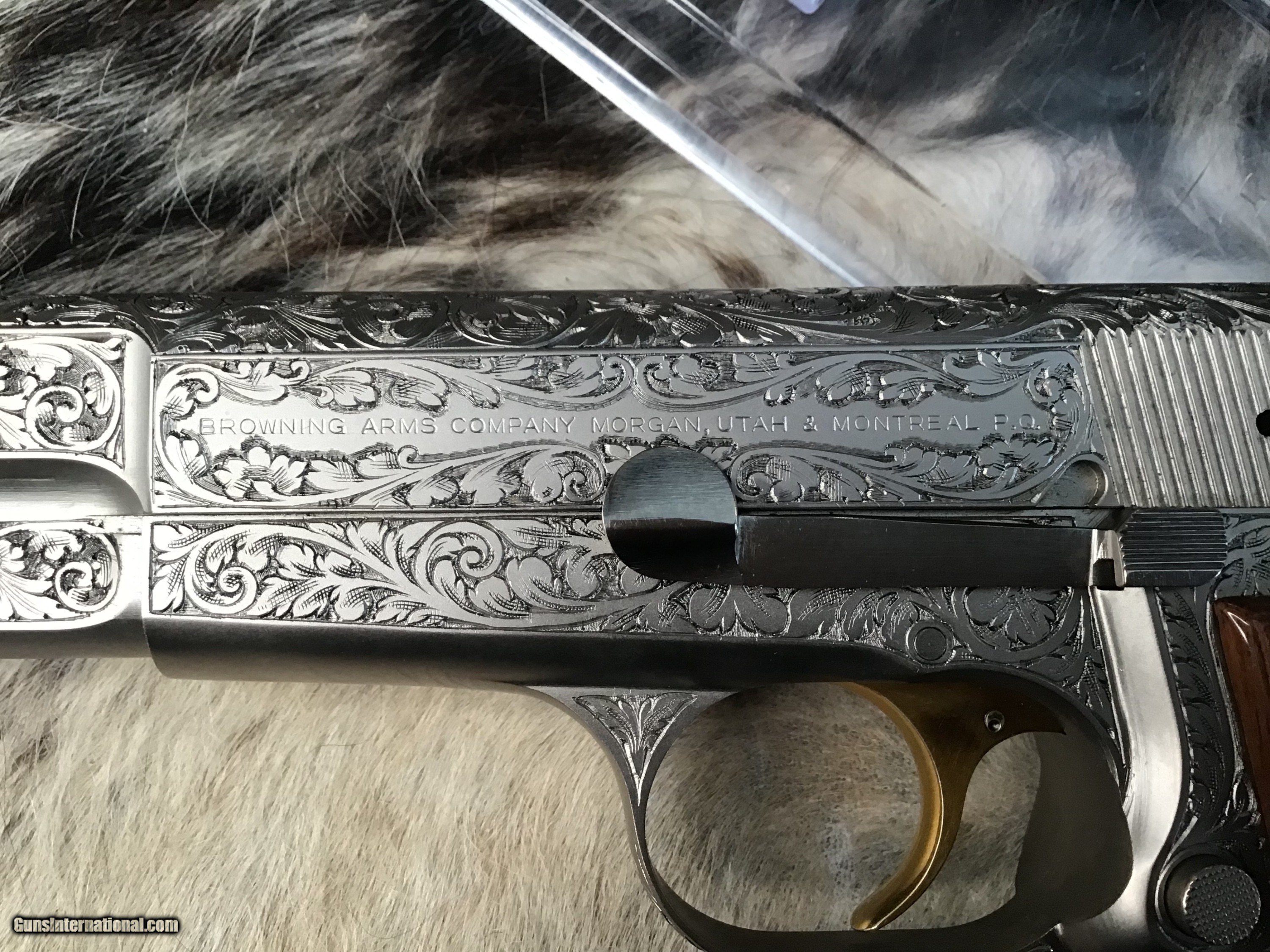 1981 Mfg. Belgium Browning factory Renaissance engraved Hi-Power 9mm pistol. Pistol appears unfired and in excellent original condition. Likely the most ornately engraved handgun crafted by a factory. Detail in engraving is excellent, something to behold in your hand.