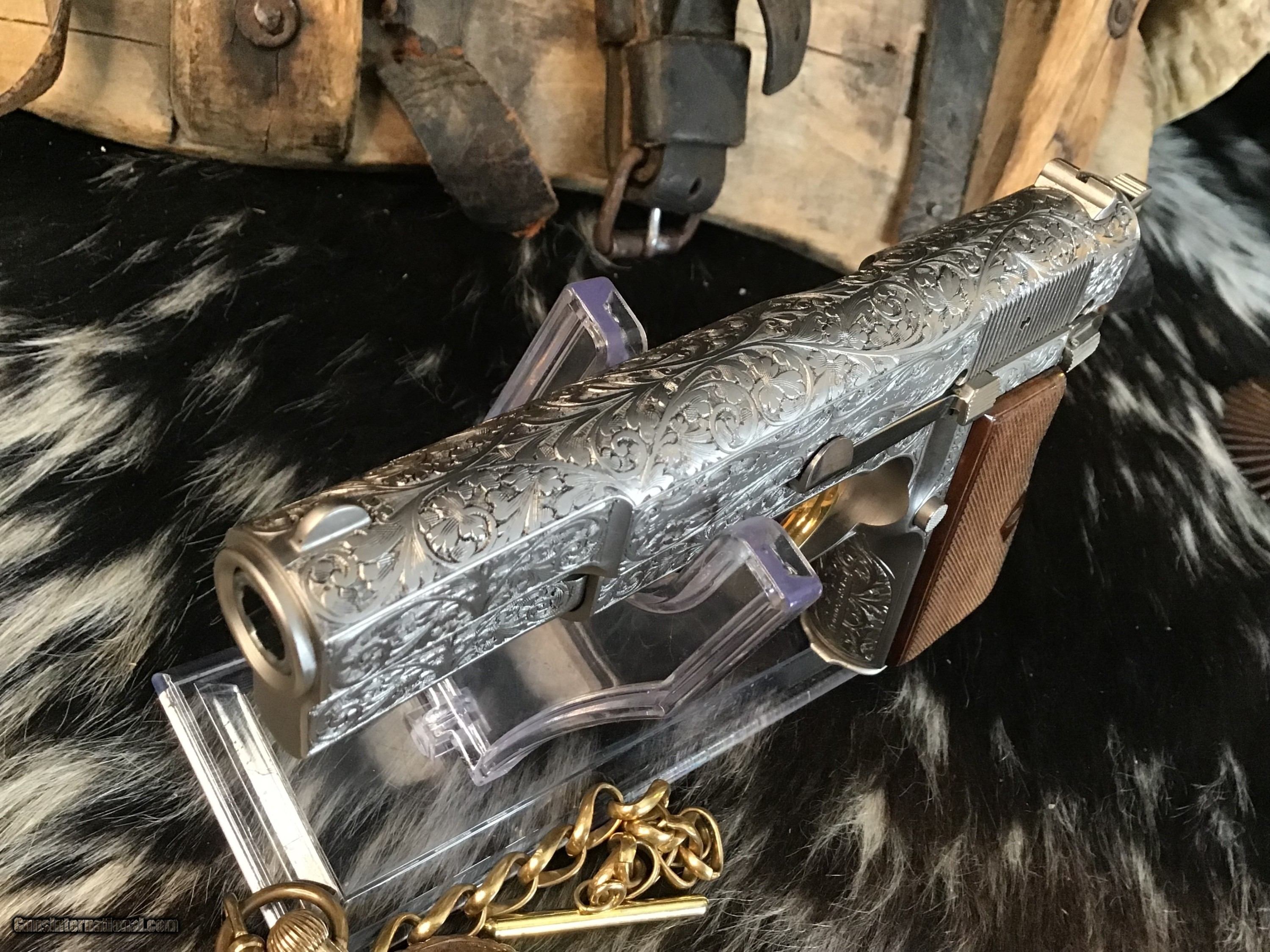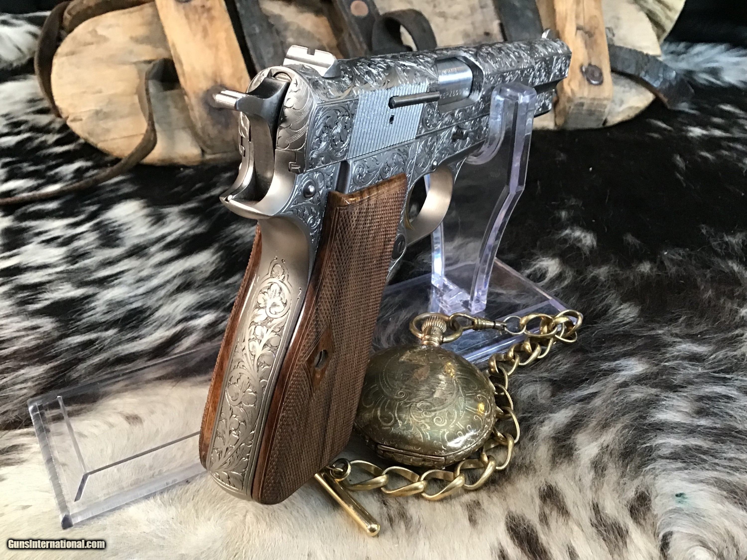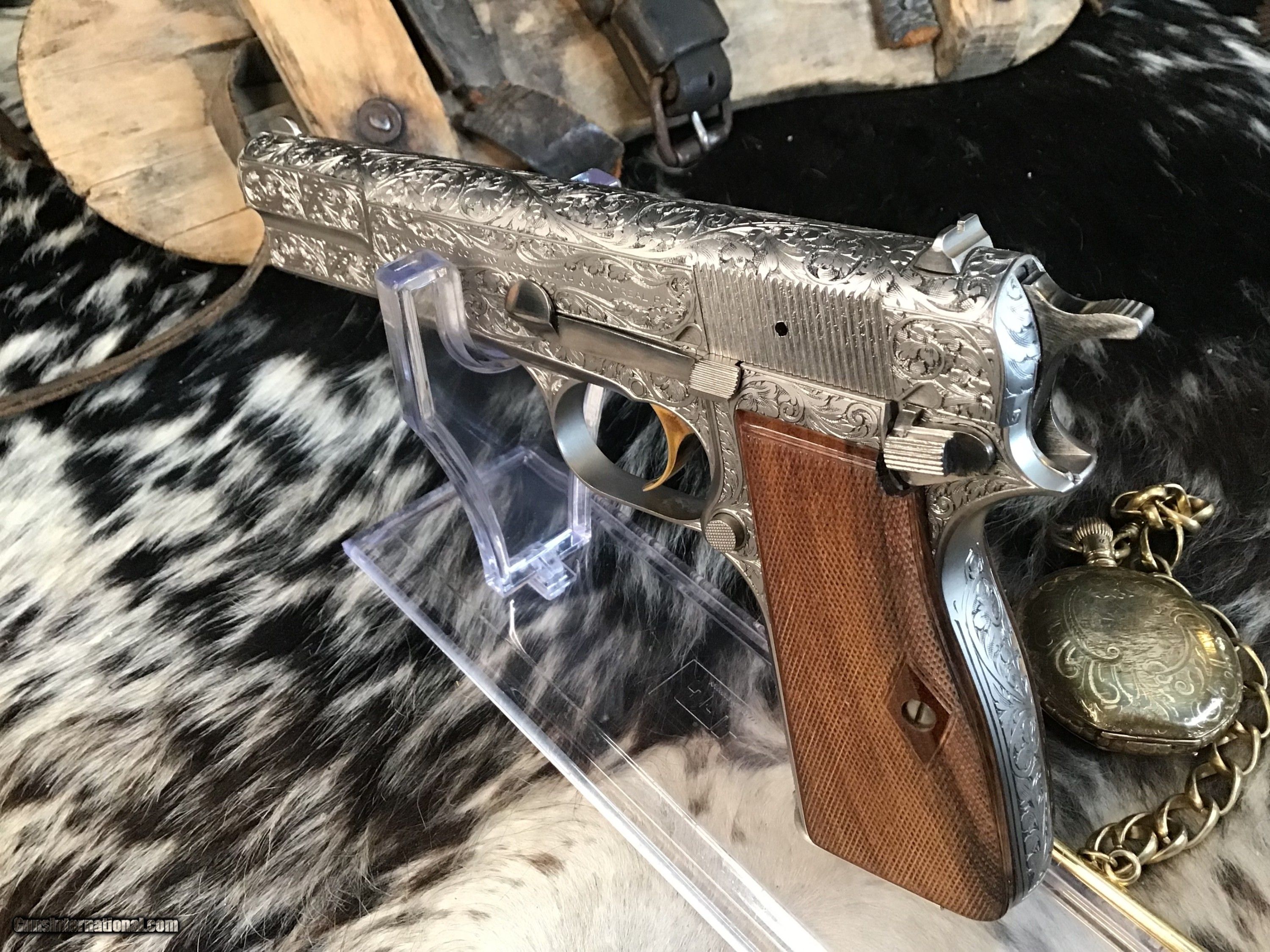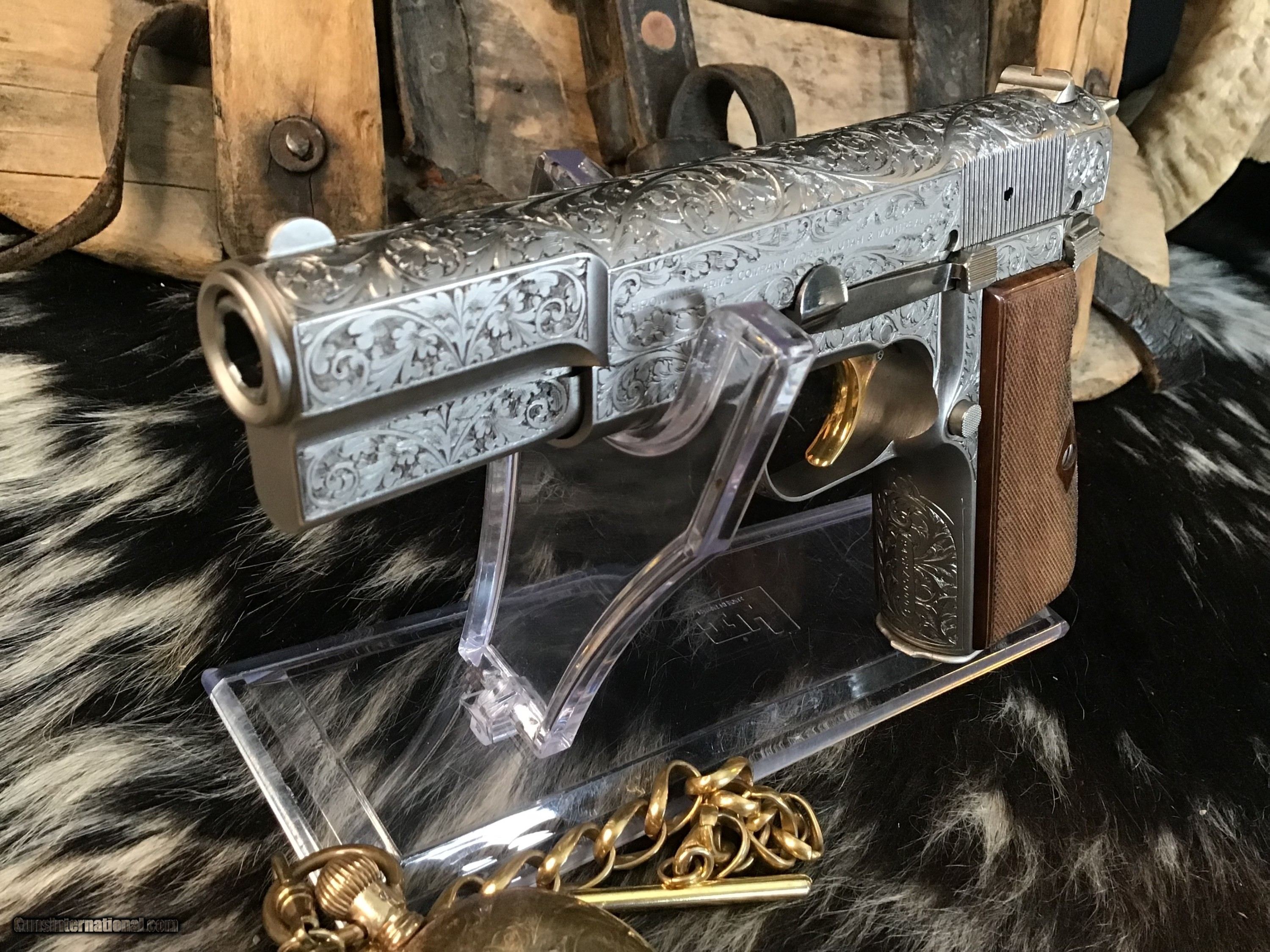 1981 Mfg. Belgium Browning factory Renaissance engraved Hi-Power 9mm pistol. Pistol appears unfired and in excellent original condition. Likely the most ornately engraved handgun crafted by a factory. Detail in engraving is excellent, something to behold in your hand.