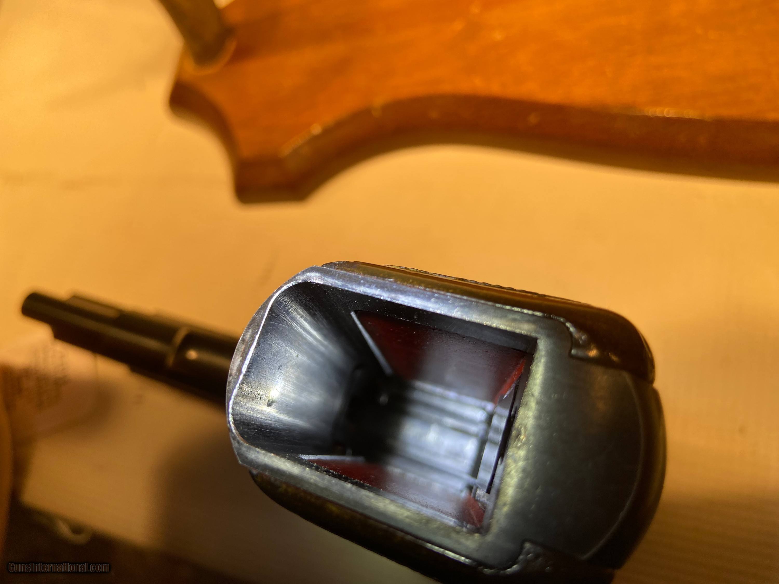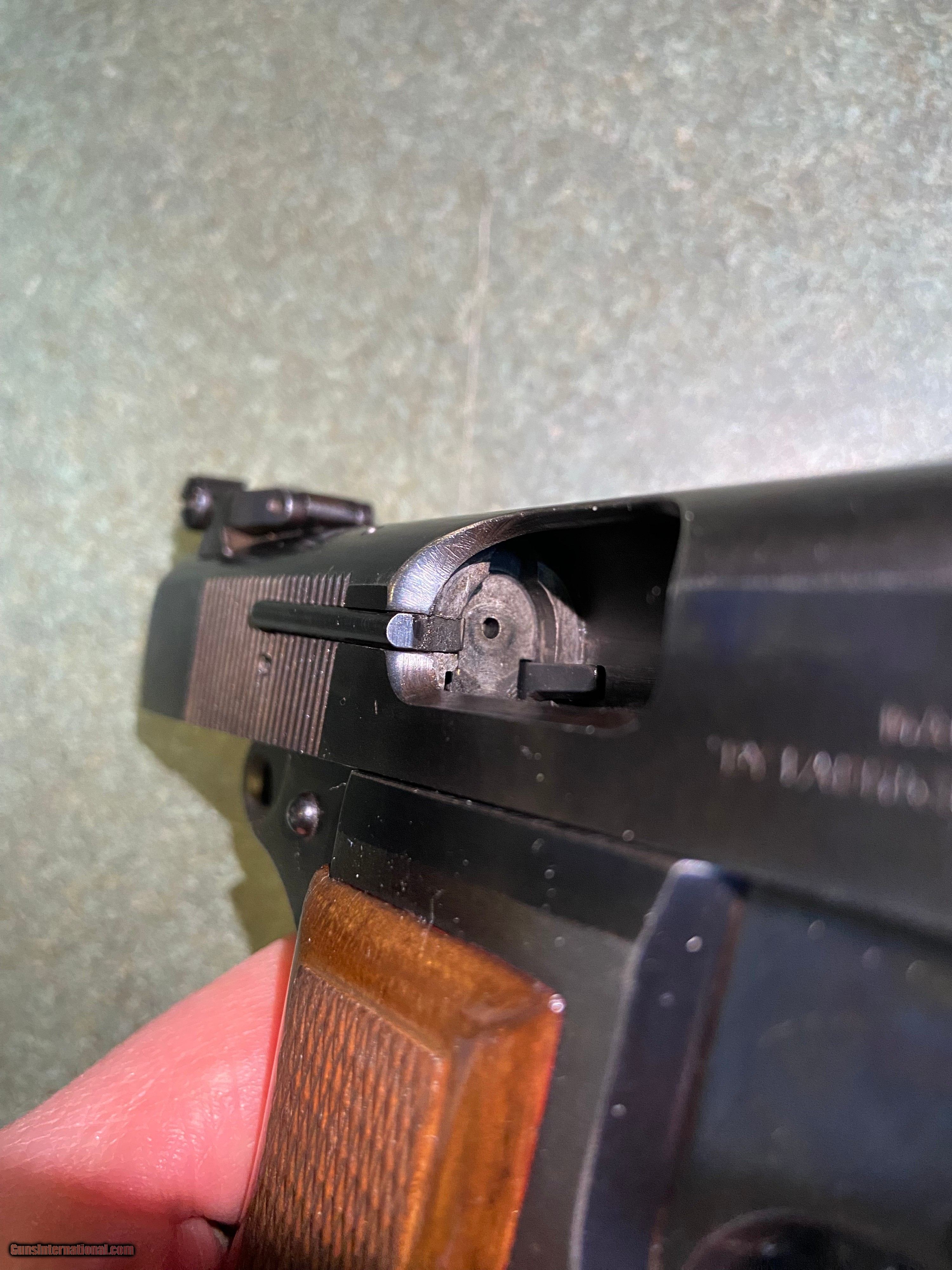 Description: Here we have a Belgium Browning Hi-Power Standard 9mm with a Lateral Adjustable Rear Sight, Fixed Front Sight, Rounded Ring Hammer, External Extractor and a Polished Blued Finish. The barrel is 4 5/8" and was manufactured 1964-1970. The overall condition is in 80% +/- and the bore is in 90% +/- condition. The adjustable sight, ring hammer and external extractors are more sought after. Agreat gun to have and it also comes with the original magazine and two spare mags! ALL SALES ARE FINAL. PLEASE CALL WITH QUESTIONS BEFORE PURCHASING. SOLD Handgun Caliber: 9x19mm Parabellum (9mm Luger, 9x19mm NATO) Manufacturer: Browning Model: Belgium Hi-Power Standard Serial Number: 245PZ57067 Barrel Length: 4 5/8 Condition: 80% +/- Bore Condition: 90% +/- Action: Single |
