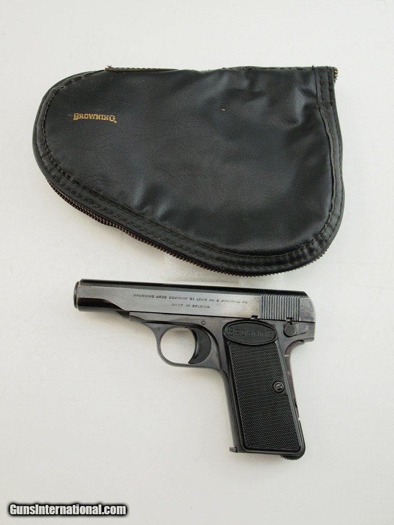 Description: Browning 1955 .380 With Soft Case, 3 1/2" bbl, shiny bore, good rifling, notch rear sight, blade front sight, blued finish, one 6 round magazine, and very nice Browning checkered grips. Add 3% for Credit Card Shipping $25.00 SOLD |