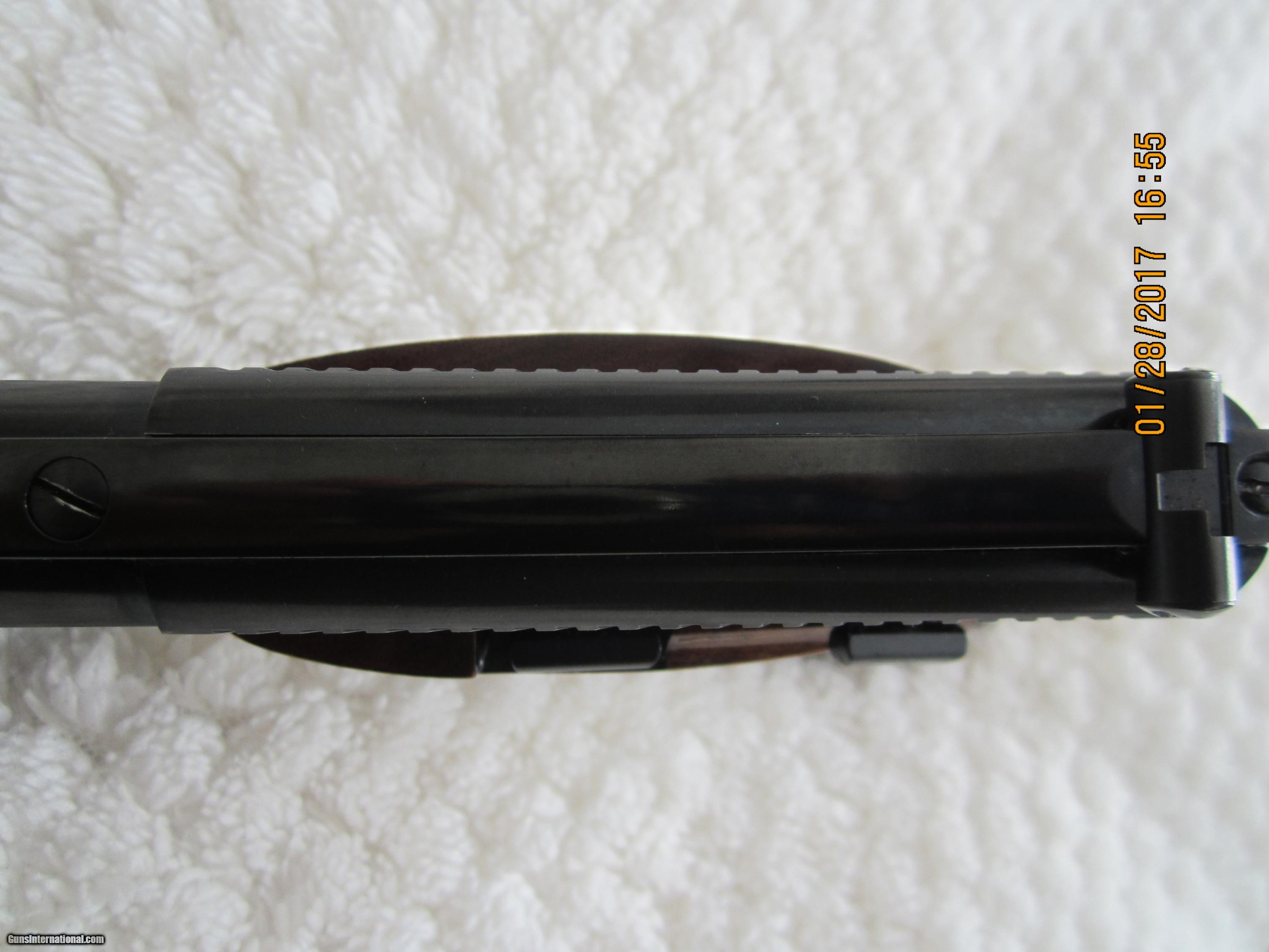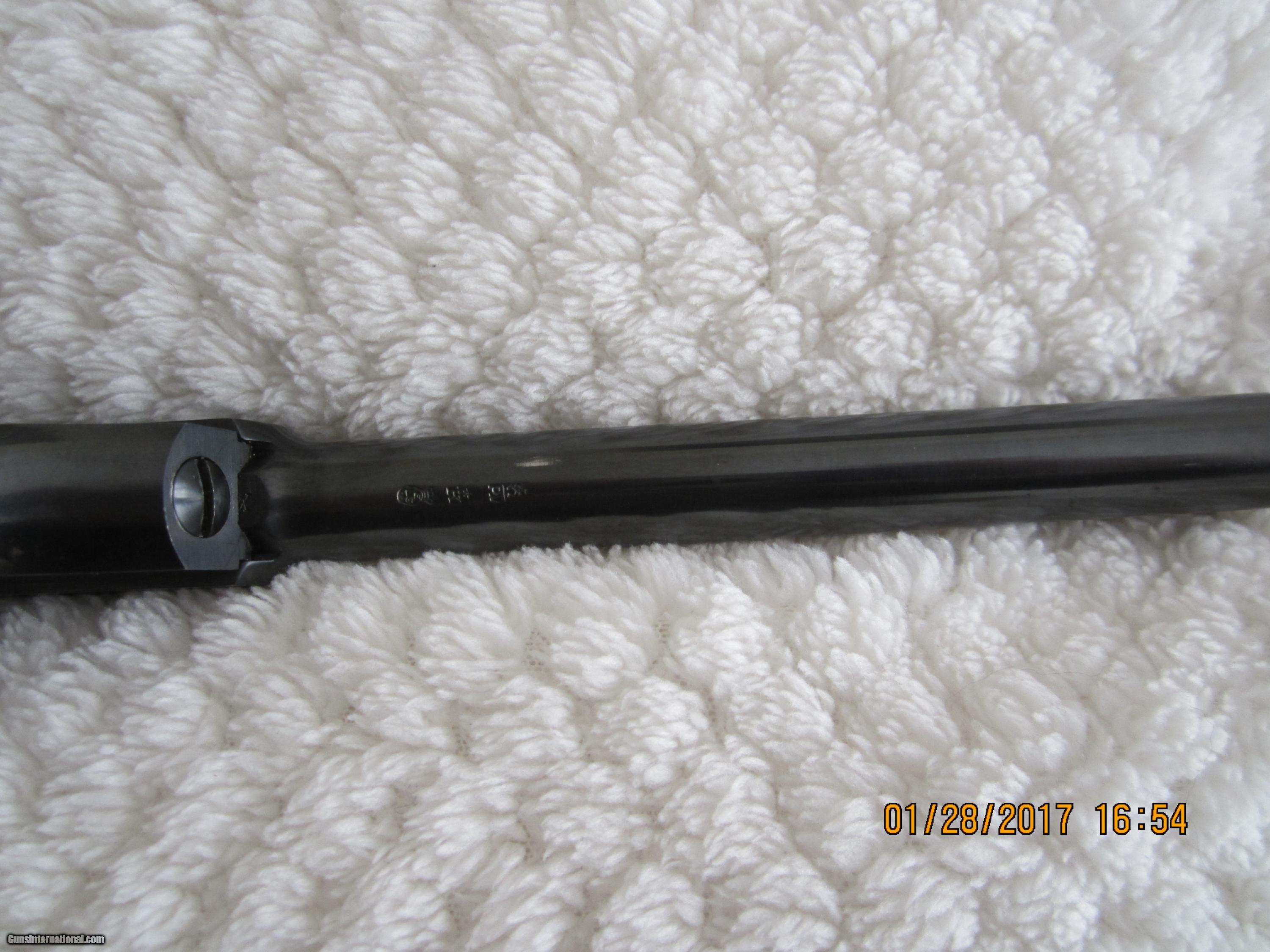 Description: A beauty showing all the quality Browning is known for. Made in 1963 and in Excellent condition.The trigger is gold plated. It comes with the factory original plastic box containing the FN Seal, a 2nd 4 & 1/2" barrel ( a 6" barrel is attached to the gun) and a 2nd magazine. Both magazines are marked ".22 LR Browning". The case and all extra parts are all also in excellent condition. The bore is as new. The rear sights are adjustable. The checkered wrap around grips are in a nice dark grained walnut wood. These sets are not often available. Note: The pictures seem to show finger marks on the blue parts. There are no such marks on the gun. SOLD Manufacturer: Fabrique National for Browning Model: Challenger Serial Number: 30297U3 Caliber Info: .22 LR Bore: rifled Condition: Excellent Metal Condition: 96%+ Wood Condition: 98% Bore Condition: as new Barrels: one Barrel Type: round Action: semi-automatic Triggers: one-gold plated Stock: Walnut Finish: Blued Sights: front & rear Manufacture Date: 1963 Engraving: no Case: yes Item Location: California |