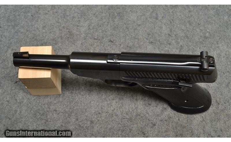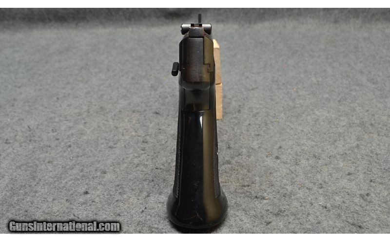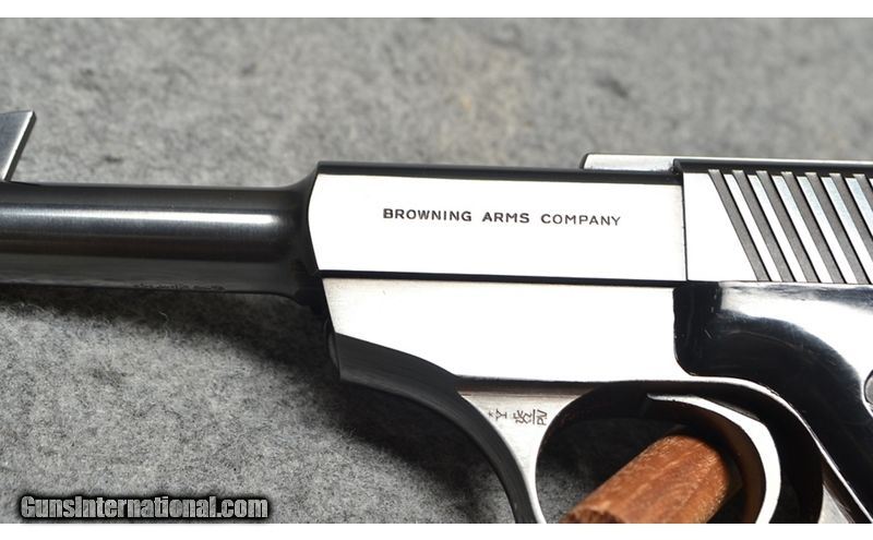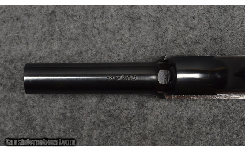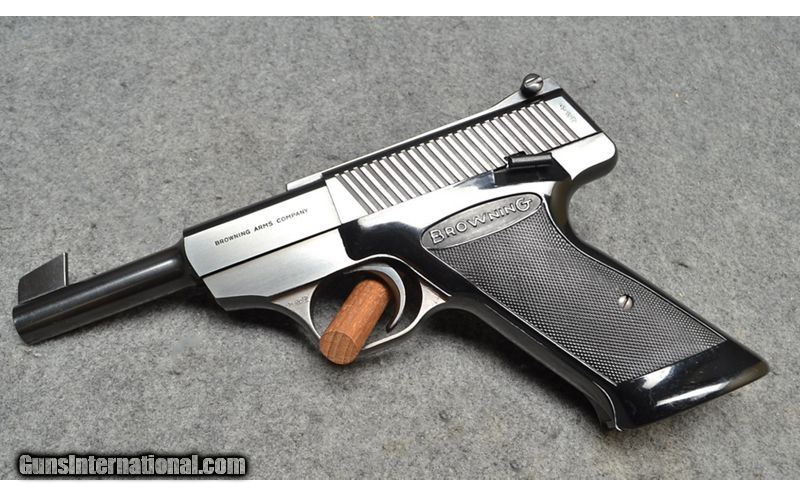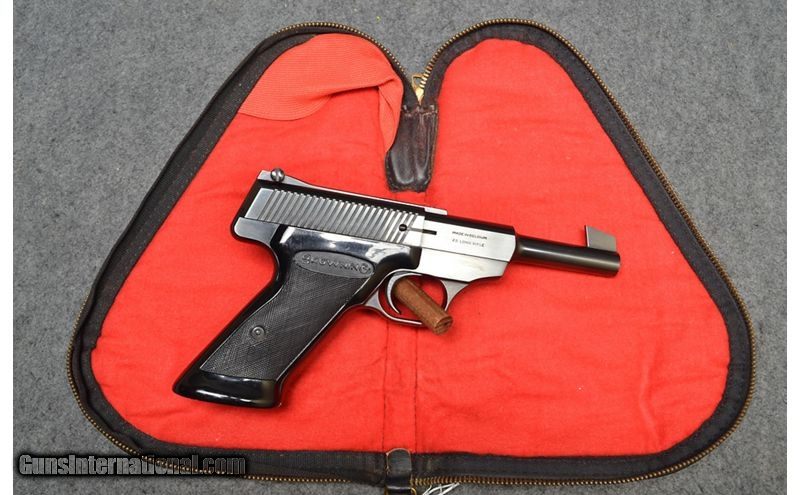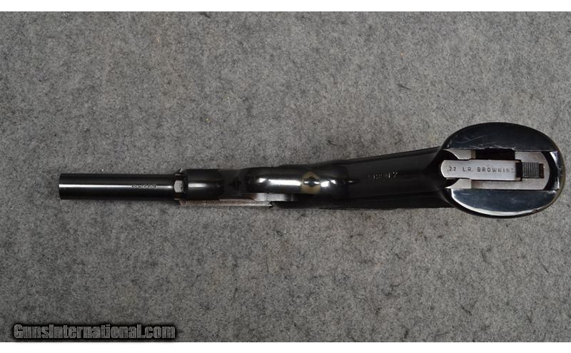 Description: This semi-auto rimfire pistol is a Browning Nomad chambered in .22 Long Rifle. It has an undercut front Patridge sight and a rectangular adjustable rear sight, a left side thumb safety, and original Browning plastic flared grips. It is in superb condition overall with a high gloss bluing finish. Manufactured in Belgium in 1967. It comes with the original leather Browning zippered pouch. .22 Long Rifle SOLD Curio/Relic: Yes Chambers: 10 Round magazine Metal Condition: Bluing in near perfect condition Wood Condition: Original Browning plastic grips Bore Condition: Bright and shiny with crisp rifling Barrels: 4½ inch barrel Stock Dimensions: Overall length 9½ inches Butt Pad: Grips are flared at the bottom for a secure hand fit Weight: 2 lb Sights: Patridge and notch open sights Item Location: Wichita, KS |