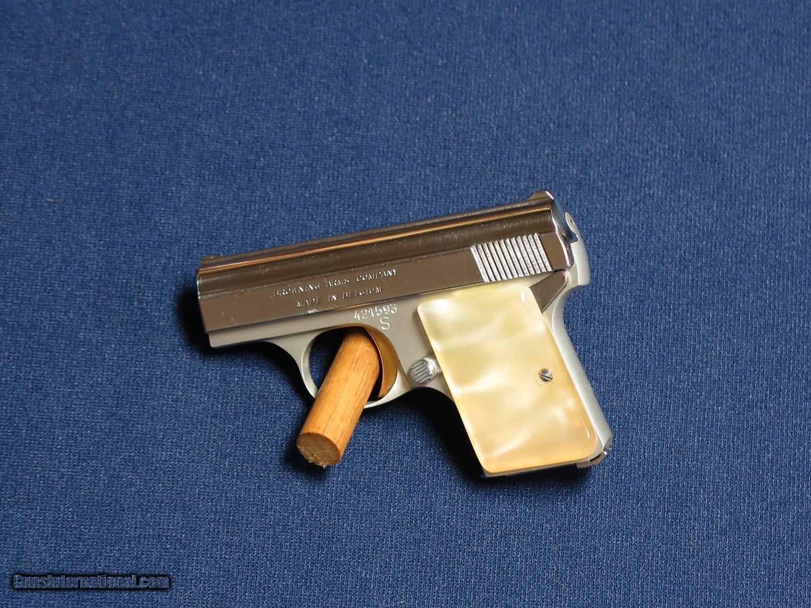 Description: Browning Baby Lightweight 25 ACP. Made in Belgium. Correct nickel magazine. Excellent condition. SN 421,XXX. SOLD |