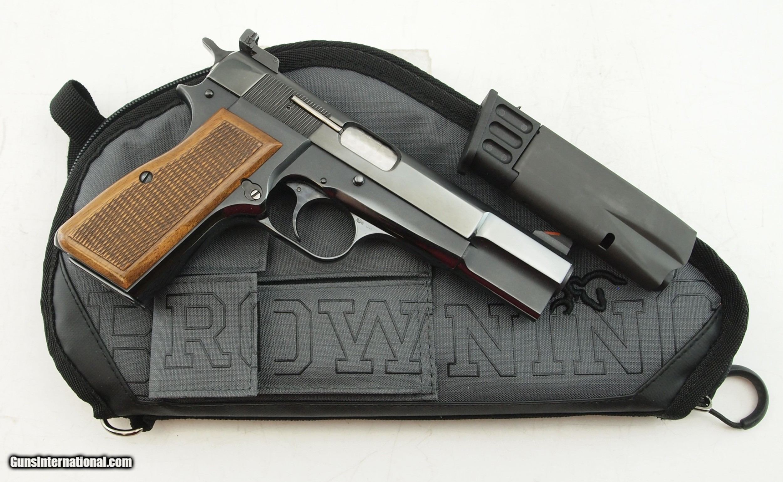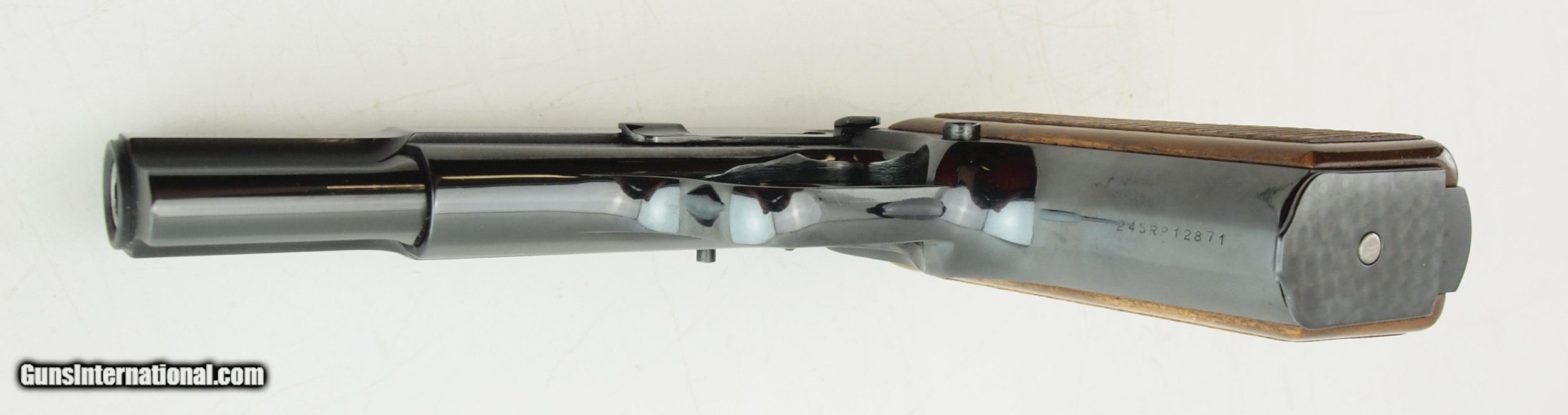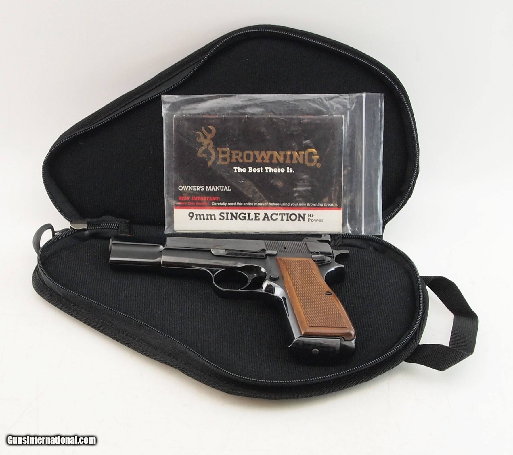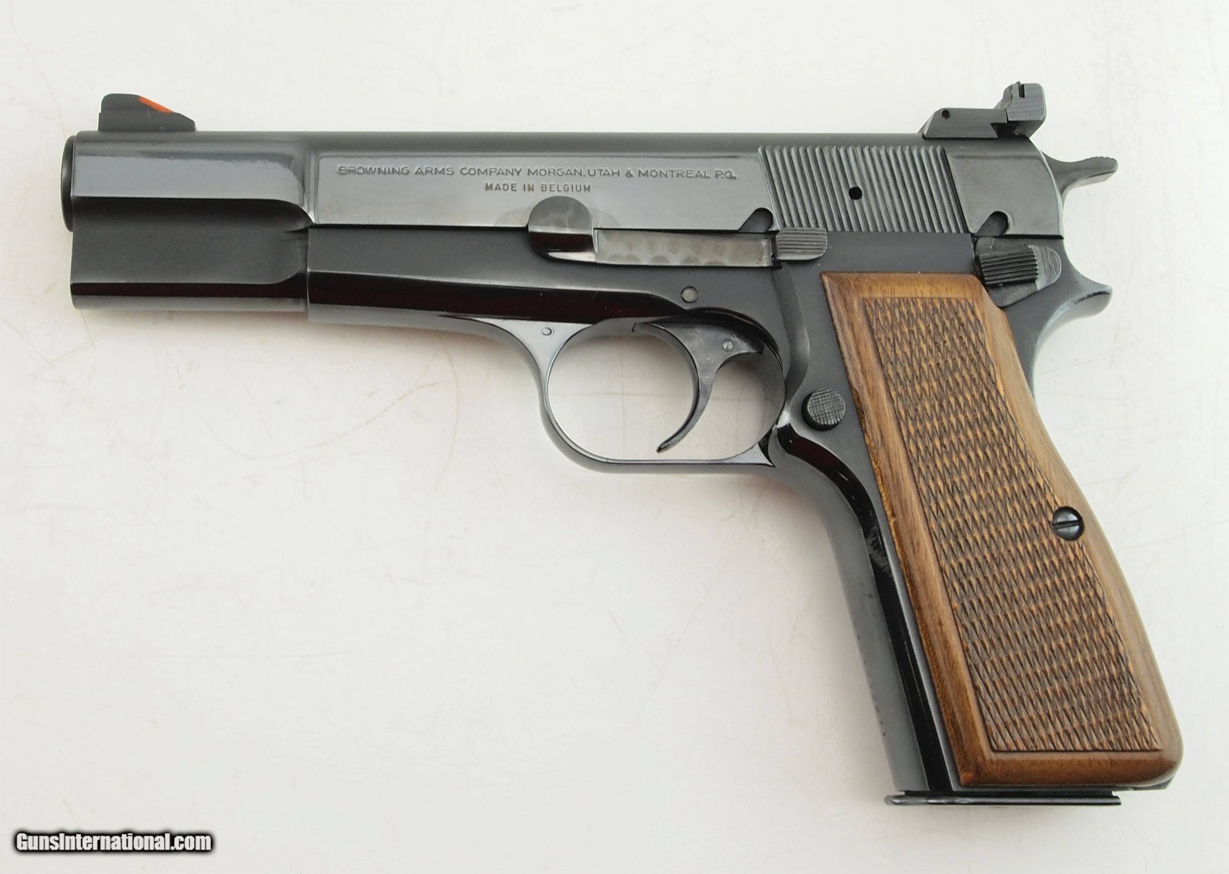 Description: Beautiful Browning Belgium Hi Power 9X19 WPouch, 4 5/8" bbl, shiny bore, good rifling, blued finish, dovetail rear sight, blade front sight, has been professionally refinished to include jewelled bolt - trigger - hammer - slide release, owner's manual, one factory 13 round mag with jeweled bse plate, one aftermarket 10 round mag, and very nice checkered wood grips. Very clean! Add 3% for Credit Card Shipping $25.00 SOLD |