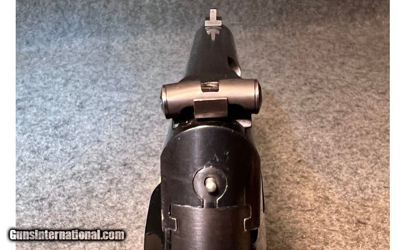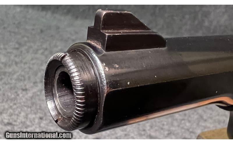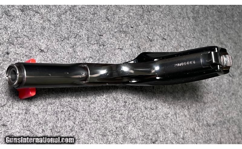 Description: This 1971 semi-automatic pistol is a Browning Belgium Model 10/71 chambered in .380 ACP. It has a serrated ramp fixed front sight, an adjustable square notch rear sight, a serrated trigger, a grip safety, black hard plastic grip panels with left side thumb rest, and a magazine grip extension. The FN/Browning Model 10/71 was a modified version of the Model 1922 and was sold from 1970 to 1974 as the Browning "Standard .380" and by FN as the Model 125. This model was only manufactured from 1970 to 1974. The high gloss blued finish is in good condition, with some noticeable loss at muzzle and on sharp edges. The grip panels are in good condition with some light handling wear overall. .380 ACP SOLD Metal Condition: "High gloss blued finish is in good condition, with some noticeable loss at muzzle and on sharp edges Wood Condition: Grip panels are in good condition with some light handling wear overall Barrels: 4½" barrel Triggers: Serrated trigger Stock Dimensions: Overall length 7¼ Butt Pad: Black hard plastic grip panels with left side thumb rest Weight: 1 LB 7 OZ Sights: "Serrated ramp fixed front sight, adjustable square notch rear sight Item Location: Wichita, KS |