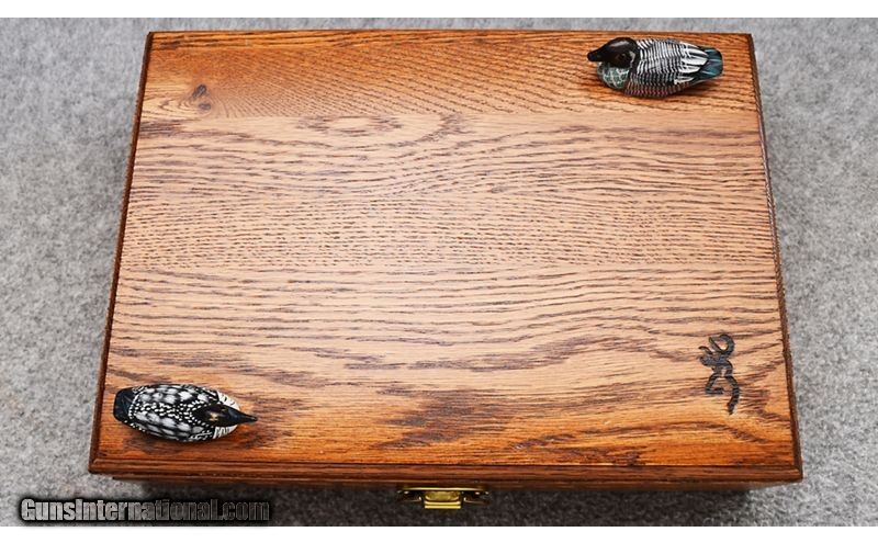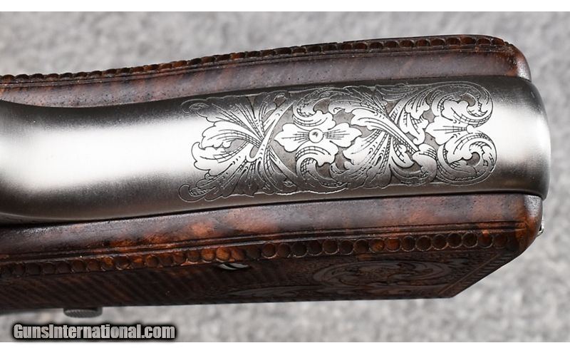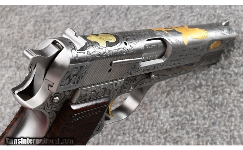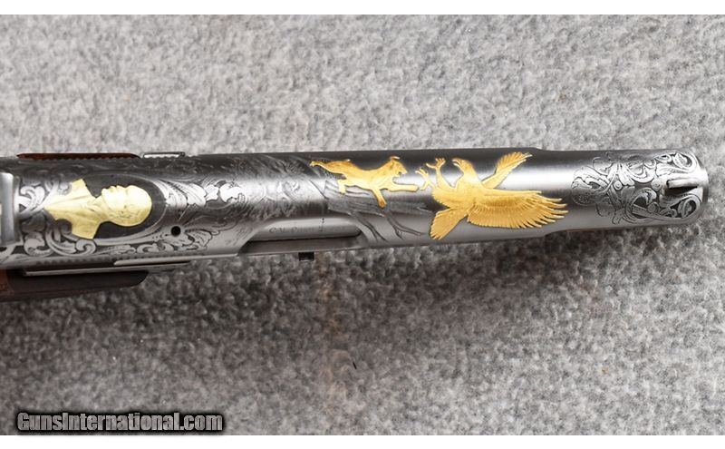 Description: This Browning Gold Classic Hi-Power was manufactured from 1984 to 1986 by Fabrique Nationale Herstal. With only a quantity of only 500 made this particular gun is Number "127 of 500" and remains in excellent condition appearing unfired. Gorgeous gold inlays with checkered and carved walnut grips make this an elegant addition to any collection. Complete with wooden display case with Browning insignia. Signed by J. Pirotte. Has dried cosmoline in chamber and inside of slide. Beautiful gun! 9mm Luger SOLD Metal Condition: Excellent Wood Condition: Excellent Bore Condition: Excellent Barrels: 4 3/4 Triggers: Factory Weight: 32 oz. Sights: Blade Front - Integral Notch Rear Item Location: Wheeling |