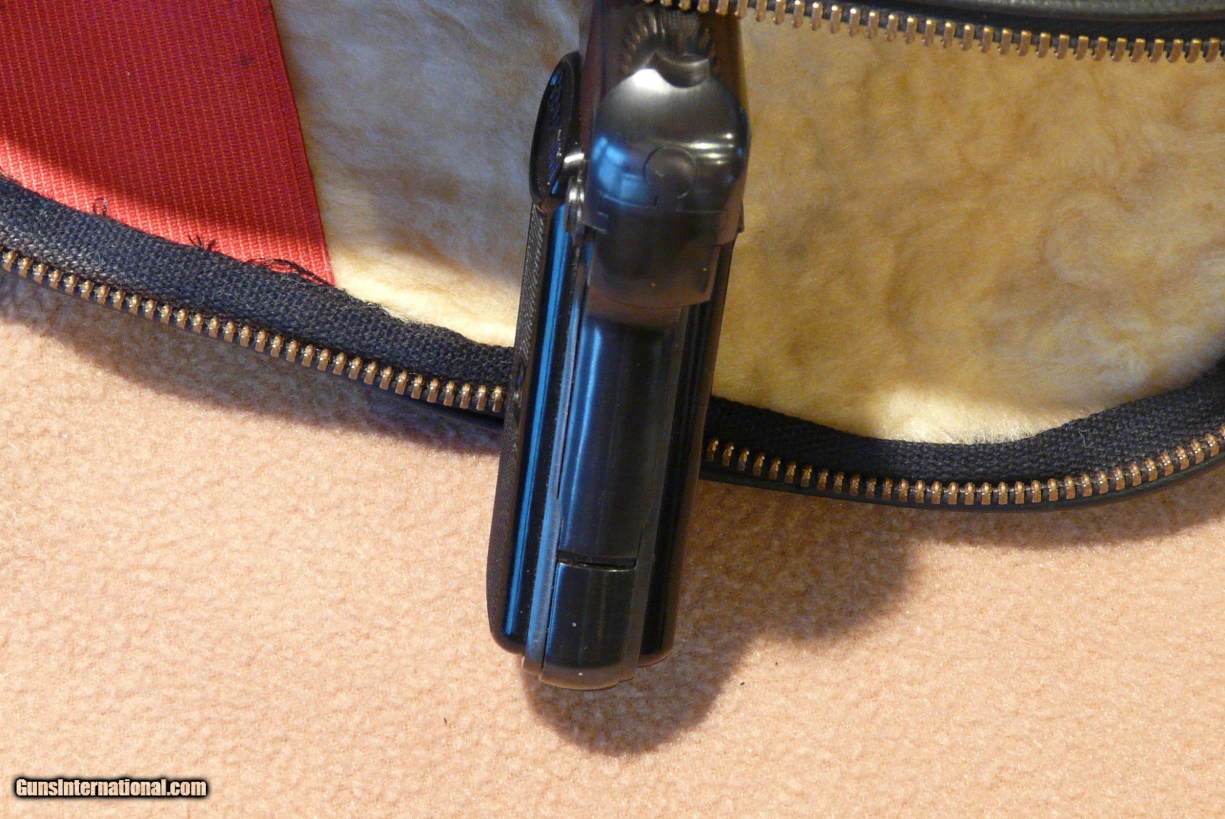 Description: Browning model 1910 -55 380, gun is 99.% with 2 - 7 shot magazines with finger lip at bottom, only tiny bit of blue wear at very end of muzzle !! Bore perfect used very little and not carried in holster obviously, This gun made in Belgium ! Comes with Wool lined original Browning Pouch with Gold zipper, and a Nice Booklet for the Hi Power and the 380 auto also, for using or collecting. SOLD |