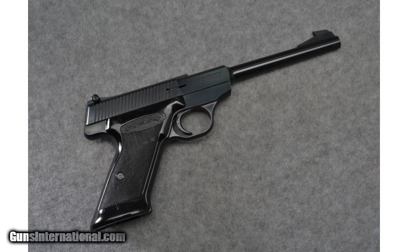 Description: A nice Browning Nomad semi auto pistol in .22 LR. This Browning was made in Belgium in 1973. It has a 6 3/4 inch barrel and black target sights. The bluing is nice with only a few light handling marks and the original grips are very good. The P in the serial number makes this a Nomad. It comes with one magazine. SOLD Manufacturer: 1973 made in Belgium Caliber Info: .22 LR Chambers: Semi auto. Metal Condition: Very good with light handing marks. Wood Condition: Very good grips. Bore Condition: Shiny and bright. Barrels: 6 3/4 inch. Triggers: Single - blued. Stock: Browning black plastic grips with checkering. Weight: 32 Oz. Sights: Front post and adjustable rear black target sights. Item Location: Woodbury, MN |