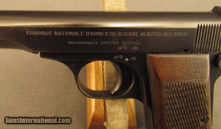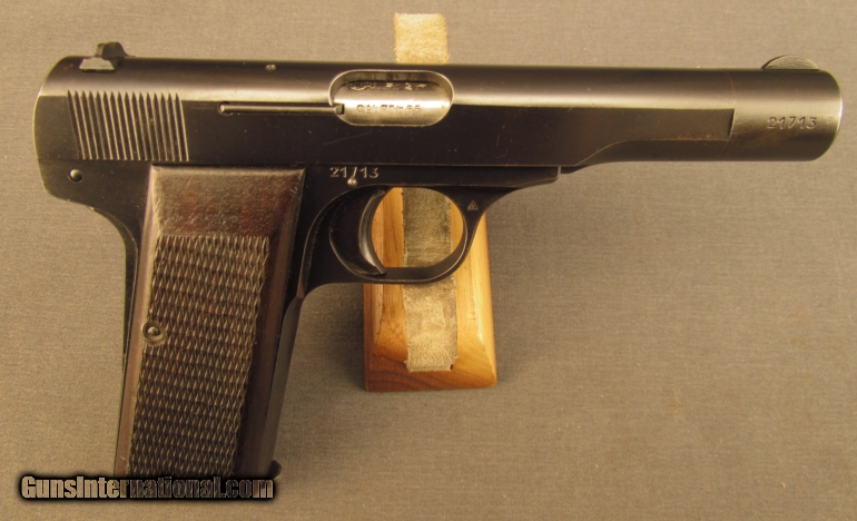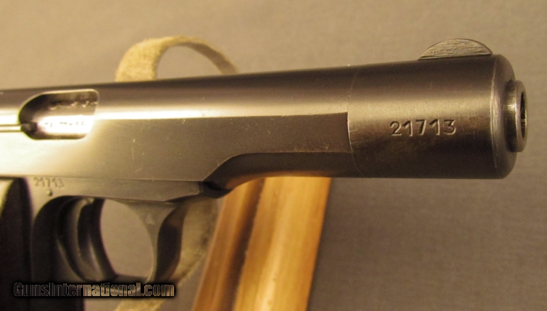 Description: Serial #21713, .32 ACP, 4 1/4? barrel with an excellent, bright bore. This handsome pistol has matching numbers on the frame, slide (interior), and muzzle cap with the metal retaining 97-98% of the original blue finish that has silvered slightly along the projecting edges and bearing surfaces. Standard Belgian proof stamps are present on the left side of the slide and frame and there is some mild silvering present at the muzzle. The checkered wooden grips are in excellent shape having only some negligible minor handling marks and surface blemishes on both panels. The pistol comes with a single ?FN/7.65mm? marked magazine and is an excellent pre-war example of these desirable Browning pistols. FFL or C&R SOLD Curio/Relic: Yes Manufacturer: Browning Model: 1922 Serial Number: 21713 Caliber Info: .32ACP Gauge Info: .32ACP |