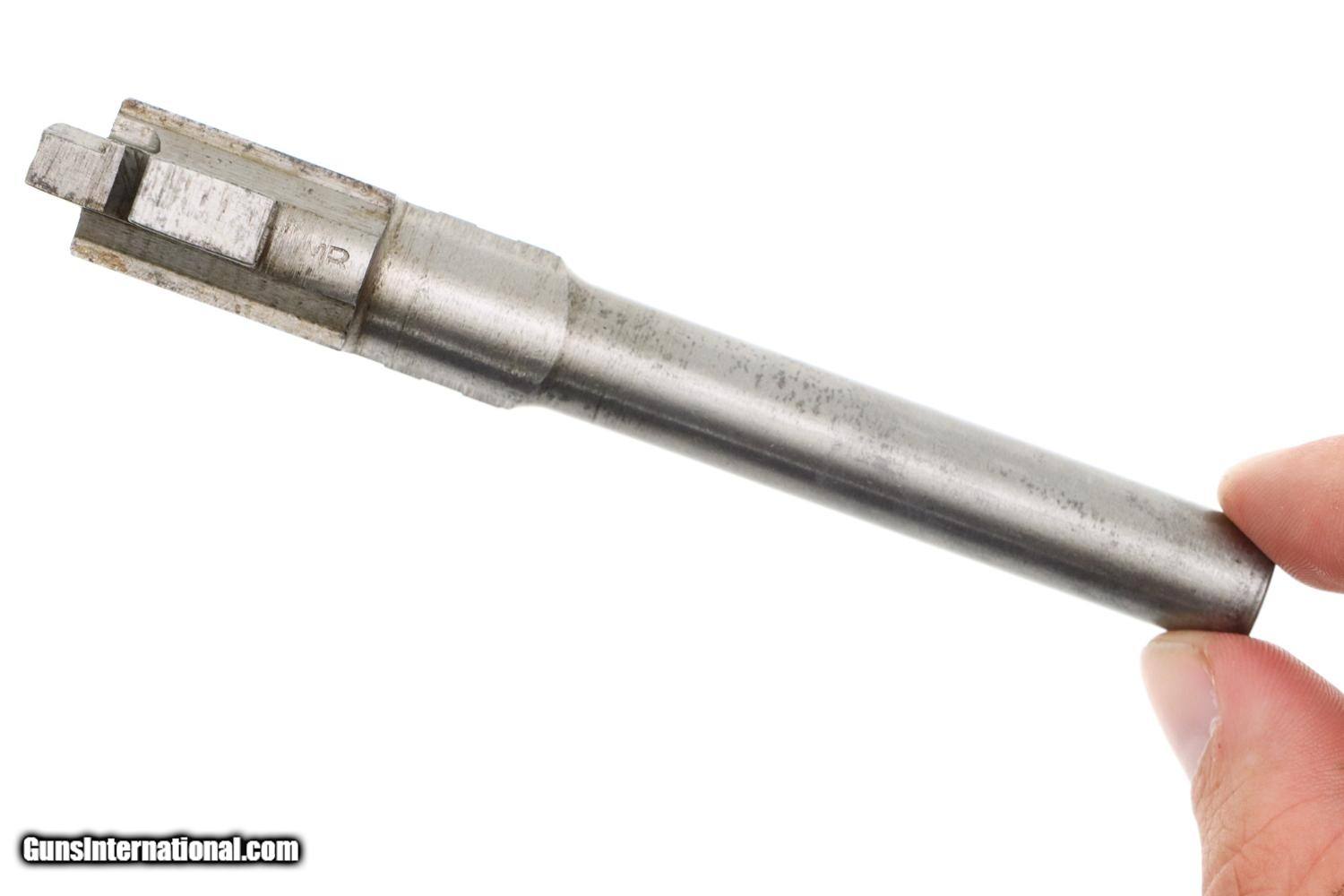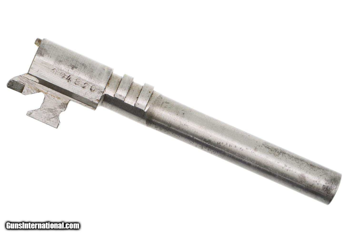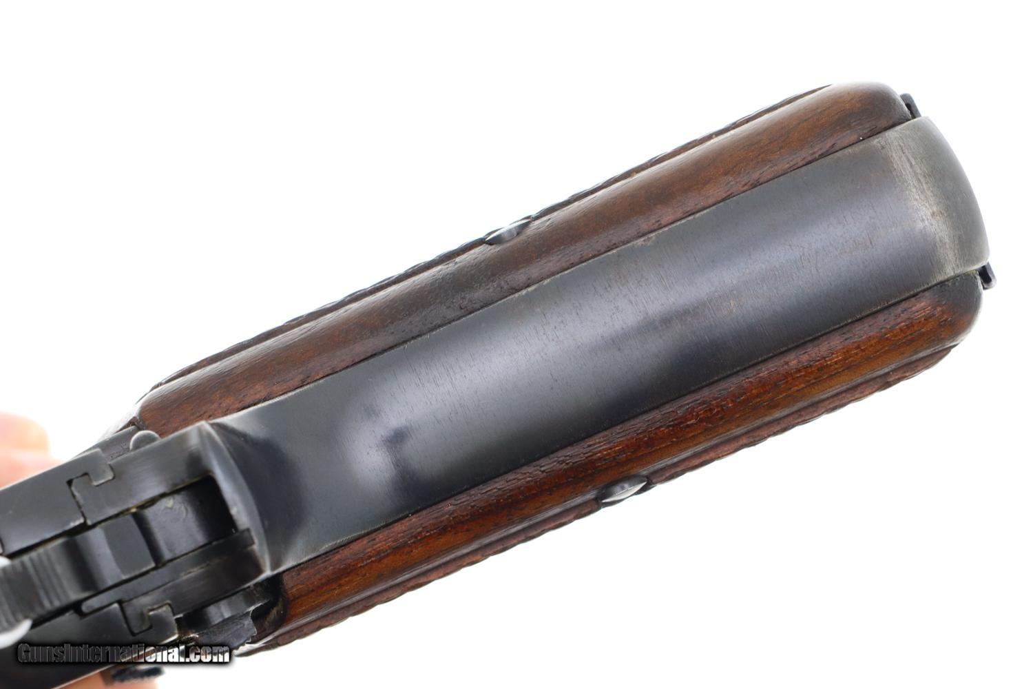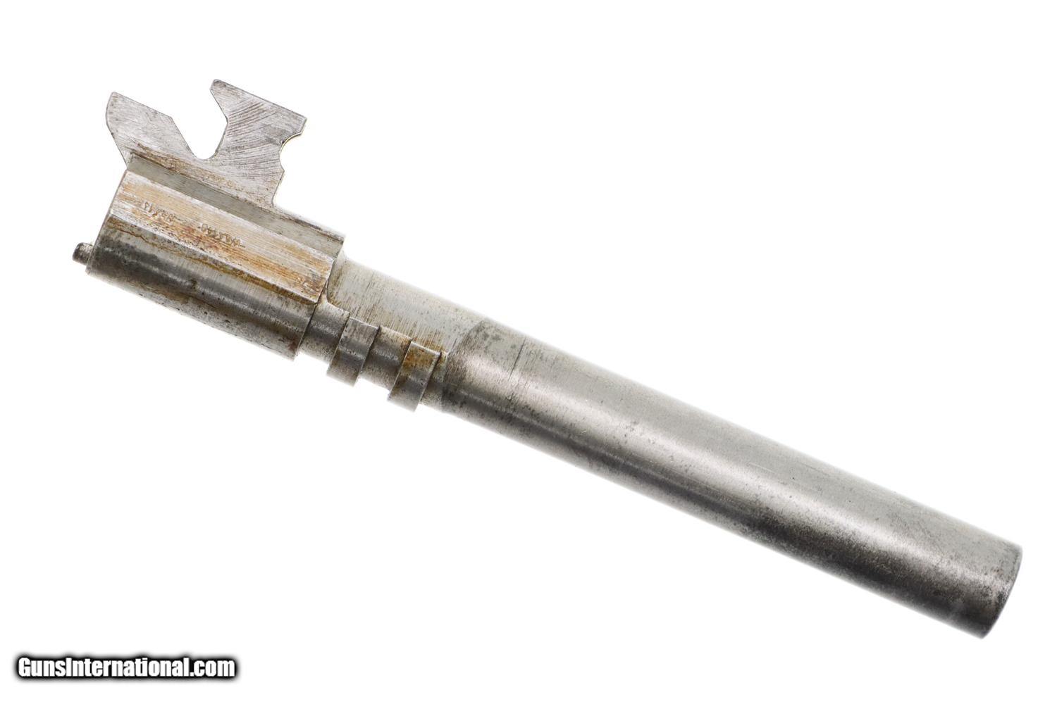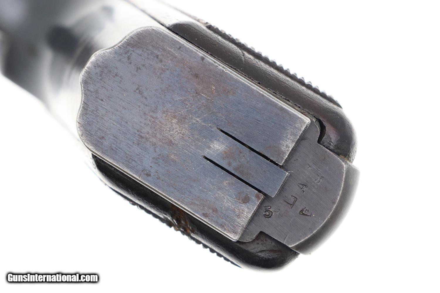 Description: Synopsis: This FN High Power Pistol is a late, all-matching, and all-original WWII German Army military variation in 9mmP with fixed sights and WaA140 acceptances to include the magazine! Description: Standard late production German Army WWII High Power Pistol with fixed sights and correct WaA140 marked magazine. Usual three line address on left side of slide and stacked matching numbers on the right side of pistol. E/WaA140 acceptances in usual locations on left side of slide and frame to include barrel hood. Original checkered/bordered wood grips with unpainted interior. Correct magazine, with aluminum follower, blued body and split tail floorplate, marked on lower rear spine with the WaA140 acceptance. Condition: VG original salt blue with patchy areas of oxidation and thinning, particularly under the trigger guard and front strap. The balance with holster wear with thinning in usual areas of handling. Dark oiled grips with superficial handling marks, a noticeable indentation at bottom of right panel. Comparable or better condition magazine. Bright bore with easily discernible rifling. Correct manual mechanics. A classic, all-matching, late production German Army pistol from WWII with a correctly accepted magazine! SOLD Manufacturer: FN Model: High Power Serial Number: 194820 Caliber Info: 9mm Condition: G/VG |