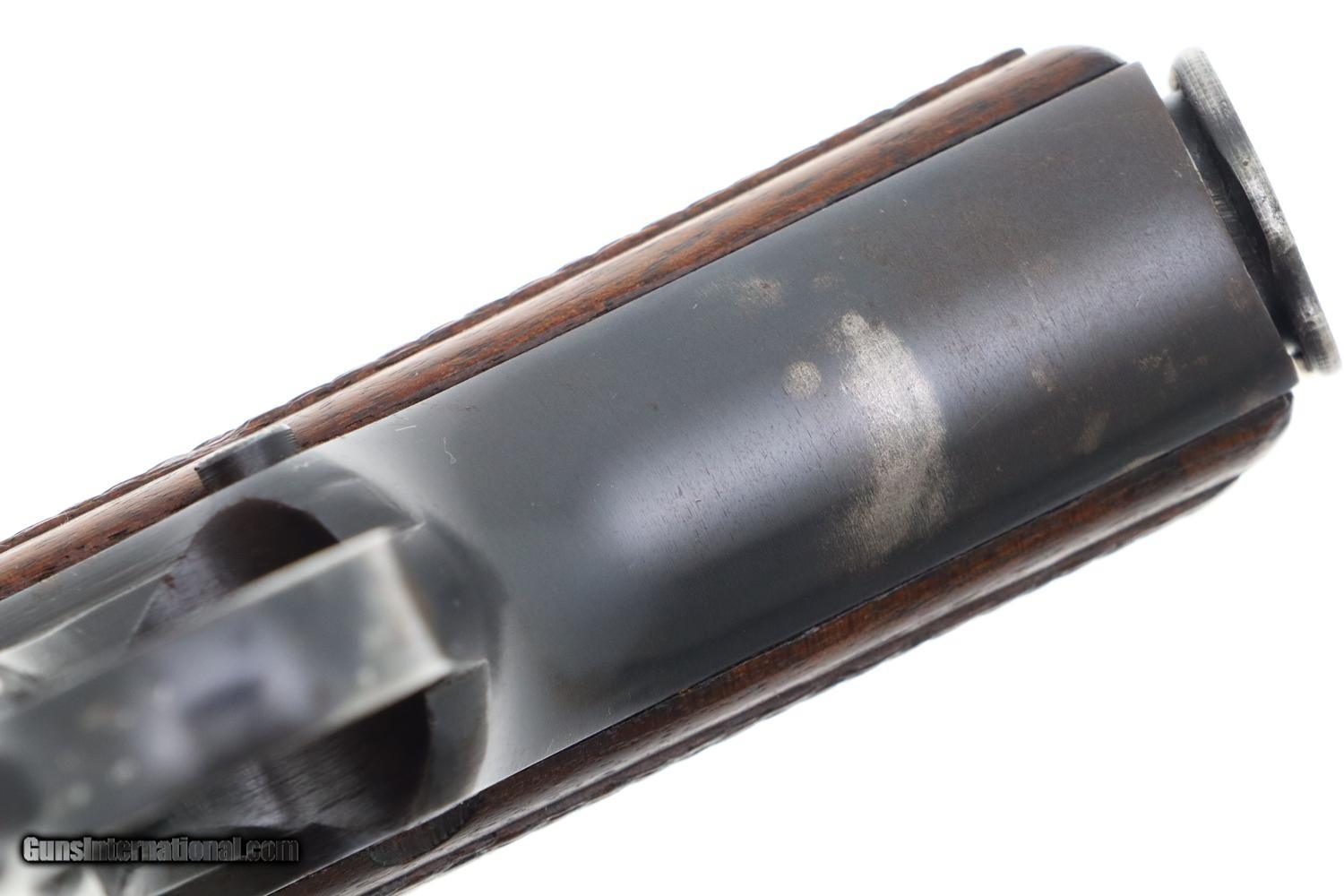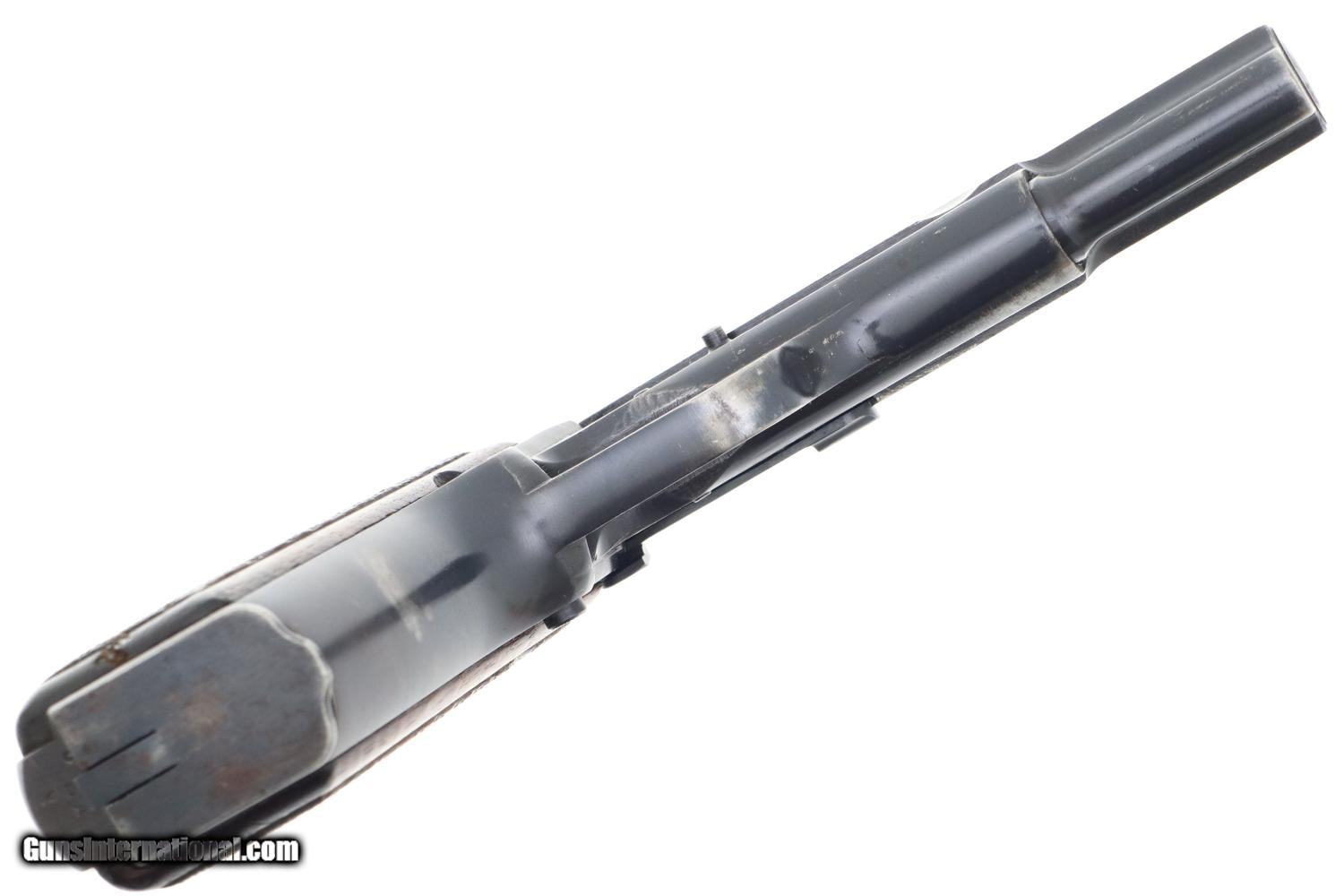 VG original salt blue with patchy areas of oxidation and thinning, particularly under the trigger guard and front strap. The balance with holster wear with thinning in usual areas of handling. Dark oiled grips with superficial handling marks, a noticeable indentation at bottom of right panel. Comparable or better condition magazine. Bright bore with easily discernible rifling. Correct manual mechanics. A classic, all-matching, late production German Army pistol from WWII with a correctly accepted magazine!