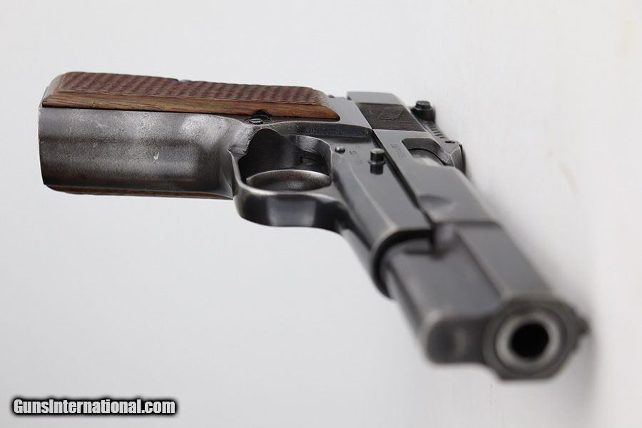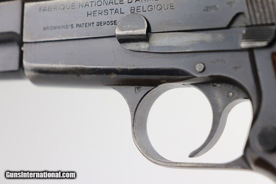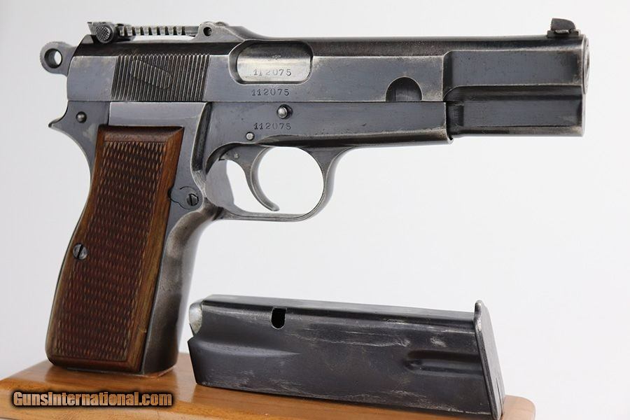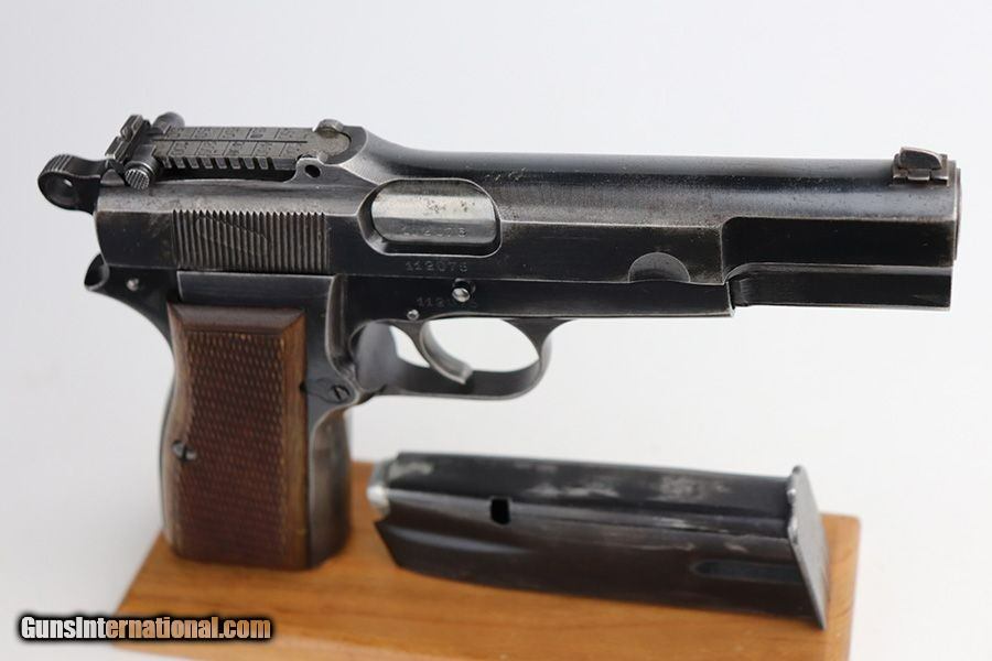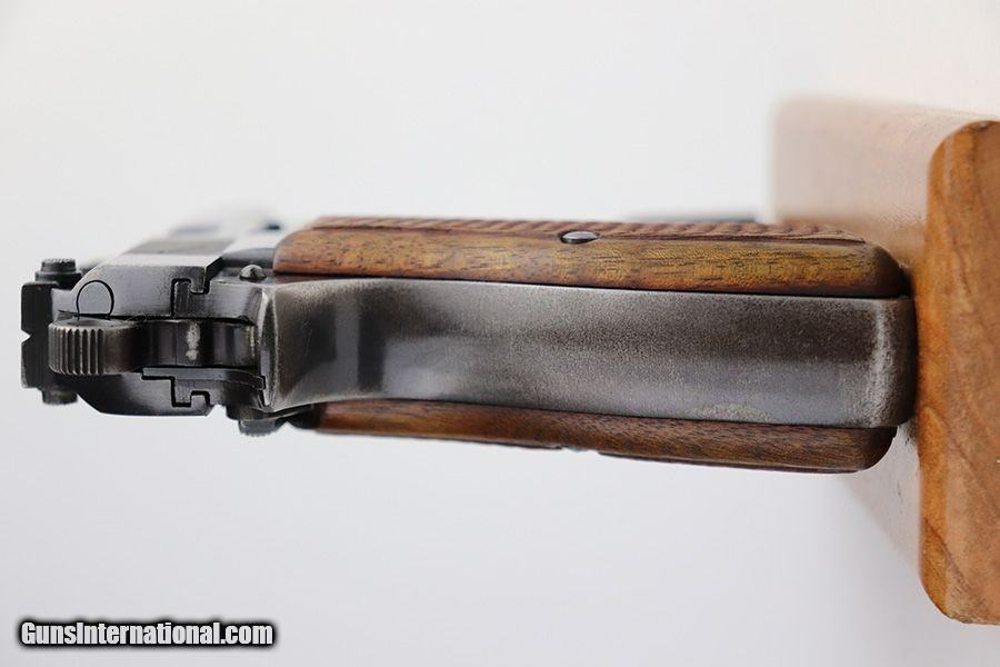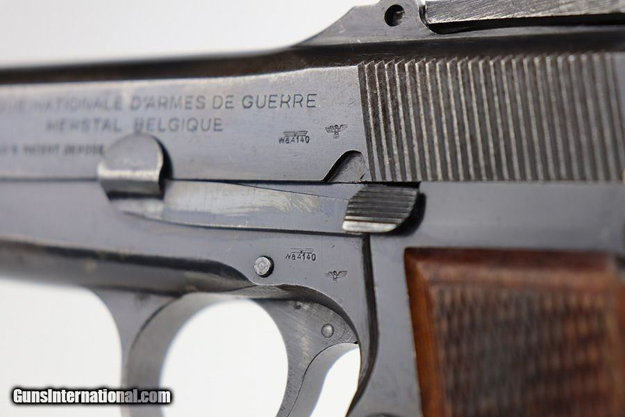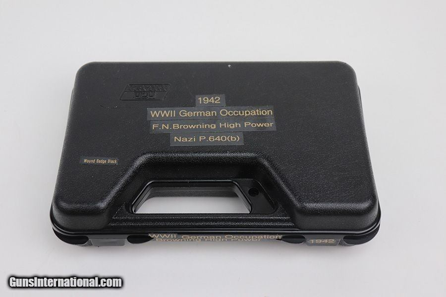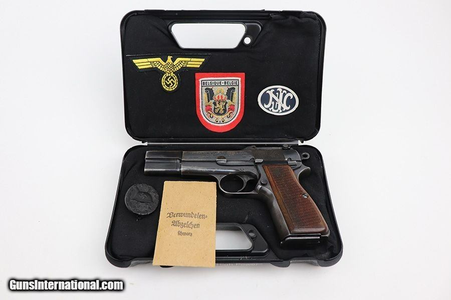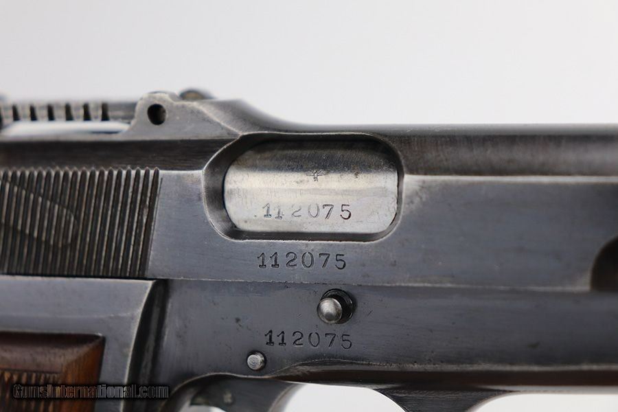 Description: This is a nice example of an FN Browning Hi Power issued to the Nazi military in 1942. This gun is being sold on consignment. The consignor put together a very cool assembly to accompany the gun that includes a labeled hard case, repro Belgian and Nazi patches, and a mint black Wound badge with its original packaging. The gun is all matching, has a tangent rear sight, and the proper "Waffen 140" military proofs throughout. The gun has retained roughly 70% of its original finish. There is thinning on the straps and spotty wear throughout, concentrated on the high edges of the slide. Tiny dots of oxidation on the slide and straps. Light scratch on the top of the slide. Comes with excellent grips and a period-correct "Waffen 140"-proofed magazine. The bore has strong rifling with minor pitting in the grooves. SOLD Curio/Relic: Yes Handgun Caliber: 9x19mm Parabellum (9mm Luger, 9x19mm NATO) Manufacturer: FN Browning Model: Hi Power Serial Number: 112075 Condition: ~70% Bore Condition: 7.5/10 Manufacture Date: 1942 |