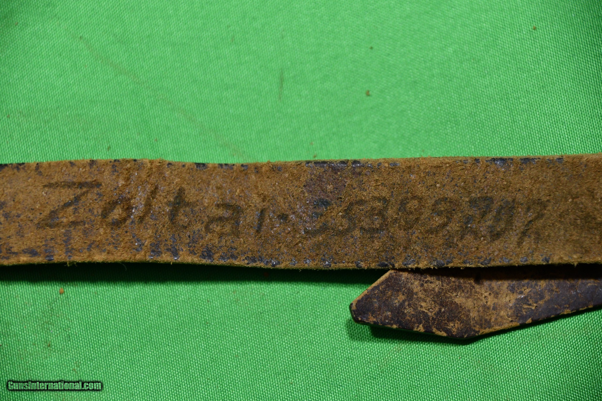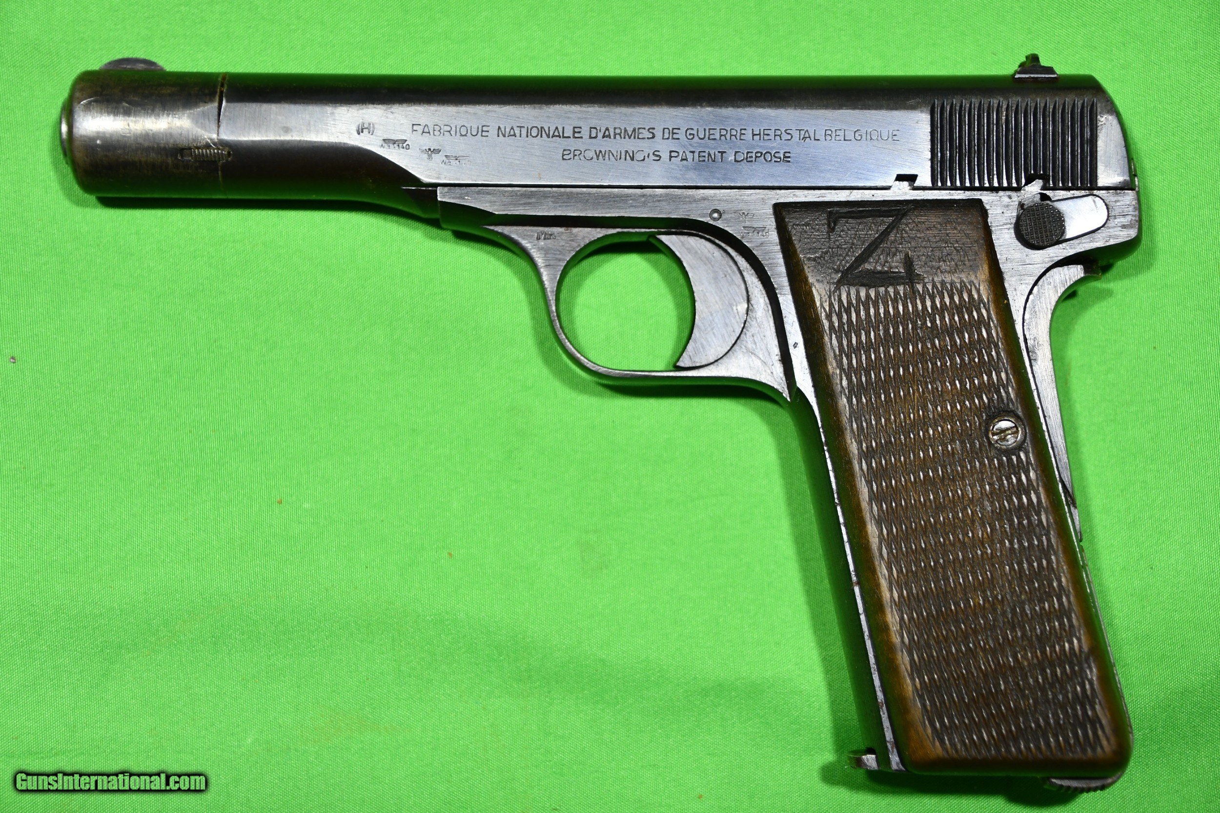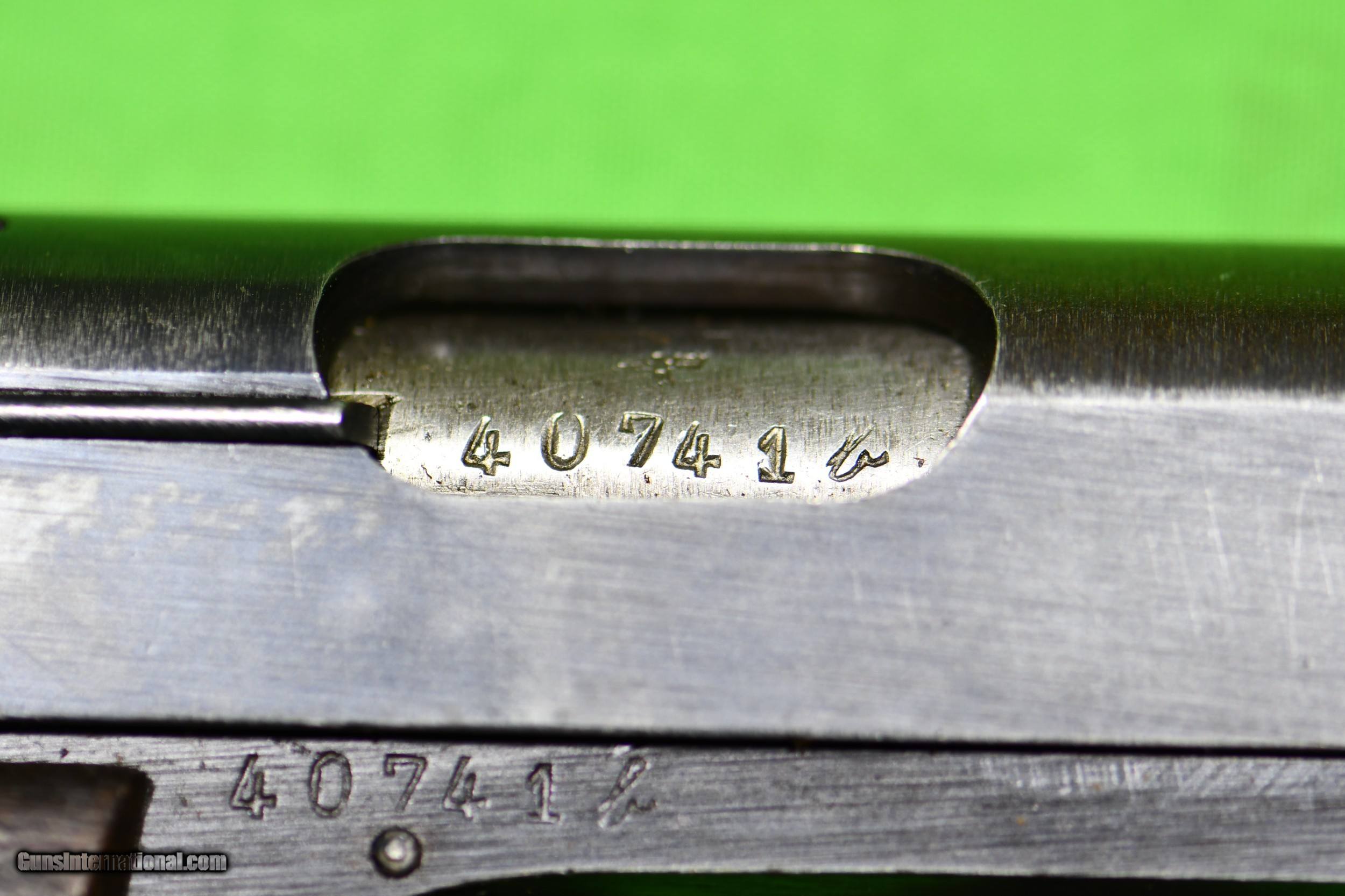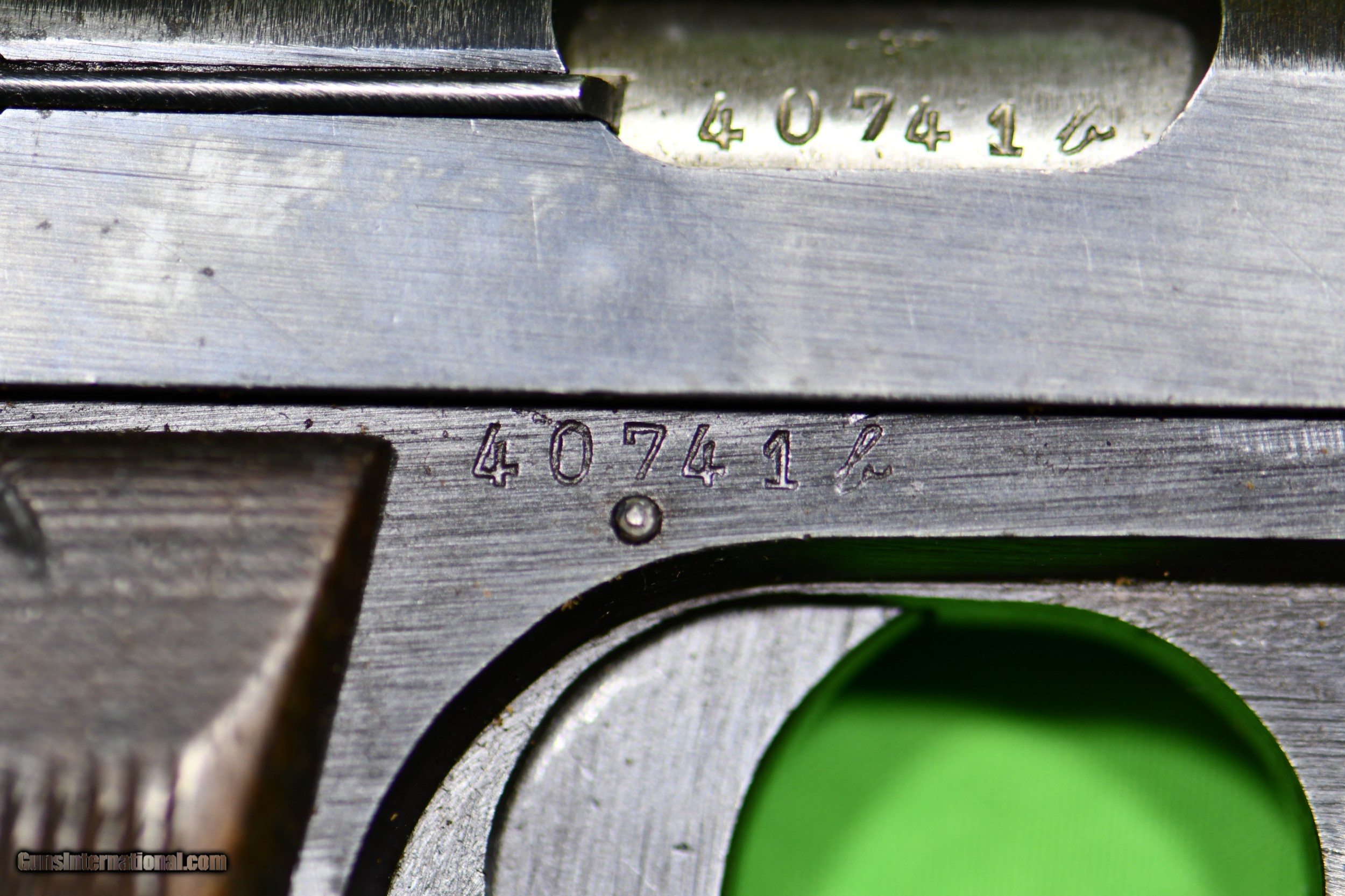 Description: Here is an excellent NAZI FN Browning M1922, complete with its original pigskin holster. From a 50 year old collection of very fine guns. This is the 7.65mm military blue version. Interestingly, the soldier's (I presume) name is written inside the strap and matches the "Z" on the grip. Looks like his number too. I wonder if that can be traced? Almost certainly a German soldier. The gun appears in excellent functioning condition and I would describe the bore as mint. Bright, shining with looks like 100% lands/rifling. The stamps are clear and sharp. SOLD Handgun Caliber: 7.65x22mm Parabellum (7.65x22mm Luger, .30 Luger) |
