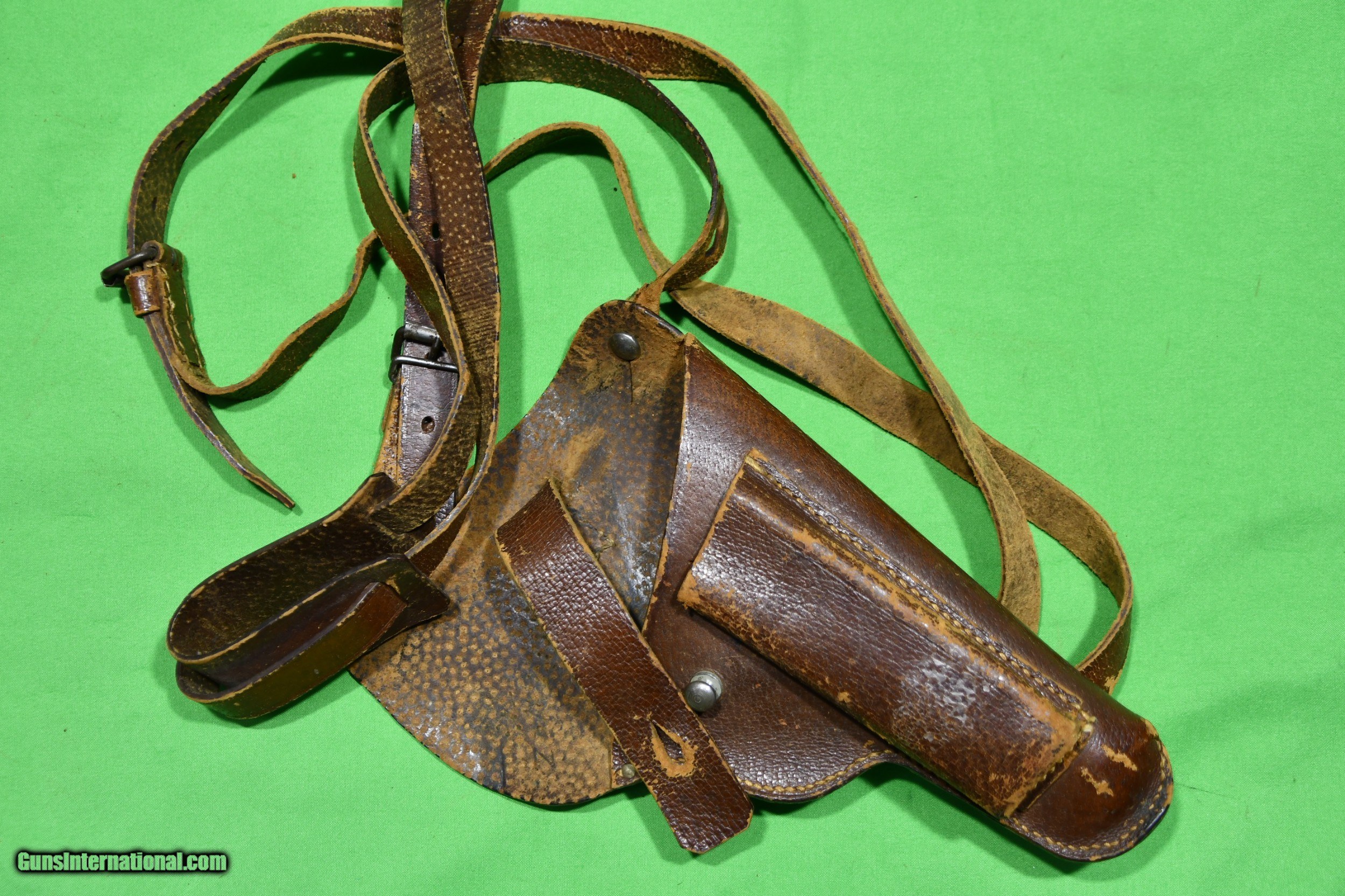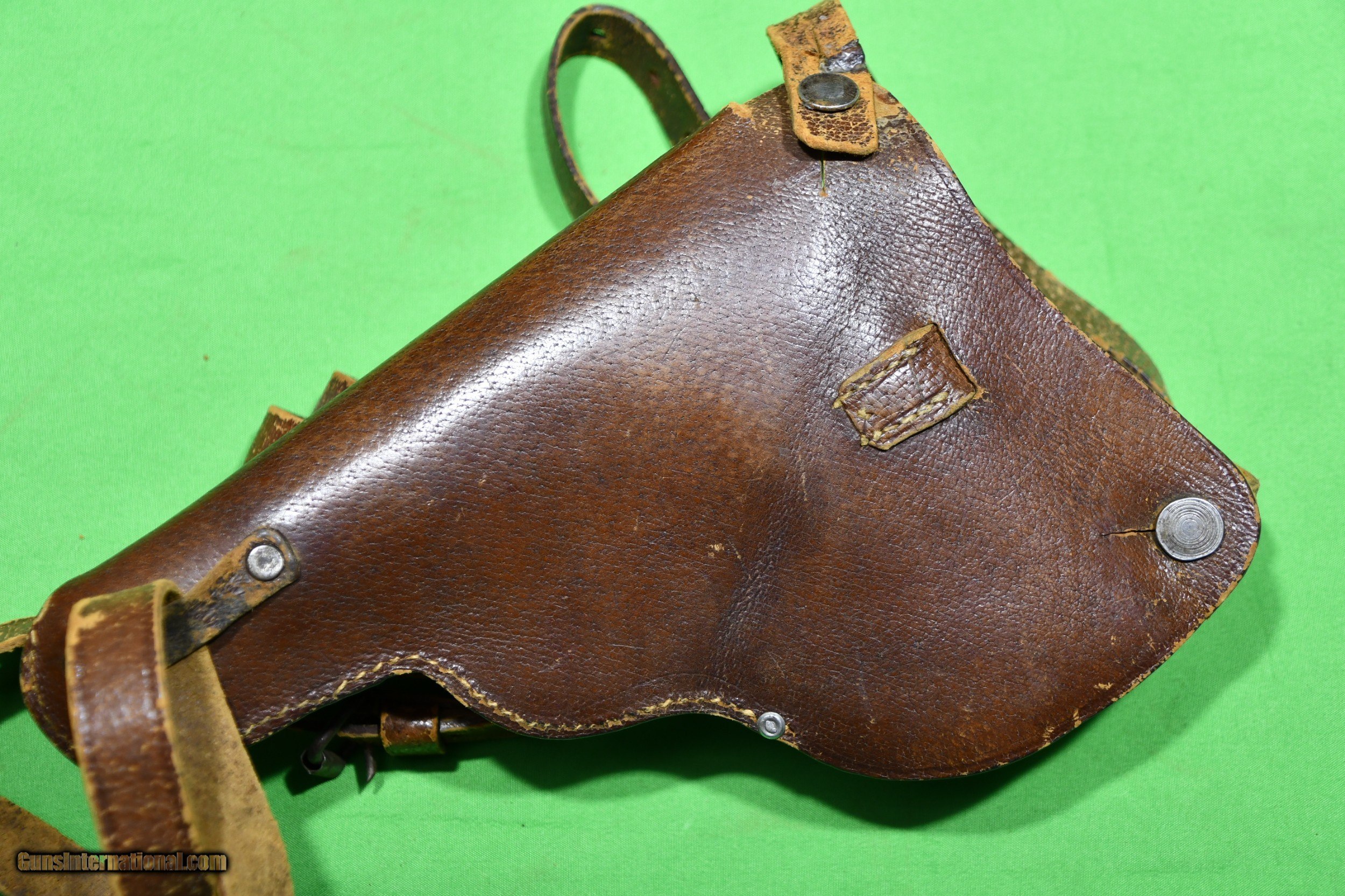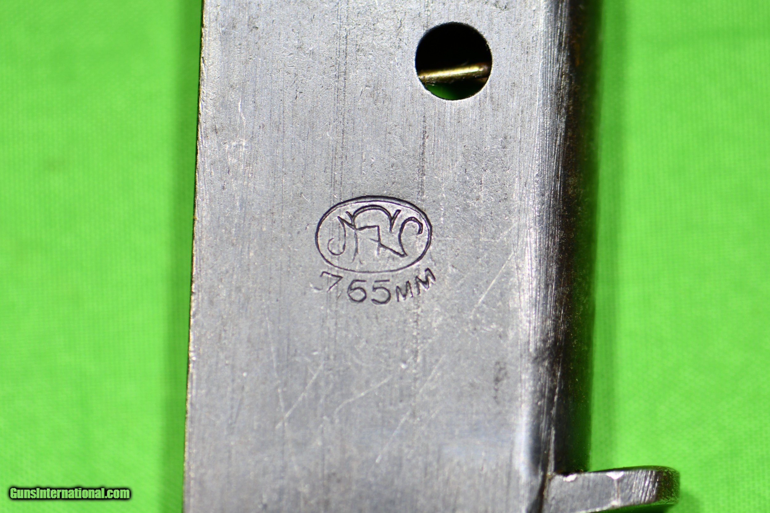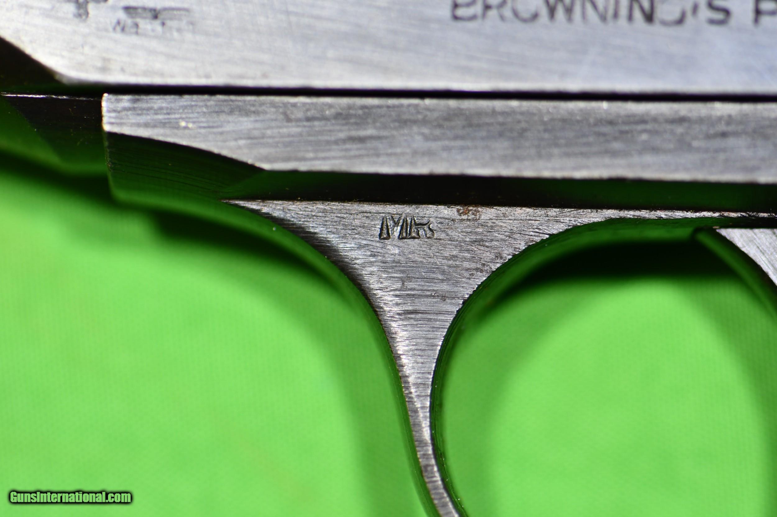 Description: Here is an excellent NAZI FN Browning M1922, complete with its original pigskin holster. From a 50 year old collection of very fine guns. This is the 7.65mm military blue version. Interestingly, the soldier's (I presume) name is written inside the strap and matches the "Z" on the grip. Looks like his number too. I wonder if that can be traced? Almost certainly a German soldier. The gun appears in excellent functioning condition and I would describe the bore as mint. Bright, shining with looks like 100% lands/rifling. The stamps are clear and sharp. SOLD Handgun Caliber: 7.65x22mm Parabellum (7.65x22mm Luger, .30 Luger) |