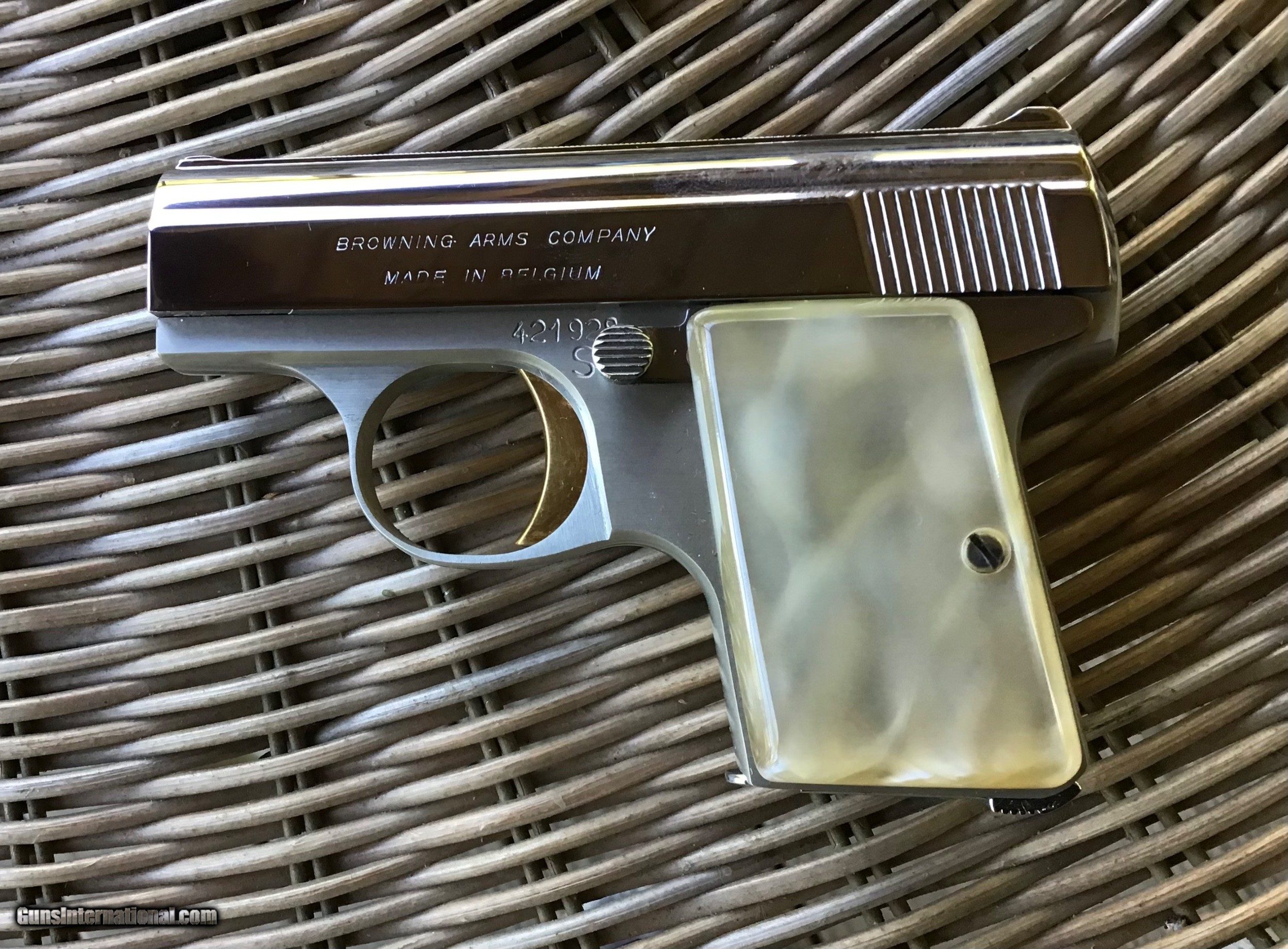 BROWNING BELGIUM “BABY” 25 AUTO, LIGHTWEIGHT ALUMINUM FRAME, BRIGHT NICKEL, GOLD TRIGGER, PEARLITE GRIPS, NEW UNFIRED IN BROWNING ZIPPER POUCH