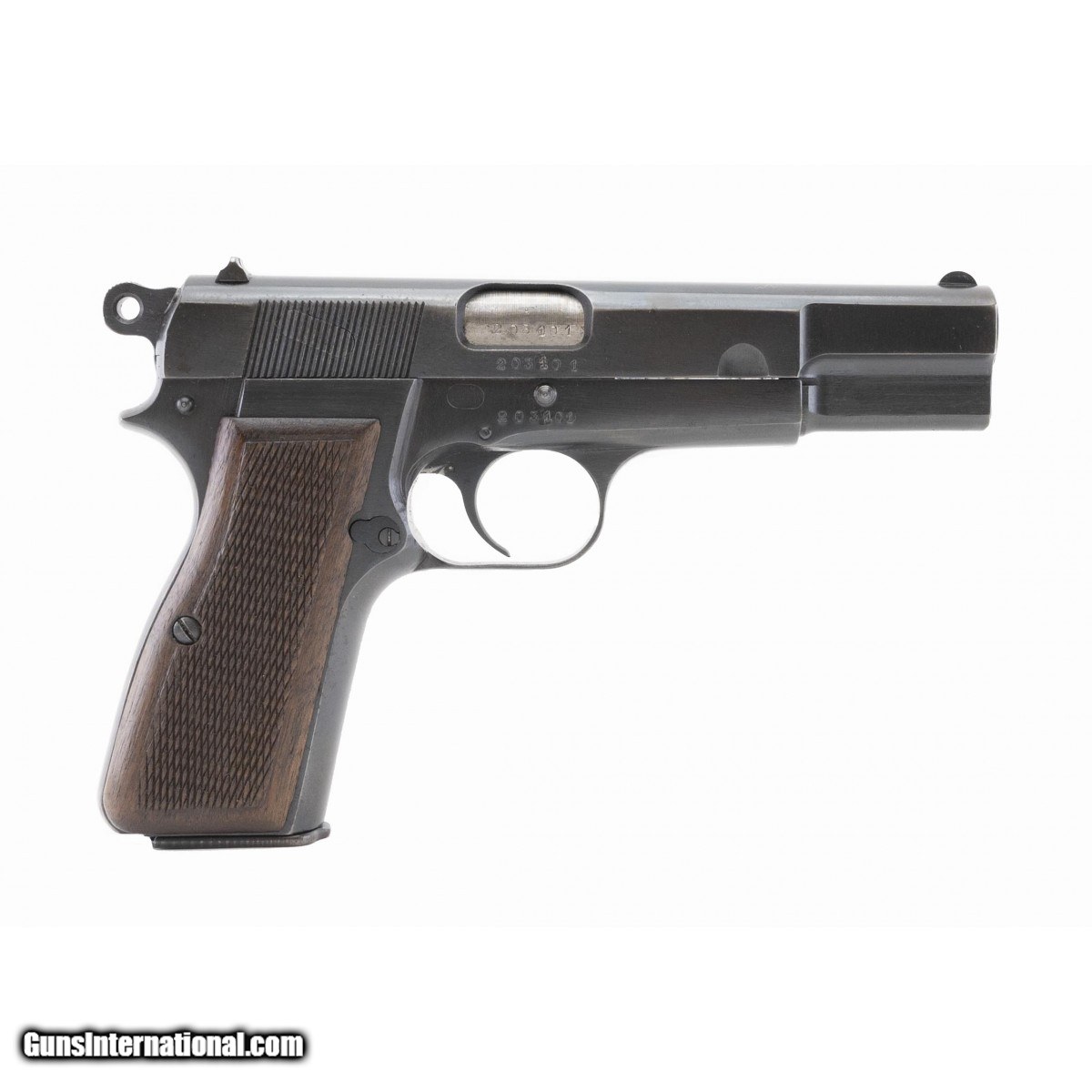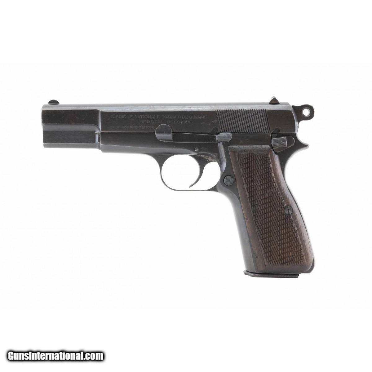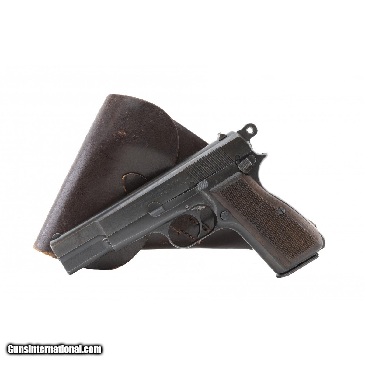 Description: " This very fine type III (fixed rear sight) Browning High Power pistol has the expected Nazi WaA140 proof marks on the frame and slide. It retains approx. 95% of its wartime blue finish with light spotting on the left side of the slide. The wood grips are excellent with no cracks or chips. The bore is fine with frosting in the grooves. Due to what appears to be a factory error, the serial number has an overstamp of an identical 1 in the one hundred digit position on the frame, slide, and barrel. The action functions correctly. This fine pistol comes with an excellent clg44 marked High Power holster. SOLD Curio/Relic: Yes |