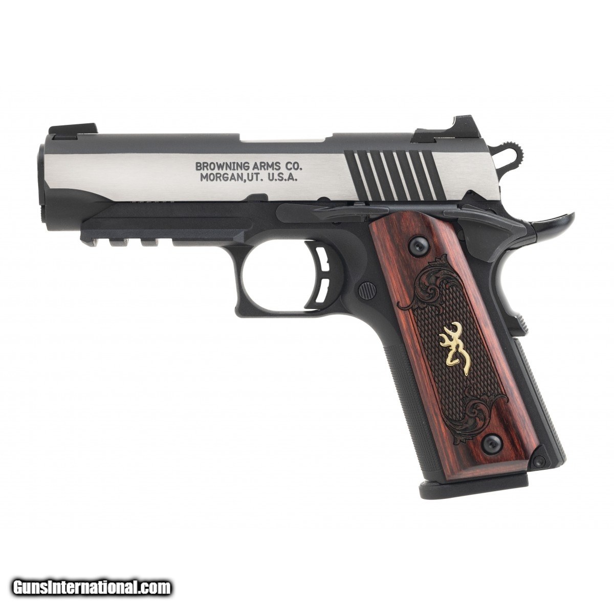 Alloy-frame, compact sized 1911 with light rail, 3 dot sights, polished slide and wood grips. NEW. UPC: 023614850991