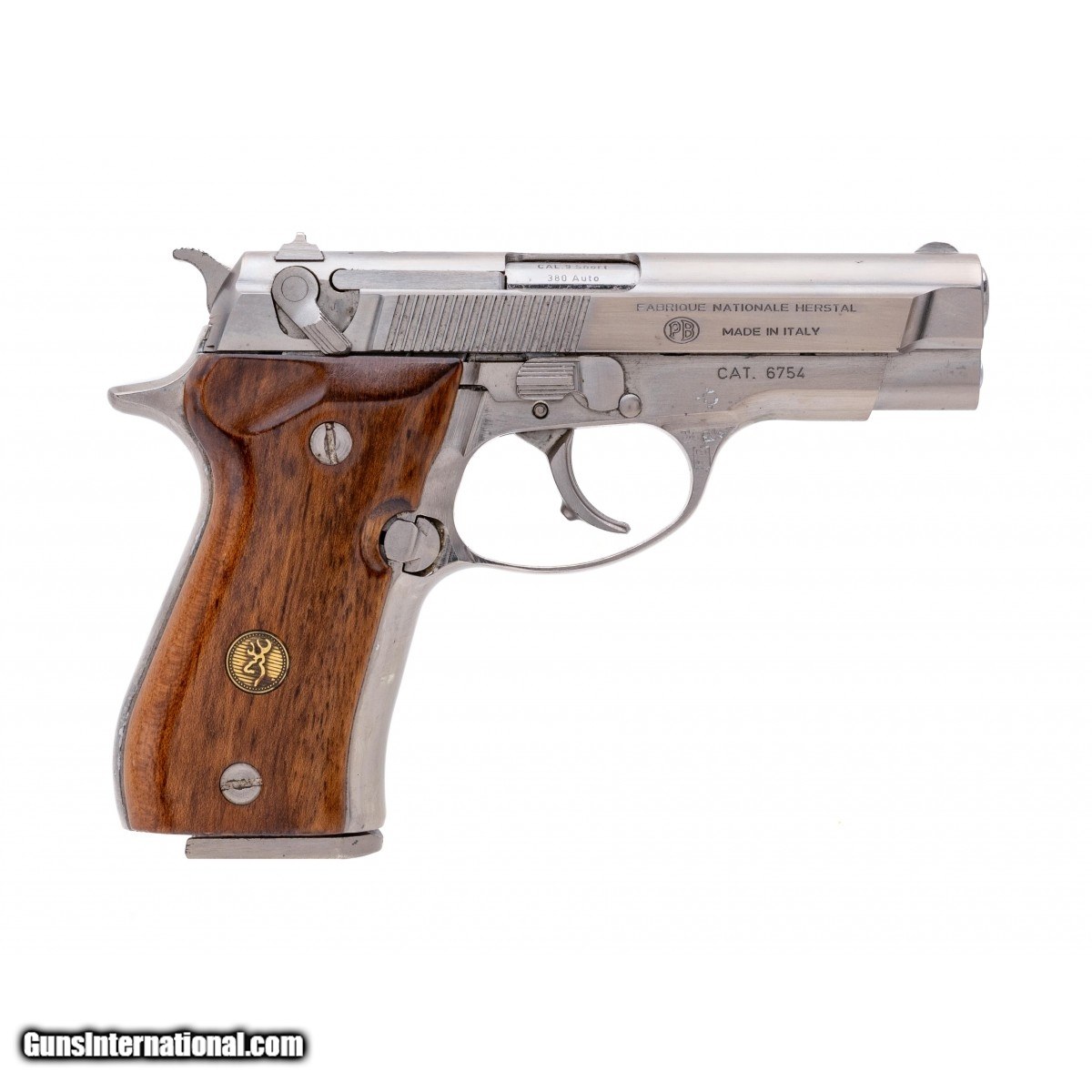 Description: " SN: 425NM13383. Made in 1990. .380 with a 3.75"" barrel. Bore is shiny with strong rifling. Aluminum frame pistol. Nickel finish is in very good condition light wear noted. Browning wood grips are in excellent condition. Overall very good condition. SOLD |