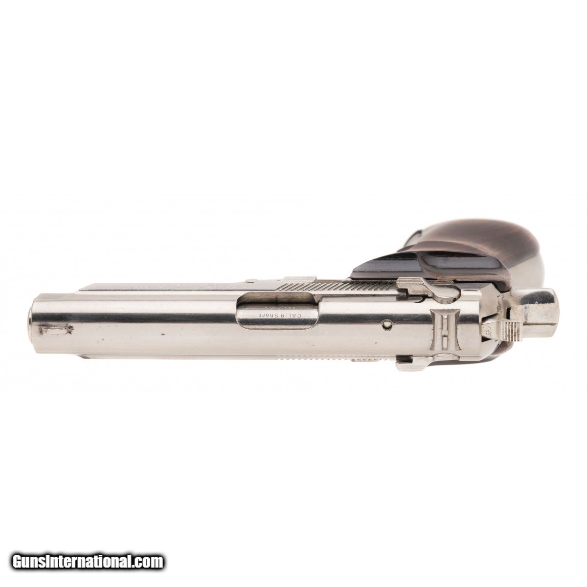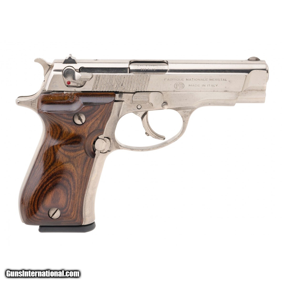 Description: " SN: 425PY16269 Made in 1982, .380 ACP with a 3.8"" barrel. Desirable 13rd compact pistol with nickel finish and wood grips. Excellent condition. SOLD |