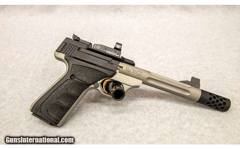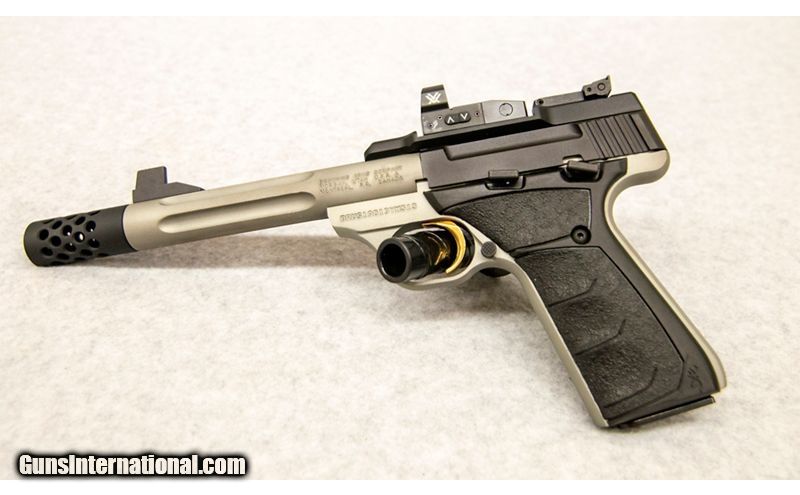 Description: Browning Buck Mark, chambered in .22 LR, with a 10 round magazine. Features include: adjustable rear sight, Vortex Venom Red dot sight, black finger grips, 2 tone finish, gold trigger, compensator. .22 Long Rifle SOLD Chambers: .22 LR (Long Rifle) Metal Condition: Very Good Bore Condition: Very Good Barrels: 6' Sights: "Vortex Venom Red Dot, Adjustable Rear Item Location: Fort Mill, SC |