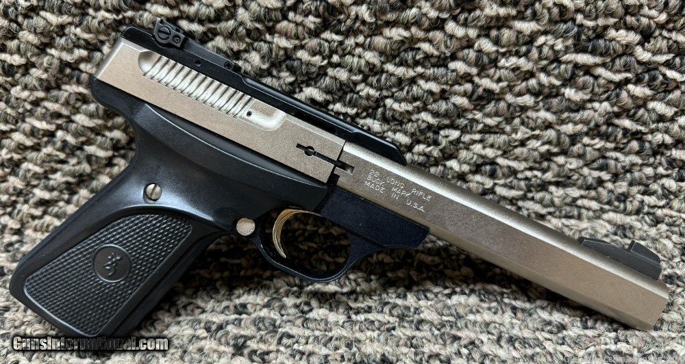 Description: Guns Listing ID: 1331849 This listing is for a USED Browning Buck Mark 22 LR Nickel Finish Black Grips 5.5\" Bull BBL 10+1. This is a used gun, it has been fired and will have residue present. This Browning Buck Mark is chambered in 22 LR, and it will hold 10 rounds in the magazine. This pistol comes with a 5.5 inch bull barrel. It comes equipped with a fixed front sight, and an adjustable rear sight. There are light scratches present across the barrel, grips, and frame. There are a few dark spots present on the barrel and slide. The action appears to be in good condition, the finish appears to be in overall good condition, and the bore appears to be in good condition. This pistol comes with two 10 round magazines, an owner’s manual, and the hard case. This would be a great plinking pistol. ** DISCLAIMER** THIS FIREARM HAS NOT BEEN TEST FIRED*** SOLD Manufacturer: BROWNING Model: BUCK MARK Caliber Info: .22 LR Condition: Used - Non-Certified Barrels: 5.5 BARREL Finish: NICKEL |