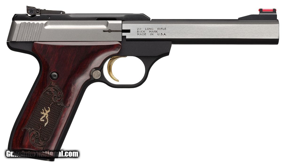Description: Guns Listing ID: 285193 Browning Buck Mark rimfire pistol has lead the industry in quality reliability accuracy and variety. It starts with a piece of aircraftgrade 7075 aluminum alloy and then is CNC machined to exacting tolerances. The crisp singleaction trigger hand reamed chamber target crowned barrel and finely adjustable target sights mean the Buck Mark comes ready for fun straight from the box. The slide features builtin recess and raised side panels for better grip and a convenient manual slide release which is easily operated with the shooting or support hand. It also has grooves plus slide cocking ears\" at the rear making racking the slide back even more convenient. The Buck Mark also utilizes a large manual safety and mag release adjacent to the trigger guard. This Medallion model features an aluminum alloy frame with a matte black finish stainless steel slabsided barrel and slide and Rosewood checkeredengraved grip.\ SOLD Manufacturer: BROWNING Model: BUCK MARK Caliber Info: .22 LR Condition: new Barrels: 5.5 BARREL Finish: STAINLESS |