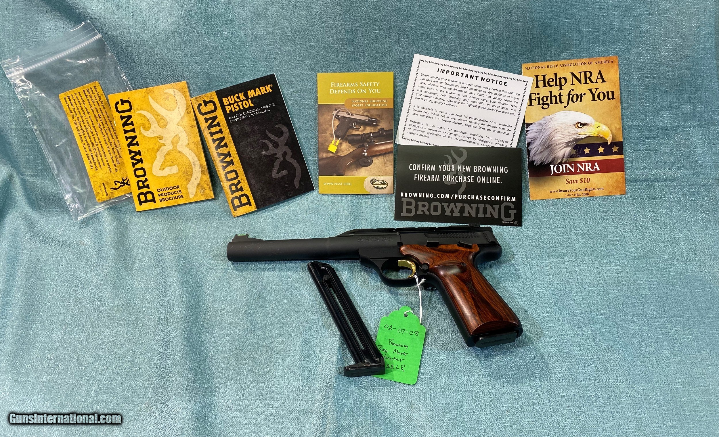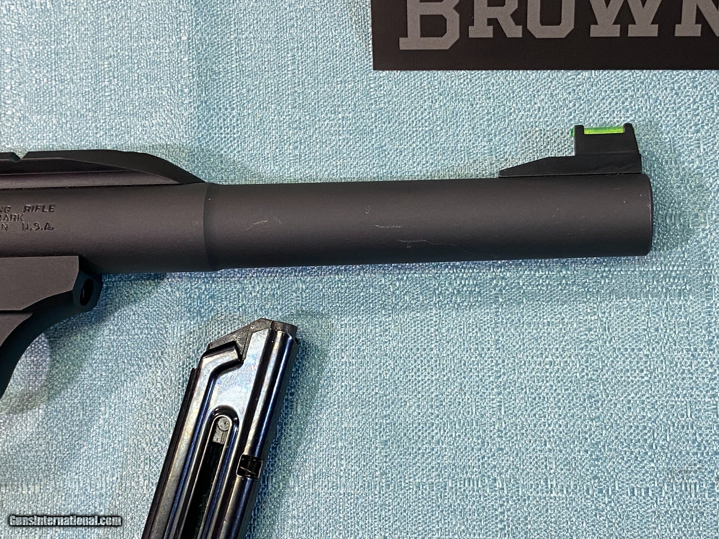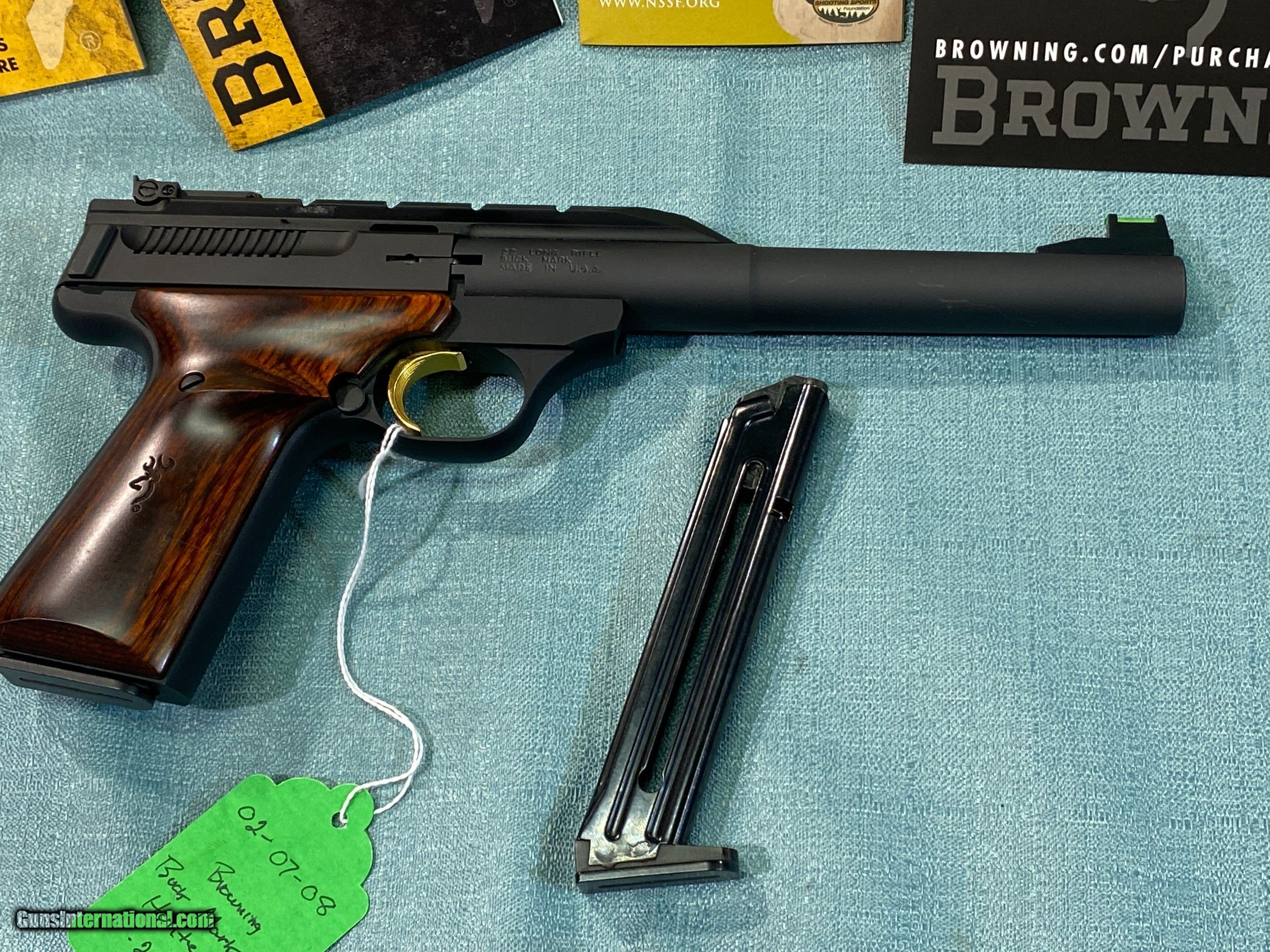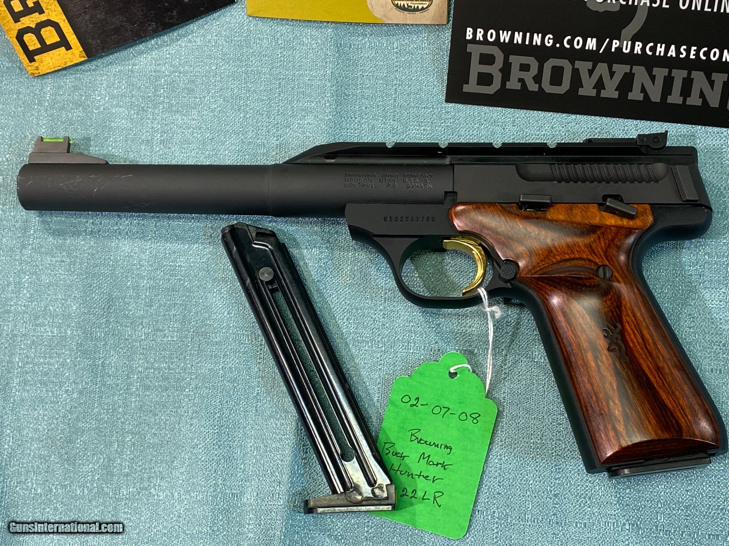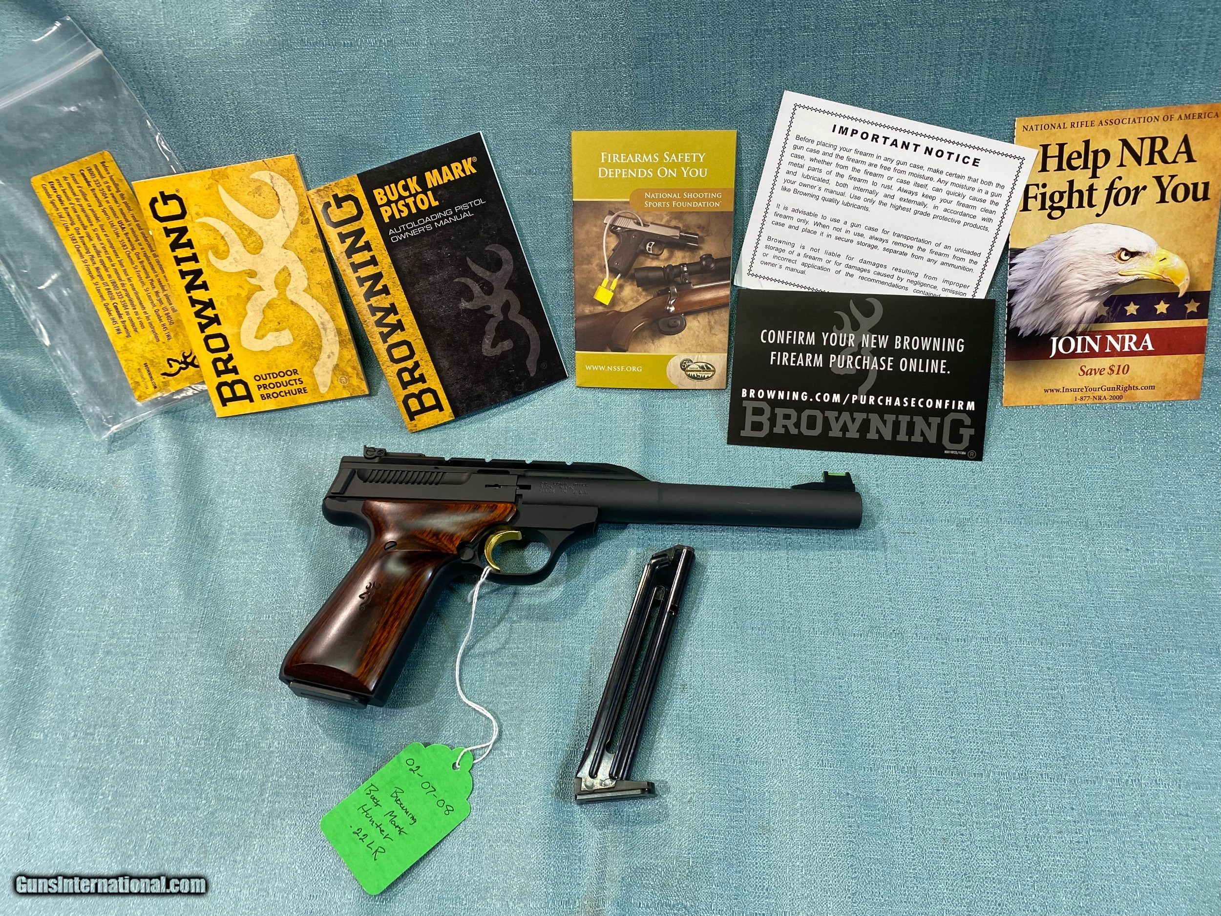 Description: This is a lightly used Browning Buckmark hunter. This pistol comes with the original owners manual and all else pictured. It has a Mirror finish bore. The barrel has a few light marks they don't look to be through the finish buy show light gray against the black matte finish on the pistol. Has a high vis front sight and nice dark wood grips. I'm not sure of the wood type. Looks close to rosewood. It has a 7-1/4" Barrel. Comes with (2) 10 rd magazines Maine Residents add 5.5% sales tax SOLD Handgun Caliber: .22 Long Rifle Manufacturer: Browning Model: Buckmark Serial Number: 515ZZ33728 Barrel Length: 7-1/4 Condition: Very Good Metal Condition: Very Good Wood Condition: Very Good Bore Condition: Very Good Action: Semi auto Item Location: Buxton Maine |