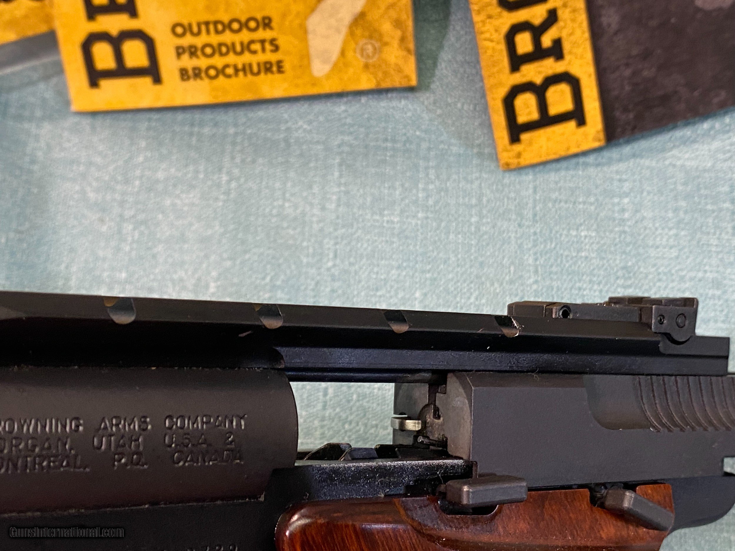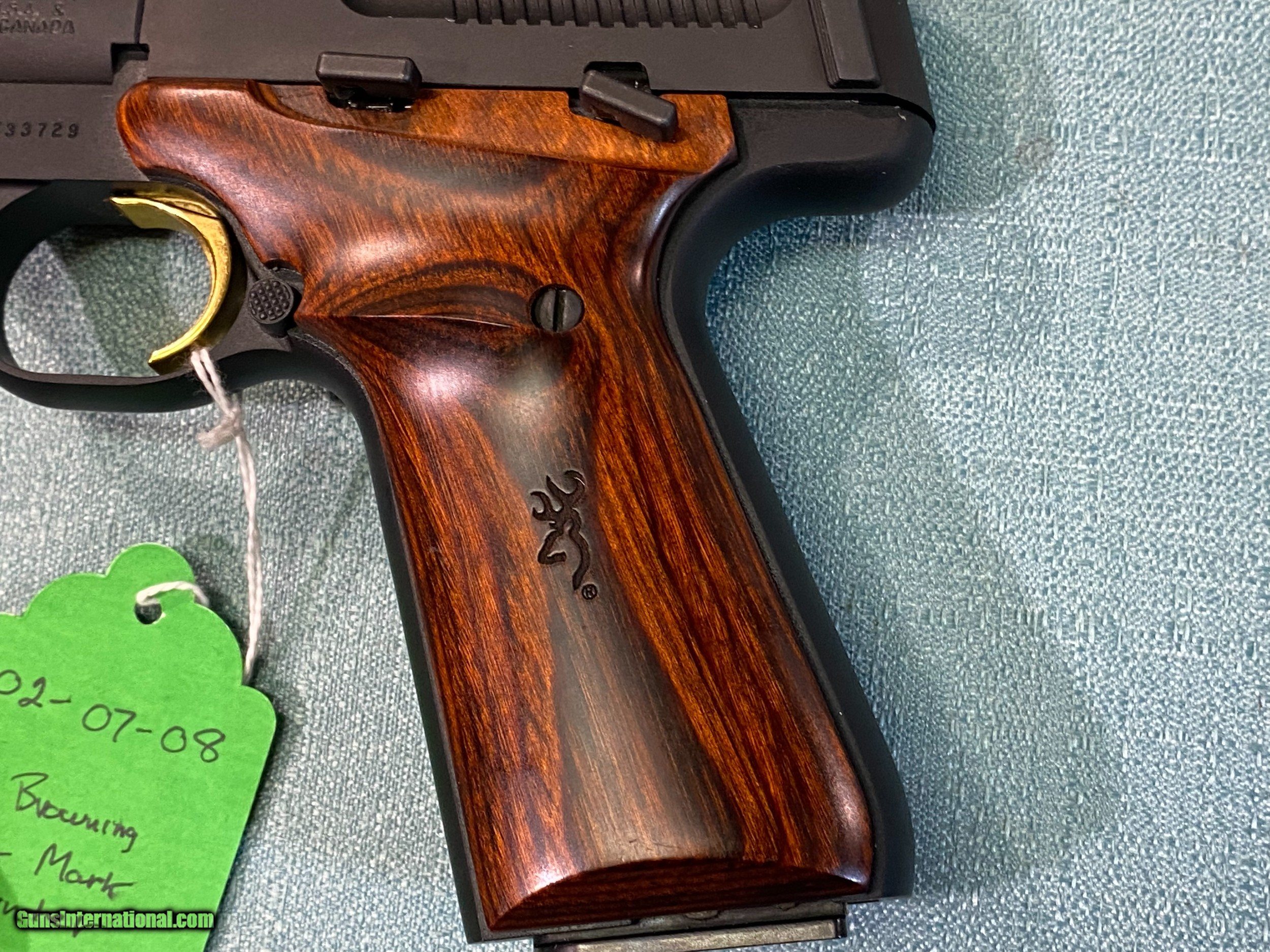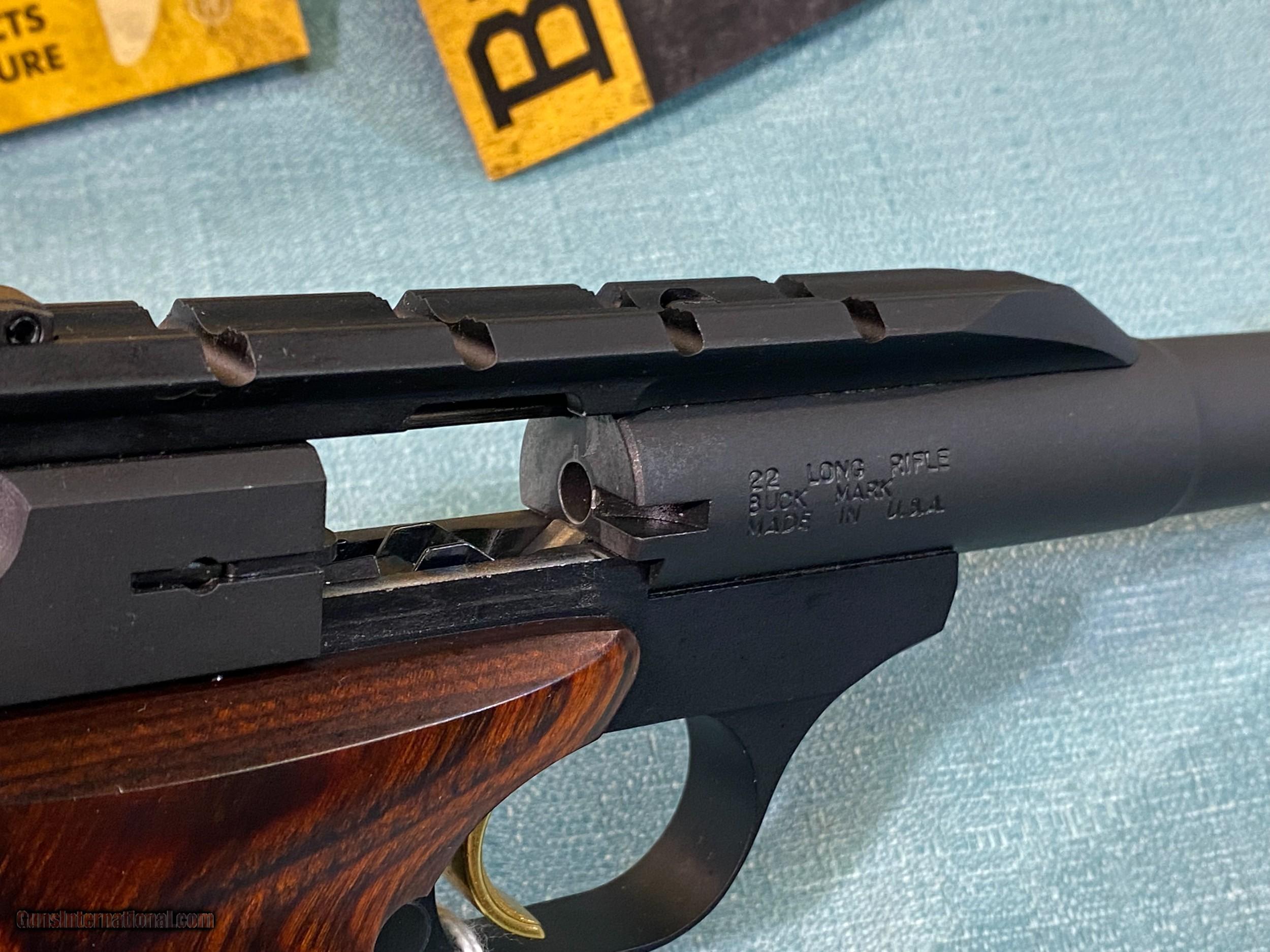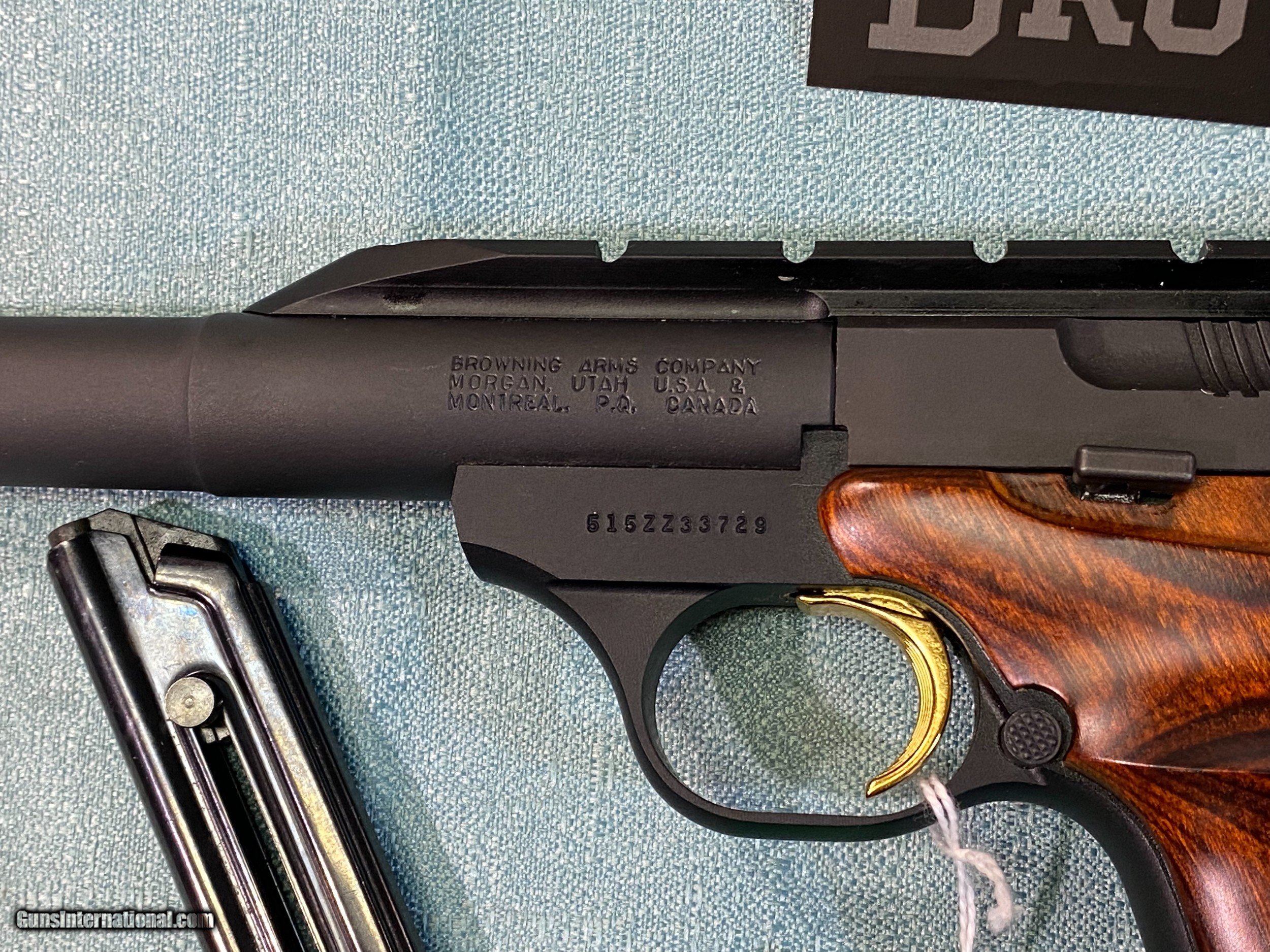 Description: This is a lightly used Browning Buckmark hunter. This pistol comes with the original owners manual and all else pictured. It has a Mirror finish bore. The barrel has a few light marks they don't look to be through the finish buy show light gray against the black matte finish on the pistol. Has a high vis front sight and nice dark wood grips. I'm not sure of the wood type. Looks close to rosewood. It has a 7-1/4" Barrel. Comes with (2) 10 rd magazines Maine Residents add 5.5% sales tax SOLD Handgun Caliber: .22 Long Rifle Manufacturer: Browning Model: Buckmark Serial Number: 515ZZ33728 Barrel Length: 7-1/4 Condition: Very Good Metal Condition: Very Good Wood Condition: Very Good Bore Condition: Very Good Action: Semi auto Item Location: Buxton Maine |