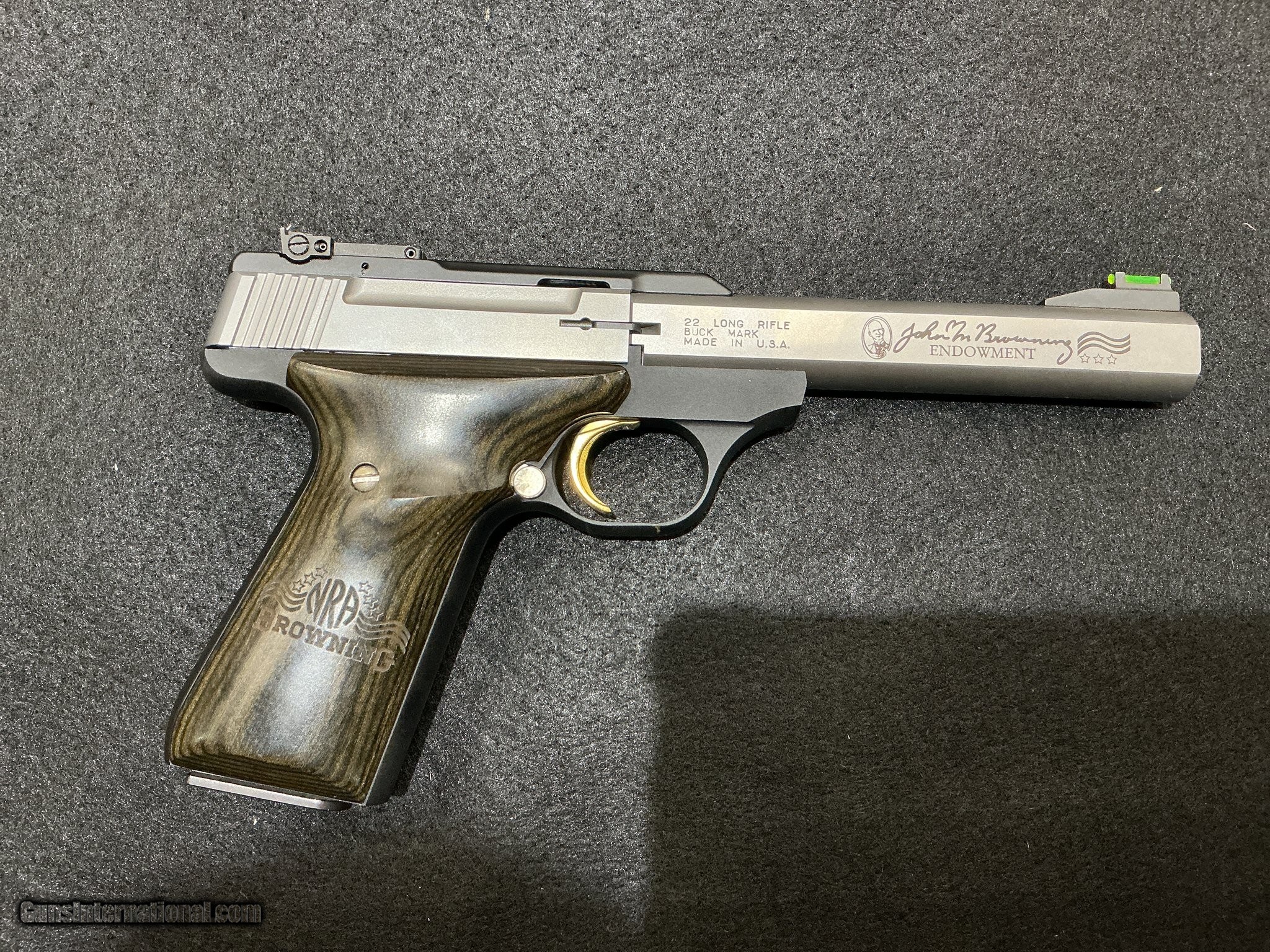Description: Guns Listing ID: 618795 Very good condition. Engravings say “Partners for the future" “John M Browning endowment Manufacturer: BROWNING Model: NRA BUCK MARK Caliber Info: .22 LR Condition: Used - Non-Certified Barrels: 5.5" BARREL Action: SEMI AUTOMATIC Finish: stainless with wood Price: $549.99 Contact Seller |