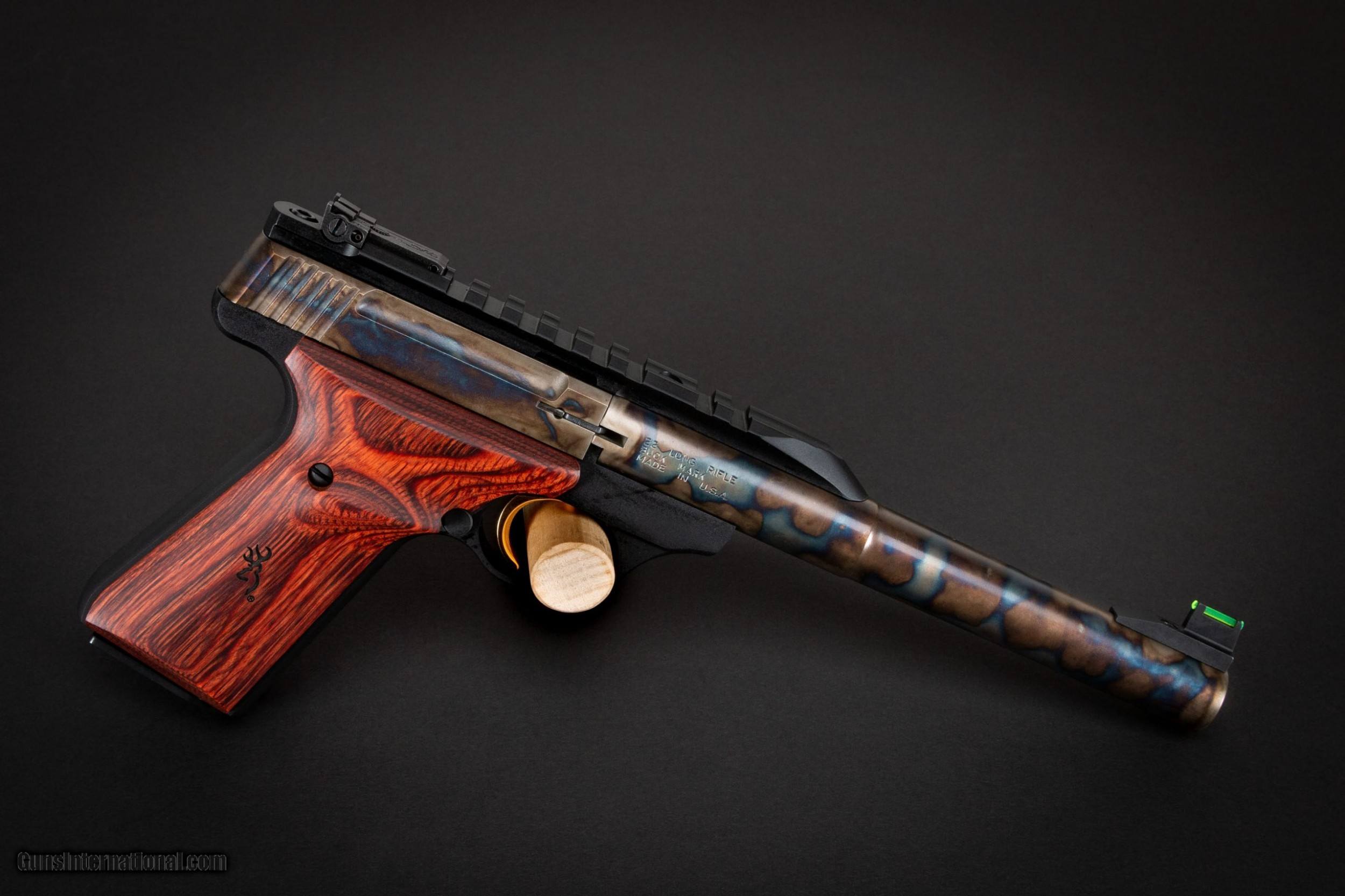 Description: With its lineup of Buck Mark .22s, Browning has put its mark on the universe of rimfire pistols. We’re impressed by Browning’s commitment to quality and reliability in the Buck Mark range, and are excited to add their rimfire to our lineup of Turnbull Finished Favorites. This particular example is a Buck Mark Hunter. The Buck Mark Hunter’s 7.25″ heavy tapered bull barrel shows our bone charcoal case hardened colors beautifully. The .22 LR pistol also benefits from such details as its crisp single-action trigger, integrated scope base, Pro-Target adjustable rear sight and TRUGLO/Marble Arms fiber-optic front sight. Contact us for more information and additional photos. SOLD Handgun Caliber: .22 Long Rifle Manufacturer: Browning Model: Buck Mark Hunter Serial Number: BRUS05025YZ515 Barrel Length: 7.5 Condition: New Barrel Type: Heavy Tapered Bull Barrel Action: Semi-Auto Weight: 38 oz Sights: Pro-Target rear, TruGlo Fiber Optic front Extras: One magazine Case: Soft Item Location: NY |