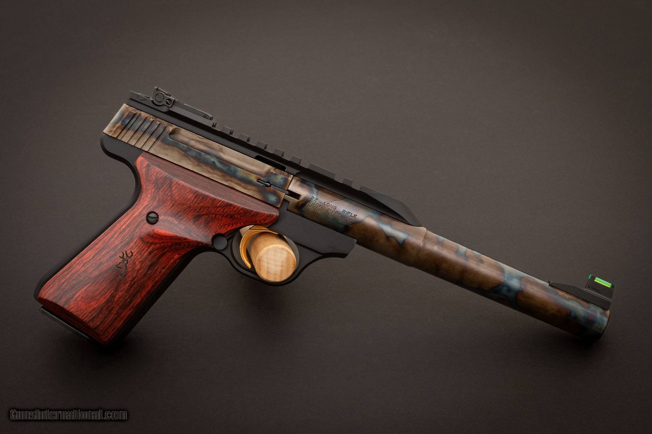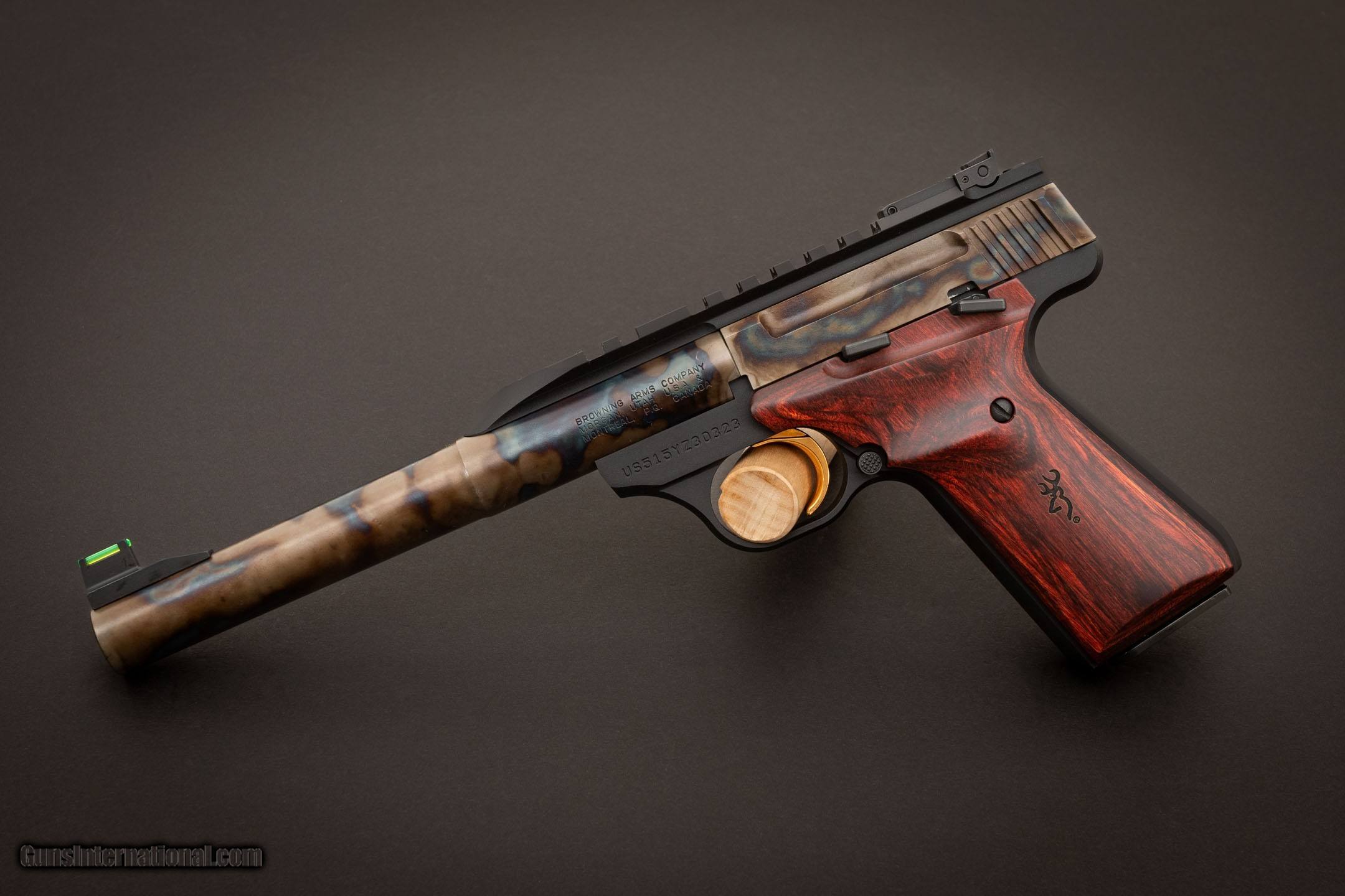 Description: With its lineup of Buck Mark .22s, Browning has put its mark on the universe of rimfire pistols. We’re impressed by Browning’s commitment to quality and reliability in the Buck Mark range, and are excited to add their rimfire to our lineup of Turnbull Finished Favorites. This particular example is a Buck Mark Hunter. The Buck Mark Hunter’s 7.25″ heavy tapered bull barrel shows our bone charcoal case hardened colors beautifully. The .22 LR pistol also benefits from such details as its crisp single-action trigger, integrated scope base, Pro-Target adjustable rear sight and TRUGLO/Marble Arms fiber-optic front sight. Contact us for more information and additional photographs. SOLD Handgun Caliber: .22 Long Rifle Manufacturer: Browning Model: Buck Mark Hunter Serial Number: US515YZ30323 Barrel Length: 7-1/2 Condition: New Action: Semi-Automatic Finish: Turnbull Bone Charcoal Case Hardening Weight: 38 oz Sights: Pro-Target Adjustable Rear, TRUGLO/Marble Arms Fiber-Optic Front Item Location: NY |