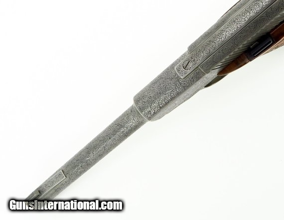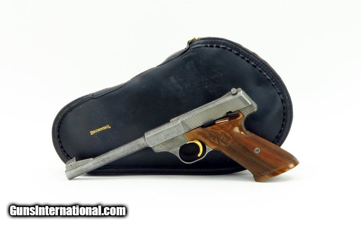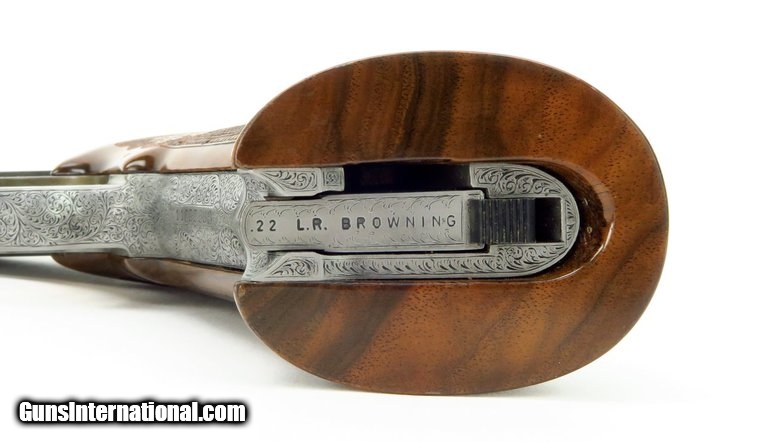 Description: Browning Challenger .22LR caliber pistol. Belgian made factory engraved deluxe model has full coverage fine scroll, French gray finish and carved grips. A beautiful piece in excellent condition with soft case.