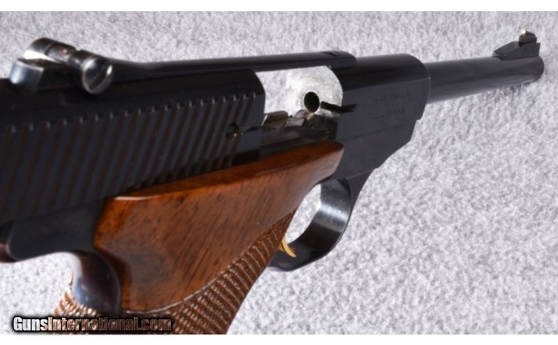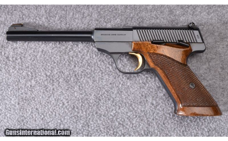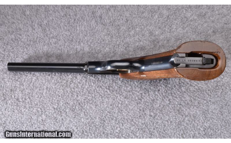 Description: This Belgian Browning was manufactured from 1962 to 1975. Gun remains in very good condition showing some light blue wear at muzzle and trigger guard. There is one 1/4" size scratch into the metal on bottom right side of barrel. Belgian Proof Marks on bottom of barrel and left side of slide. Some light marks around bottom of grips. Bore is excellent. No box. SOLD Manufacturer: S/N 13225XXX Caliber Info: .22 L.R. Metal Condition: Very Good Wood Condition: Very Good Bore Condition: Excellent Barrels: 6 3/4 Triggers: Original Stock: Checkered Walnut Wrap Around Grips Weight: 36 OZ Sights: Ramp Front with White Bead - Adjustable V Notch Rear Item Location: Wheeling, WV |