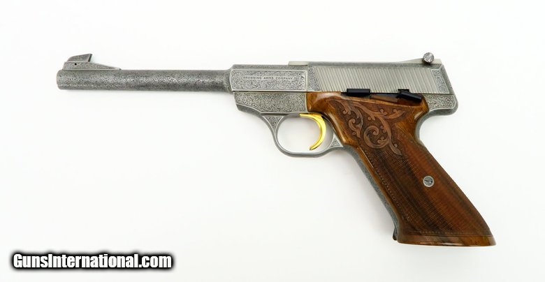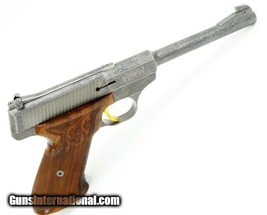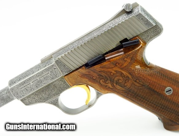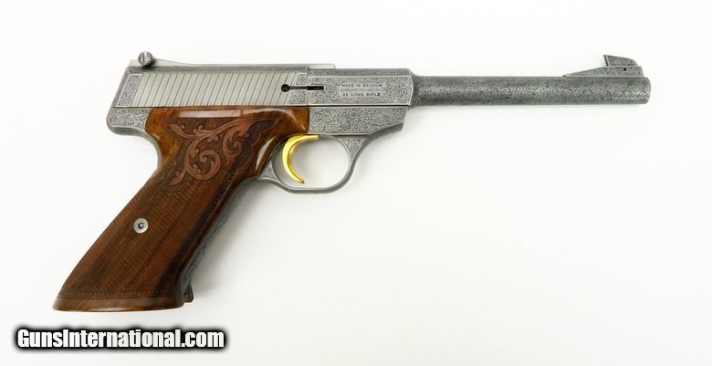 Browning Challenger .22LR caliber pistol. Belgian made factory engraved deluxe model has full coverage fine scroll, French gray finish and carved grips. A beautiful piece in excellent condition with soft case.