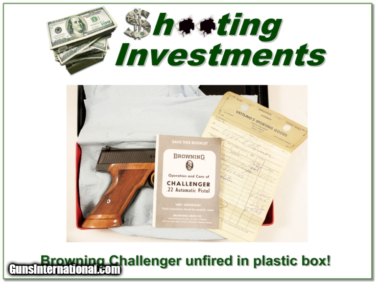 Description: Collectors, this is an unfired 63 Belgium made Browning Challenger. It has nice wood grips and comes with the hard to find plastic box with all factory papers and original sales receipt! You won’t find a nicer example. I am selling this one on consignment and as such lay-a-way can’t be used. It does of course have the standard 3 day inspection. Shipping and insurance is $30. Please email me with any questions or larger pictures. (I now consign quality firearms only 10%! Let me know if you have any you would like to sell!) [15-0198] Payment: Payment is by Money Order, Cashiers Check or Personal Check. I can now also accept MasterCard and Visa with a 3% convenience fee. PayPal can be used for some items but never firearms. Please let us know if you would like to pay via PayPal. Shipping: The shipping charge will be listed in each description. It is $30 for most guns. Some heavy guns or those insured for over $2000 may be higher. Shipments to Alaska and Hawaii are higher because air shipment is required. Most firearms are shipped within 5 days of receipt of payment. We prefer shipping at the beginning of the week to avoid firearms in transit over weekends. We package all shipments carefully and insure them for the full purchase price, rounded up to the next $100. In the unlikely event that damage occurs, it is important that you save all packaging material for the claims process. Optics are shipped Priority Mail and most other non-firearm shipments are shipped First Class. Returns: Our return policy is simple. If for any reason you are not pleased with your purchase, you may return your item for a refund. The only exception is ammunition, it cannot be returned. It is important to us that you are happy. Guns cannot be fired or dissembled before returning them and must be returned in the same condition as received. Notification of a return must occur with-in 3 days of receipt at your dealer. Shipping, convenience and dealer fees are not refundable and are the responsibility of the buyer. Lay-a-way: If needed, we offer a 60 day lay-a-way option on most firearms. It is 1/3 now, 1/3 in 30 days and 1/3 in 60 days. Lay-a-way firearm sales are final. Consigning your firearms with Shooting Investments: We will help you get top dollar for your firearms. While most local guns shops charge 20% or more, our fee is only 10% with a minimum of $50. At your local gun shop it might take months to sell. Selling on-line provides instant access to thousands of interested buyers. You won’t find any other on-line dealer willing to sell your firearms for only 10% or listing every gun on 4 separate s. Selling through an House typically costs the seller 15% and the buyer an addition 15% (so 30%) and you have to wait several months to sell and longer to receive funds. If properly priced, we will sell your firearms in a week or two. Send us an email or give us a call and we’ll explain how easy it is for you to get top dollar. Trading: We collect guns and usually just trade for guns we want to add to our collections. We often sell guns for others wanting to purchase one of ours. We find this the most fair to both of us. Our Commission is only 10% and we hold the gun you want until yours sells. Please contact us if you want to sell one of yours to buy one of ours. Help for California Buyers: We are happy to ship to California. It is the buyer’s responsibility to make sure any item you buy is legal in your state. We are also happy to help with your purchase of a firearm from someone other than us. If you see a gun you would like to buy but the seller can’t or won’t ship to California we can help. You buy the gun and have it shipped to us. We’ll then ship it to your California dealer. The cost for this service is only $30 + shipping. Let me know if we can help! SOLD |