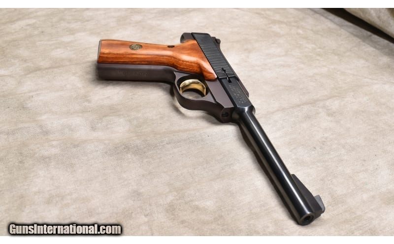 Description: Nice trail or target pistol featuring adjustable target sights, hand filling hardwood stocks, and grooved gold trigger. Date of manufacture is 1977. .22 Long Rifle SOLD Chambers: 10 rounds Metal Condition: Very good to excellent. There is slight wear along the sharp edges. Wood Condition: Excellent. Bore Condition: Shiny and bright with good rifling. Barrels: 6-3/4 inch Triggers: Factory single action trigger. Butt Pad: Smooth hardwood grips. Weight: 39 oz Sights: Patridge and adjustable notch open sights. Item Location: Rogers |