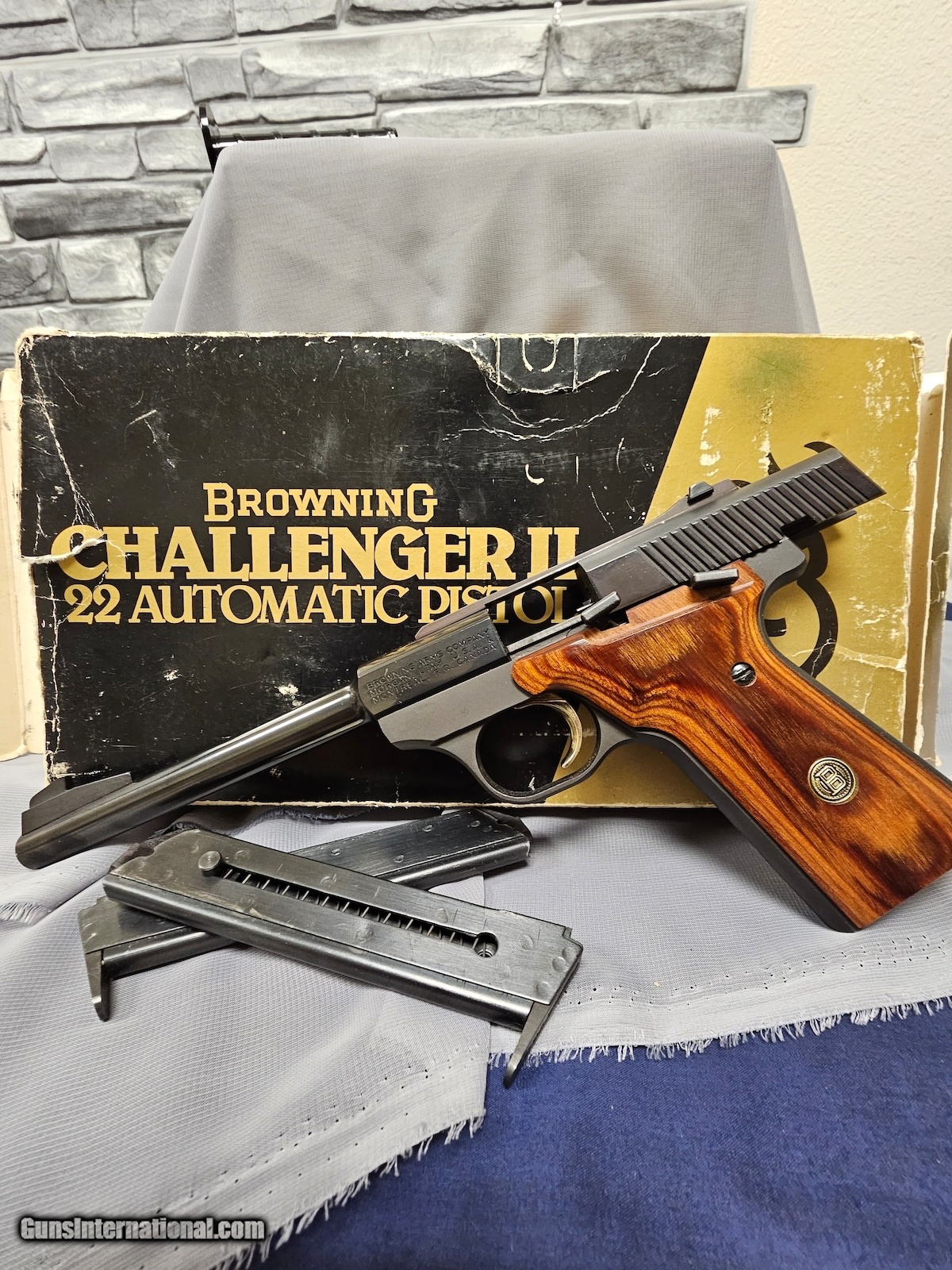 Description: Guns Listing ID: 849619 Browning Challenger II 22LR 6.75\" With Original box and 2 magazines. The box has seen better days. Firearm and grips appear as new no damage. The bore is bright and shiny, barrel bluing appears to be about 97% Seen are a couple of scratches on the parkerized frame. Function tested on range. SOLD Manufacturer: BROWNING Model: CHALLENGER II Caliber Info: .22 LR Condition: Used - Non-Certified Barrels: 6.75 BARREL Finish: BLACK |