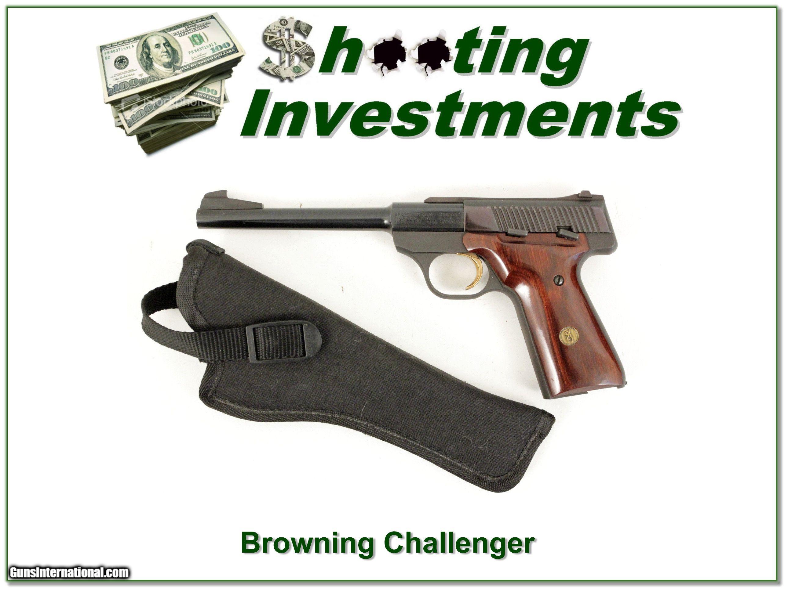 Description: This is an excellent condition Browning Challenger II. It is USA Made and has a 6.75in barrel. I see no marks and it comes in holster as seen. I am selling this one on consignment and as such lay-a-way can’t be used. It does of course have the standard 3-day inspection. Shipping and insurance is $39. Please email me with any questions or larger pictures. (Consign your quality firearms with Shooting Investments for only 10%! Let me know if you have any you would like to sell!) 17-1179 Payment: Payment is by Money Order, Cashiers Check or Personal Check. I can now also accept MasterCard and Visa with a 3% convenience fee. PayPal can be used for some items but never firearms. Please let us know if you would like to pay via PayPal. Shipping: The shipping charge will be listed in each description. It is $39 for most long guns and $29 for most handguns. Some heavy guns or those insured for over $2000 will be higher. Shipments to Alaska and Hawaii are higher because air shipment is required. Most firearms are shipped on Tuesday and Thursday and usually in 5 days of receipt of payment. We package all shipments carefully and insure them. For long guns you can purchase a new Plano case for $19. They now cost us $22 when buying 100 at a time. Optics are shipped Priority Mail and most other non-firearm shipments are shipped First Class. Returns: Our return policy is simple. If for any reason you are not pleased with your purchase, you may return your item for a full refund of purchase price. Ammunition cannot be returned. It is important to us that you are happy. Guns cannot be fired or dissembled before returning them and they must be returned in the same condition as received. Notification of a return must occur with-in 3 days of receipt at your dealer. Shipping, convenience and dealer fees are not refundable and are the responsibility of the buyer. Lay-a-way: If needed, we offer a 60 day lay-a-way option on most firearms. It is 1/3 now, 1/3 in 30 days and 1/3 in 60 days. Lay-a-way firearm sales are final and if not completed the first payment cannot be returned. Consigning your firearms with Shooting Investments: We will help you get top dollar for your firearms. While most local guns shops charge 20% or more, our fee is only 10% with a minimum of $75. At your local gun shop it might take months to sell. Selling on-line provides instant access to thousands of interested buyers. You won’t find any other on-line dealer willing to sell your firearms for only 10% or listing every gun on 3 separate s. Selling through an House typically costs the seller 15% and the buyer an addition 15% (so 30%) and you have to wait several months to sell and longer to receive funds. If properly priced, we will sell your firearms in a few weeks. Send us an email or give us a call and we’ll explain how easy it is for you to get top dollar. Trading: Trading for use is really just buying your gun to re-sell. If you have a gun you want to trade, please email a picture and we will let you know what we can give or it. You will always get more if we sell it for you on consignment. Help for California Buyers: We are happy to ship to California. It is the buyer’s responsibility to make sure any item you buy is legal in your state. We are also happy to help with your purchase of a firearm from someone other than us. If you see a gun you would like to buy but the seller can’t or won’t ship to California they can ship to use and we’ll then ship it to your California dealer. The cost for this service is only $30 + shipping. Let us know if we can help! SOLD |