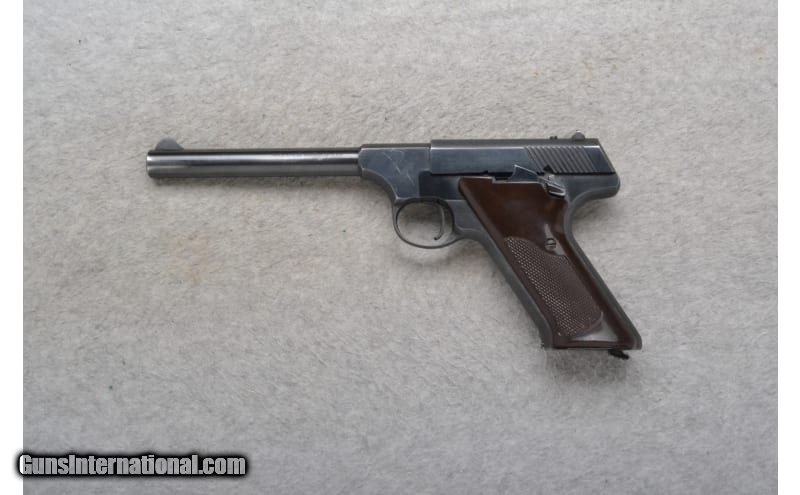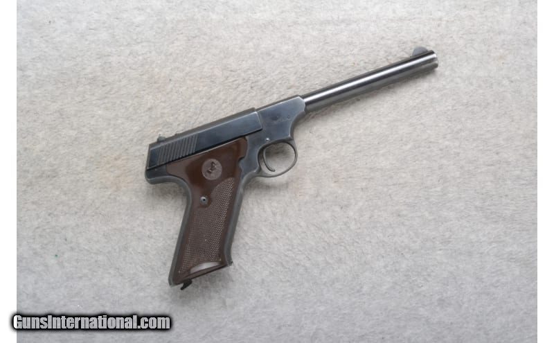 Description: This Colt Automatic Model Challenger is a semi-auto pistol in .22 Long Rifle Cal. It has a 6 inch barrel with a rear serrated slide. A blade front sight and notch rear sight. The grip is a checkered brown hard plastic. The trigger is grooved. S/N 75056-C .22 Long Rifle SOLD Chambers: 10 round magazine. Metal Condition: Good. Has some minor scratches and minor blue wear. Bore Condition: Very good. Barrels: 6 inch barrel with a rear serrated slide. Triggers: Grooved. Weight: 32 oz. Sights: Blade front. Notch rear. Item Location: Richfield, WI |