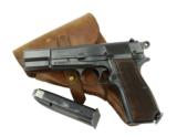 Browning Hi Power 9mm Para caliber pistol. Danish Military Issue Hi-Power. These were made by Fabrique Nationale just after WWII. Left side of frame is marked 1946 (manufacture date) crown over HV, Danish property mark. Bore is perfect. Gun has 98% original blue with only some light high edge wear. Grips are excellent. Comes with original issue Danish holster with crown over HV Danish property mark. Holster has the original extra magazine. Condition is very good plus with only minor light handling marks. Comes with cleaning rod on holster. Hard to find gun. Some of these were seen for sale several years ago but none have been seen for sale since then. Excellent scarce Hi-Power with holster, cleaning rod and extra magazine.