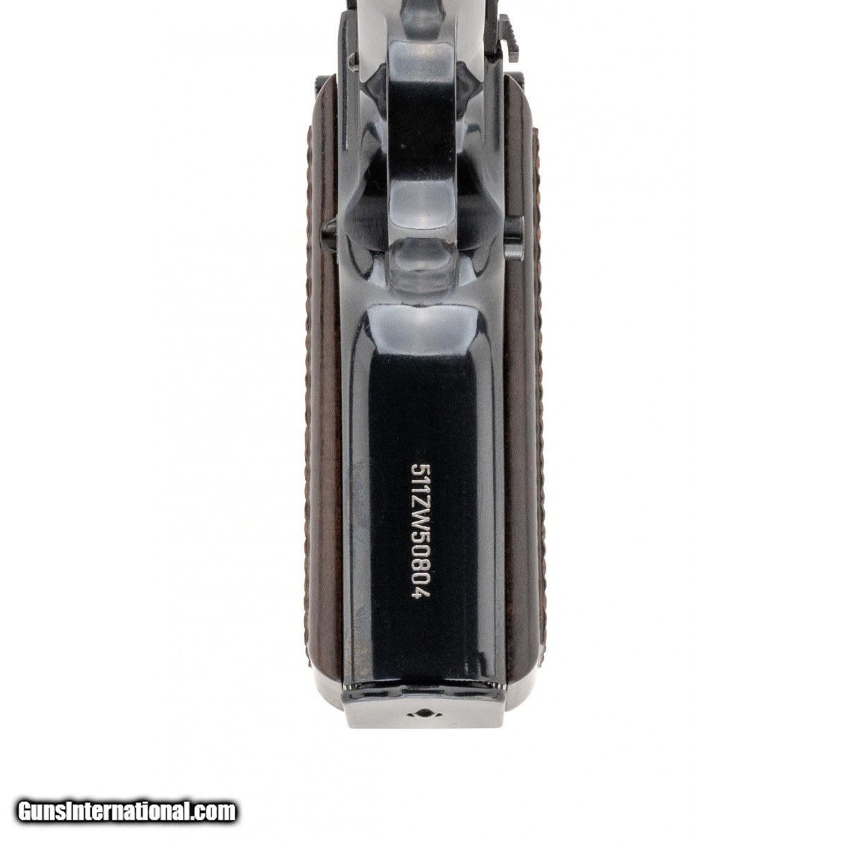 SN:511ZW50804. Modern production, 9x19mm parabellum with a 4.75"" barrel, Bore is in excellent condition. Full size frame with diamond wood grips, ambidextrous safety, 3-dot sight and blued finish. Overall condition is excellent. Comes with box. Consignment.