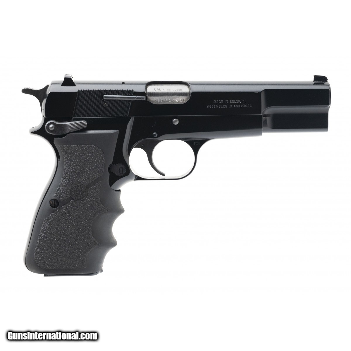 Description: " SN: 245NM34830. Made in 1990. 9mm with a 4.7"" barrel. Bore is excellent. Belgian made pistol with original black finish and Hogue rubber grips. Overall condition is excellent. SOLD |
