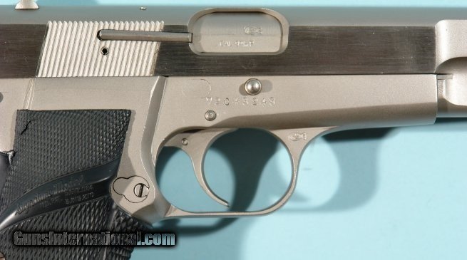 Description: 1972 BELGIUM BROWNING HI-POWER OR HI POWER 9MM BRUSHED NICKEL 9MM PISTOL WITH 6 MAGS. Serial number "72C432XX". Two line "Browning Arms Company St. Louis Mo. & Montreal P.Q./ Made in Belgium" address on left slide with Liege proofs opposite (and on barrel) and having "O.D.IN. Alex, VA" import mark near mag well. Aftermarket brushed nickel finish with polished slide flats. Professionally done as these did not come nickel in the '70's. NO signs of use or wear. Factory sights. Pachmayr wrap around rubber grips(front and back straps). Comes with 6 brand new brushed nickel magazines appear all to be Browning. SOLD |