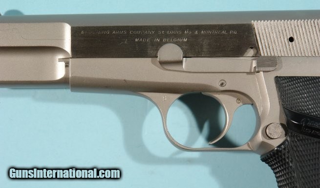 Description: 1972 BELGIUM BROWNING HI-POWER OR HI POWER 9MM BRUSHED NICKEL 9MM PISTOL WITH 6 MAGS. Serial number "72C432XX". Two line "Browning Arms Company St. Louis Mo. & Montreal P.Q./ Made in Belgium" address on left slide with Liege proofs opposite (and on barrel) and having "O.D.IN. Alex, VA" import mark near mag well. Aftermarket brushed nickel finish with polished slide flats. Professionally done as these did not come nickel in the '70's. NO signs of use or wear. Factory sights. Pachmayr wrap around rubber grips(front and back straps). Comes with 6 brand new brushed nickel magazines appear all to be Browning. SOLD |