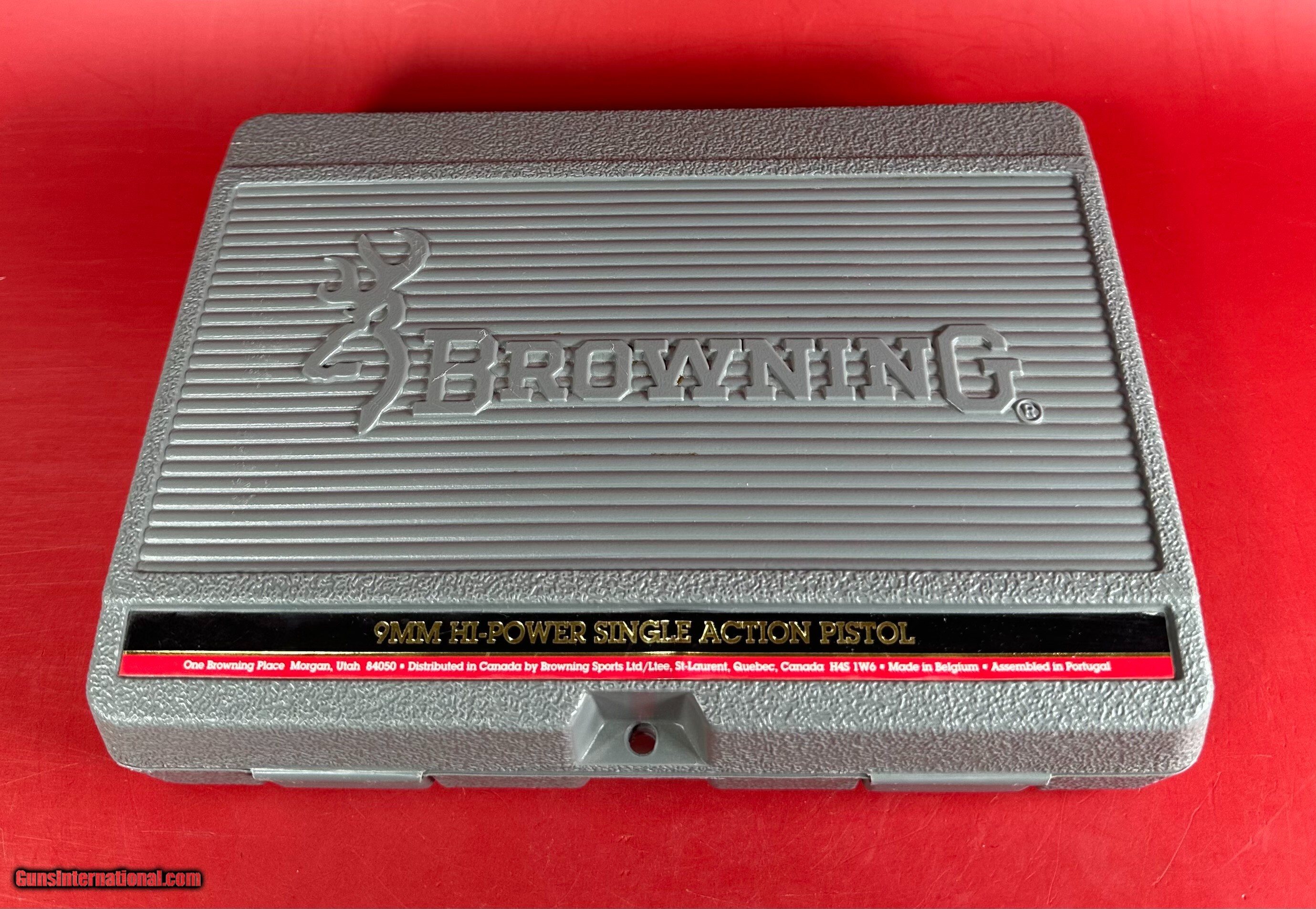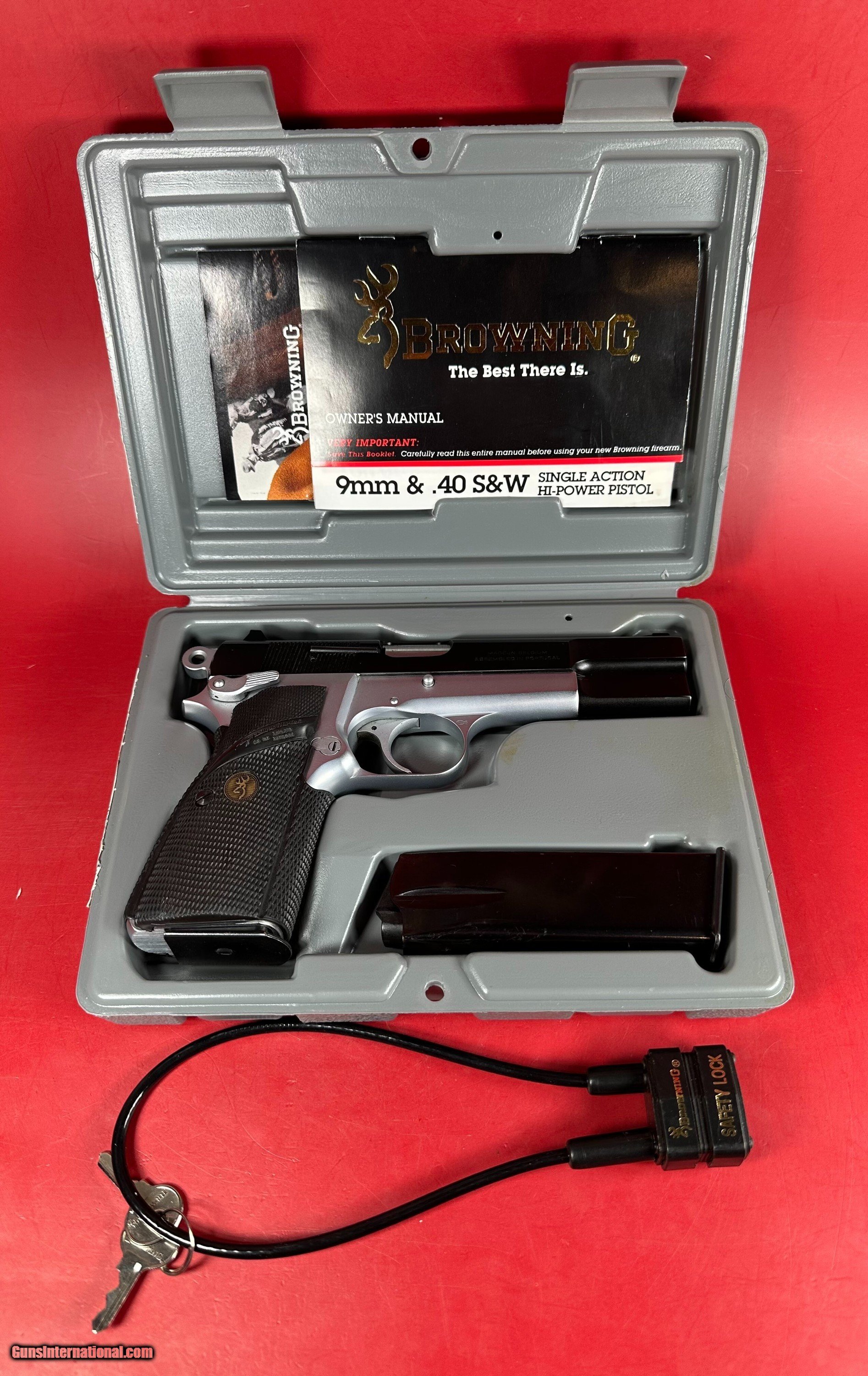 Description: LNIB 1994 Belgium made Browning Hi Power (Hi-Power, High Power). John Browning’s finest creation. Frame: Matte Silver Chrome finish. Slide: Black. 4.7" barrel. Excellent condition. Metal is 99%. Barrel excellent. Wrap around grips with Browning medallions are excellent. Sale includes two original 13rd magazines, Browning safety lock, paperwork and original hard case, serialized to the gun. Great addition to any collection. Features include :