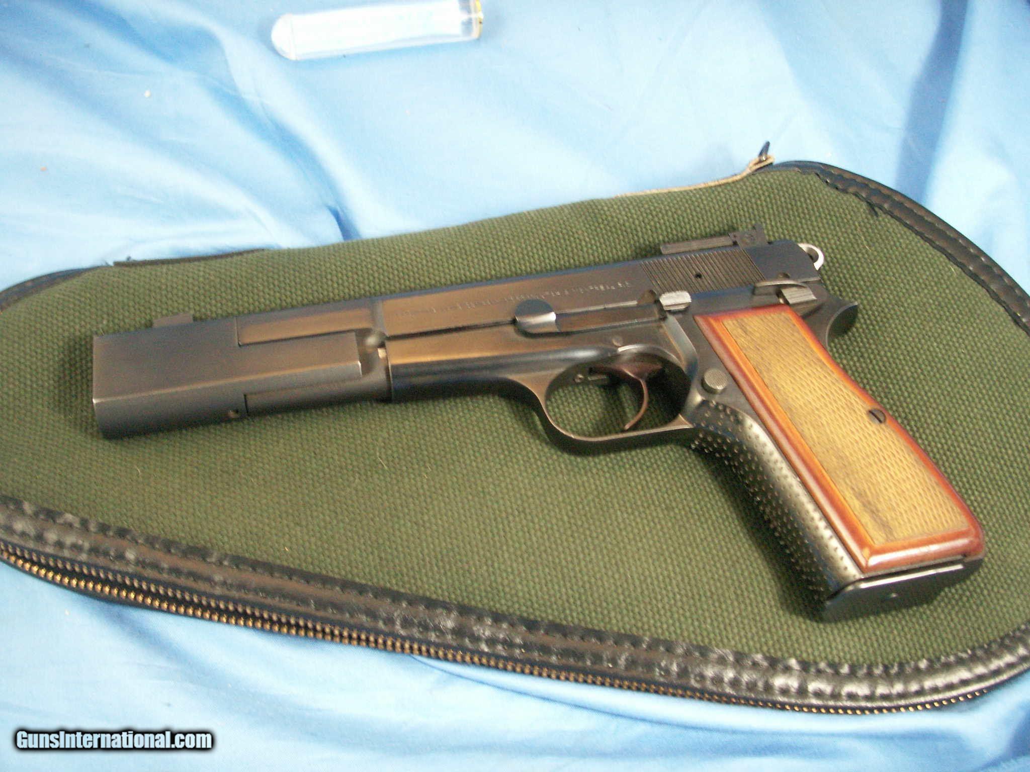 Description: SOLD PENDING FUNDS: Browning Custom Hi-Power Target pistol with 1" longer BAR-STO barrel and ported extension. This 1985 Belgium produced Hi-Power was professionally enhanced for target shooting. It is in 9 mm caliber. The rear sight is a Bomar adjustable sight which has been very nicely milled into place and the front sight has been moved to the end of the ported extension piece for the maximum sighting plane. The action has been tuned and is flawless and crisp with zero trigger creep. The widened smooth trigger is a custom feature as well and is exceedingly comfortable along with a custom smaller ring hammer. The front and rear grip straps have been "stippled" and provide an excellent surface for gripping. The grips and magazine are original and the bore and mechanics are perfect. The gun is in excellent condition and are rated at 98%. This comes in a Browning fleece lined pistol rug. If you are looking for a unique one of a kind Hi-Power that is the ultimate target shooting variation then look no further. The custom features and pistol would cost in excess of $3000 to duplicate. A great unique piece to enhance any collection. SOLD |