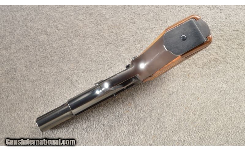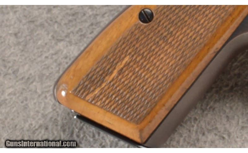 Description: Belgium Browning Hi Power semi-automatic 9 mm pistol. This pistol features a high polished blue finish, 13+1 capacity. This C-Series Hi Power was produced in 1976 and remains in very good condition. The bore is bright and shiny. The grips are two-piece checkered walnut. The right walnut grip has a scratch in it, but the rest of the checkering remains well-defined. The deep blue finish does have light holster wear at the front of the gun. The front sight is a half-round blade fixed to the slide. The rear sight is a flat topped square notch sight dovetailed into the slide. 9mm Luger SOLD Chambers: Semi auto. Metal Condition: 98% with light broken edges from holster wear. Wood Condition: Scratch in the right grip. There are no chips or cracks. Bore Condition: Bright bore with great rifling. Barrels: 4.5" barrel. Triggers: Single action trigger. Sights: "Fixed front, notched rear. Item Location: Owatonna, MN |