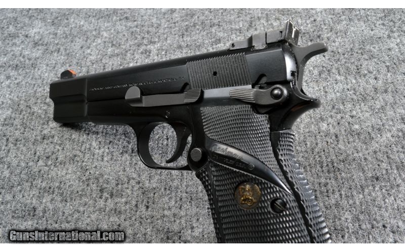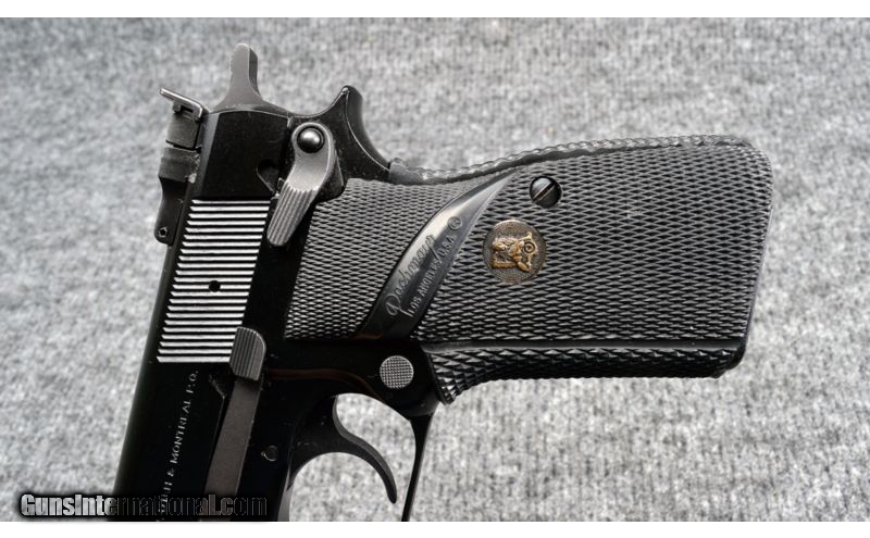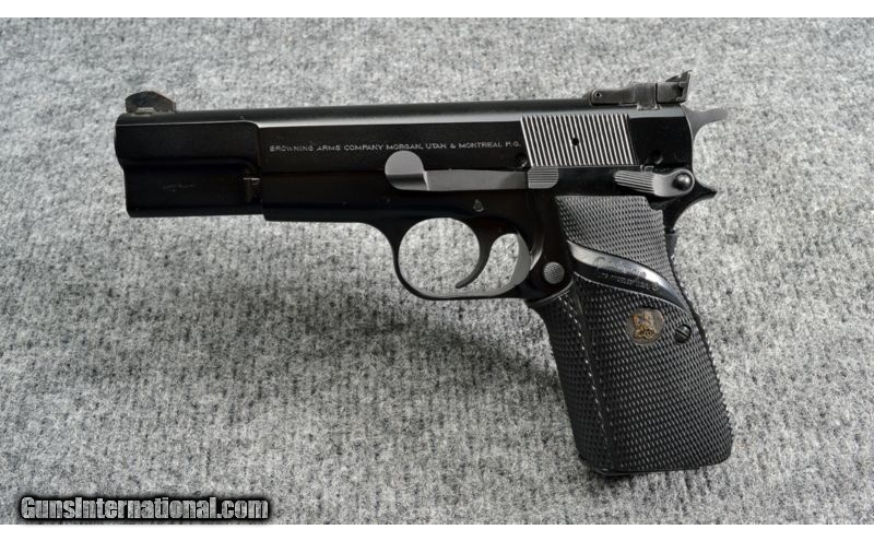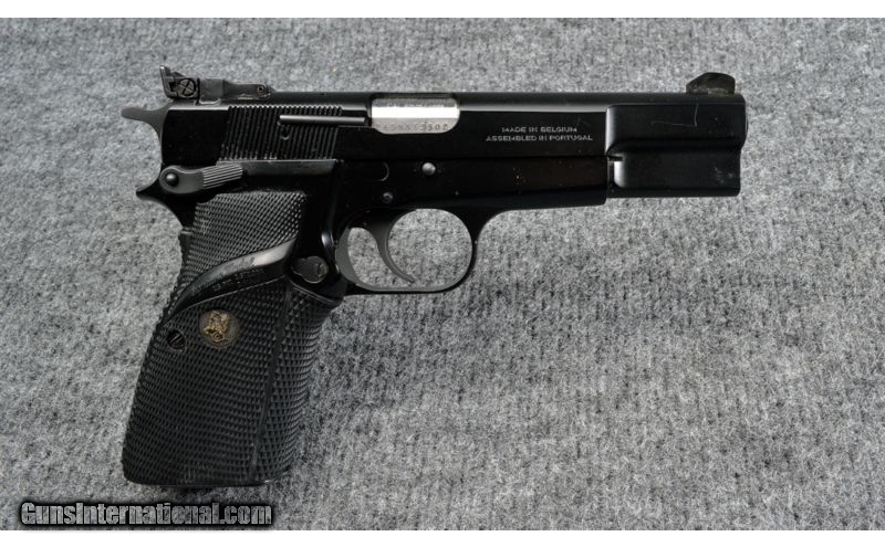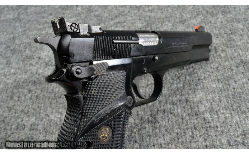 Description: This Browning Model "Hi-Power" classic semi-automatic pistol comes in 9mm and has a 4.5 inch stainless steel barrel. It has an adjustable rear sight and Pachmayr Signature Model checked rubber grips. One 14 round magazine. SOLD Manufacturer: Made in Belgium Caliber Info: 9mm Luger Chambers: Semi-auto Metal Condition: Excellent- a couple marks on the front of the slide Bore Condition: Excellent, clean with sharp rifling Barrels: 4.5 inch Triggers: Single action Butt Pad: Pachmayr Signature Model checkered black rubber wraparound grips Weight: 35 oz Sights: Orange ramp front, adjustable target rear with white notch Item Location: Gainesville, VA |