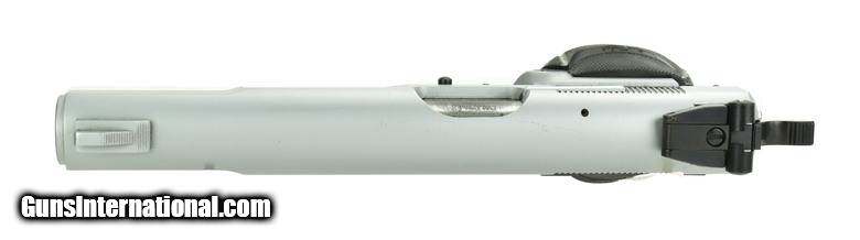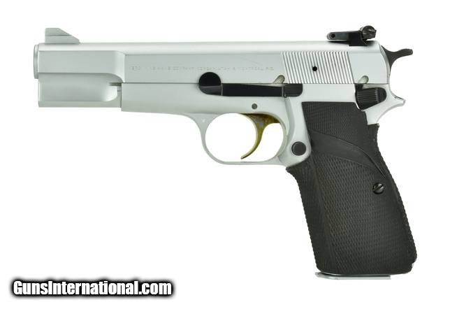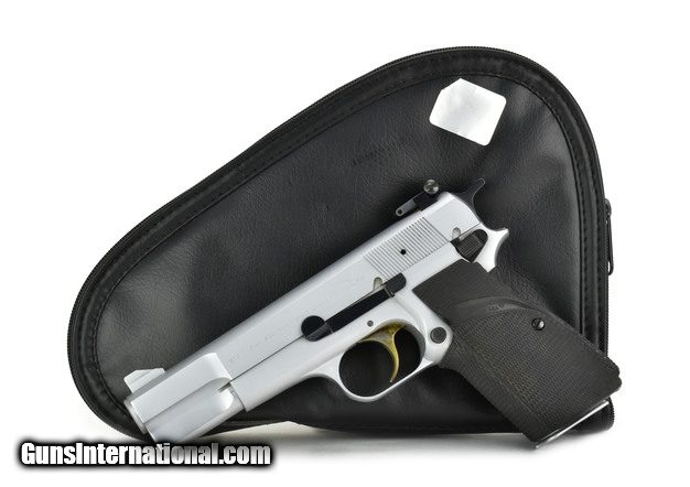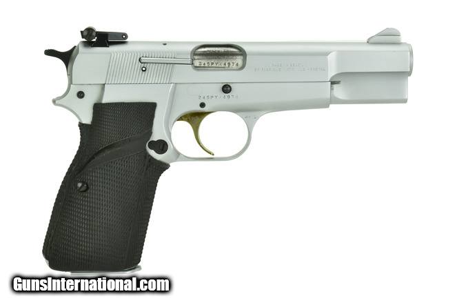 Description: Browning Hi Power 9mm caliber pistol. Original Belgian made gun with silver chrome finish and adjustable sights. Excellent condition with pouch.