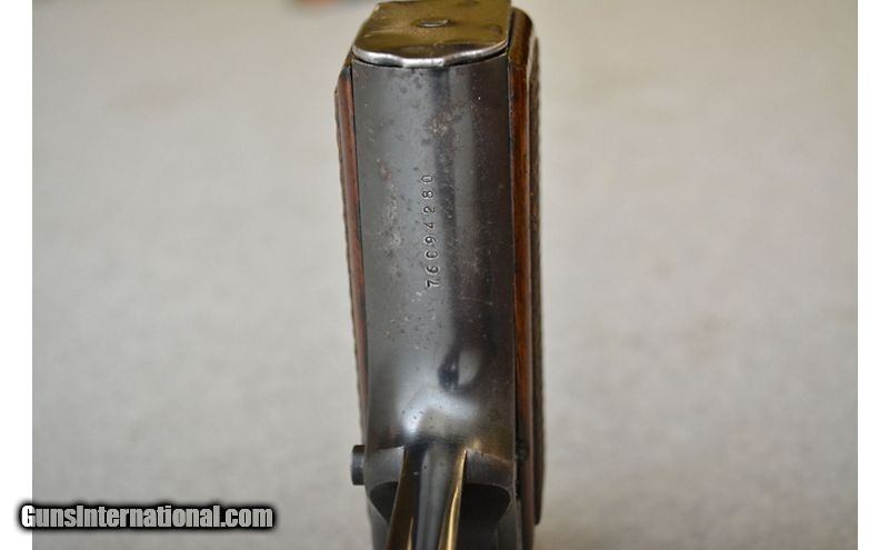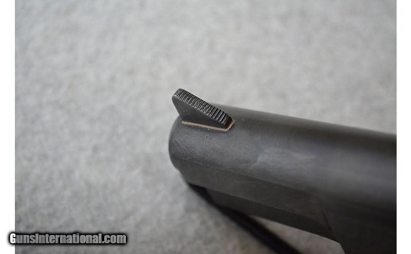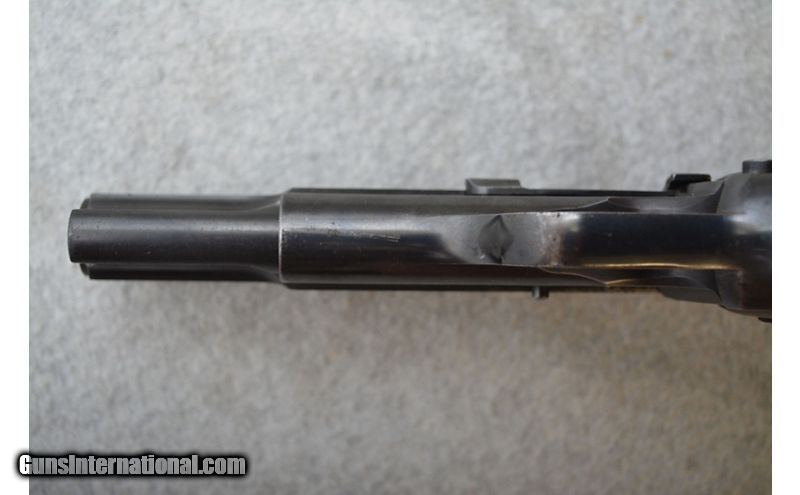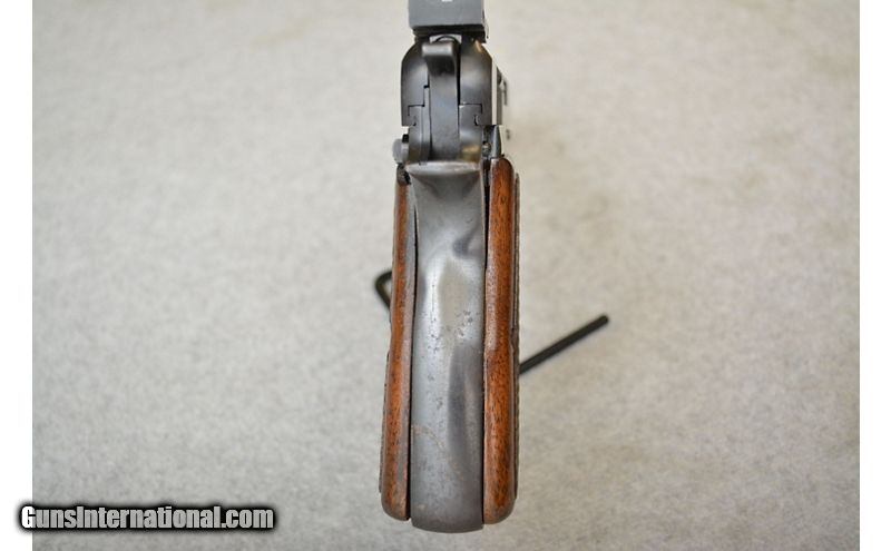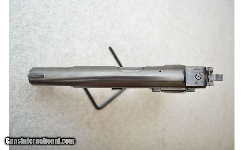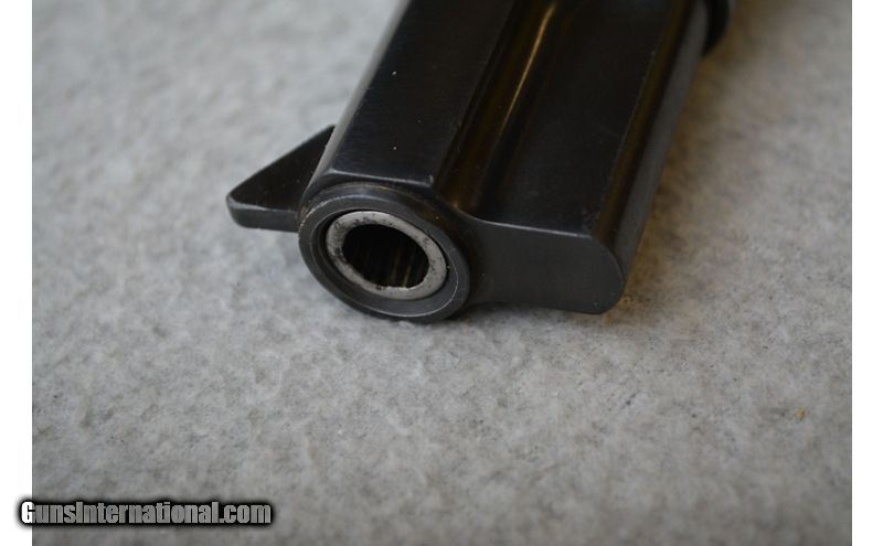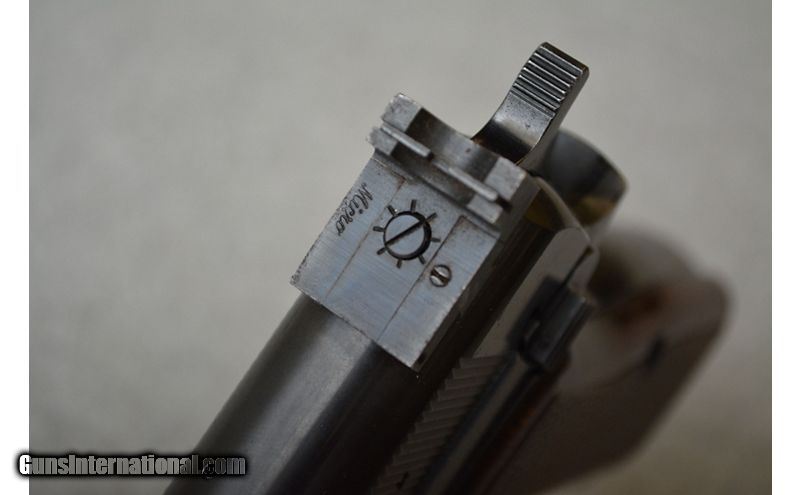 Description: Good shape overall. The pistol has had some work done by a previous owner. The sights are more than likely not original to the firearm and there is evidence of the brazing used to attach the front blade. Moderate finish wear to the front and rear straps of the grips, thinned finish on the edges, and a few light specks of inactive surface pitting round out the damage to the metal. Grips show signs of handling but the majority of the finish and checkering is still intact. The left grip panel is bowed out slightly and is a little loose. A single magazine is included. 9mm Luger SOLD Chambers: Semiautomatic fed from detachable magazines. Metal Condition: Good. Wood Condition: Grips are in good condition. Bore Condition: Very good. Healthy shine and good amount of rifling left but there's some stubborn copper fouling near the muzzle and it looks like there is some erosion of the barrel throat. Barrels: 4½" Stainless steel. Triggers: Blued metal with smooth face. Stock Dimensions: N/A Fore End: N/A Butt Pad: Checkered wood grip panels. Weight: 2LBS Sights: Fixed ramped front blade and adjustable rear notch. Chokes: N/A Item Location: Green Bay |